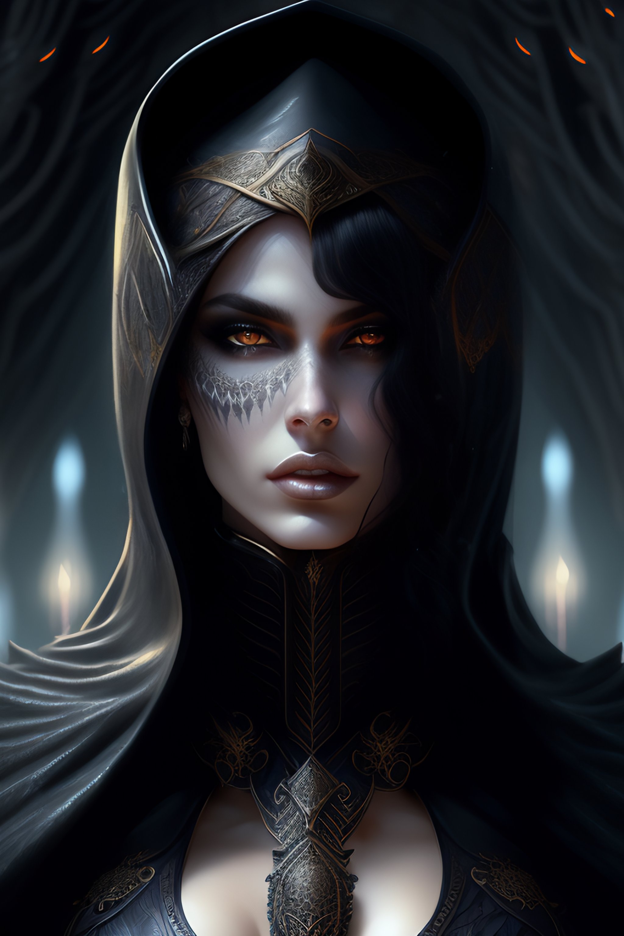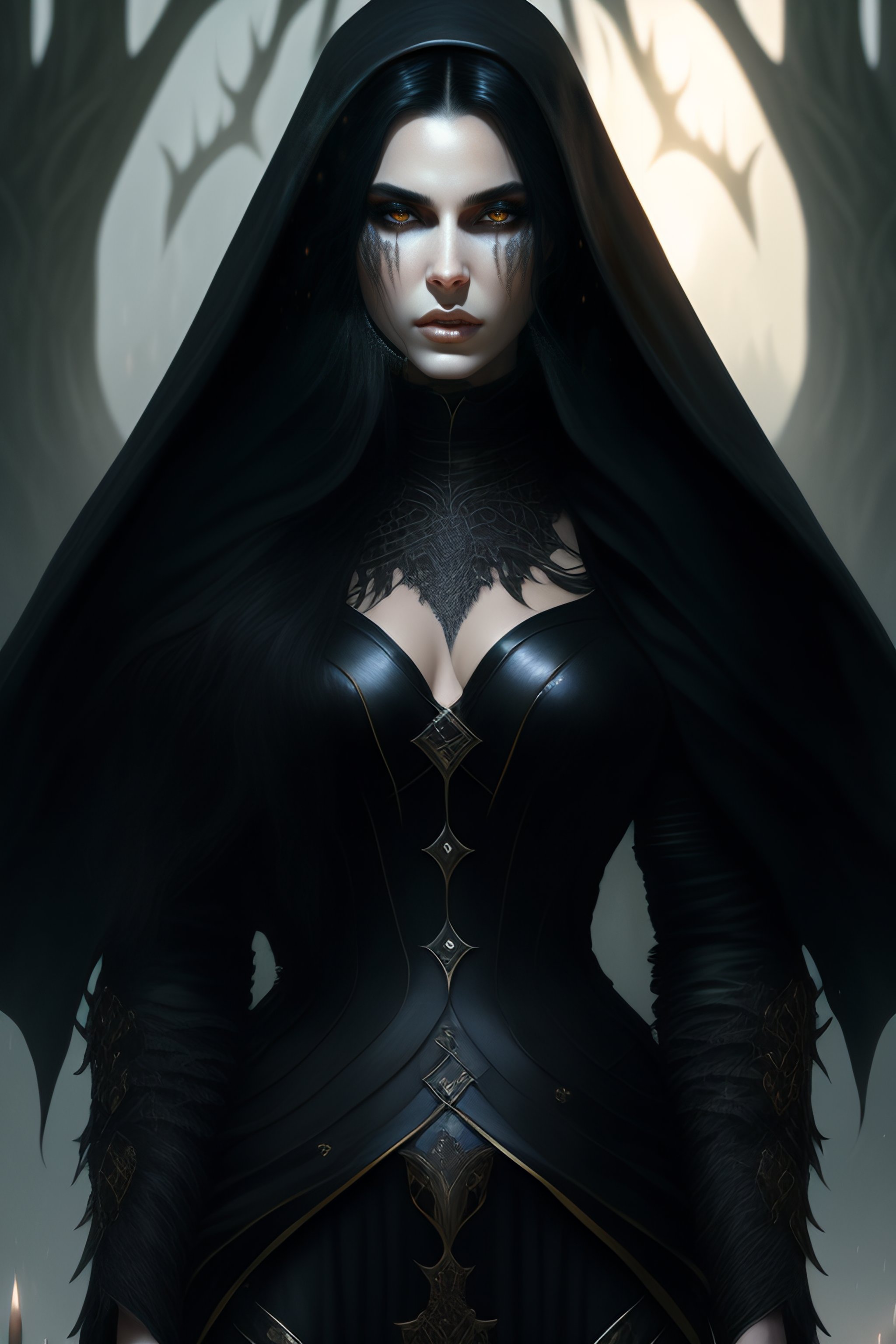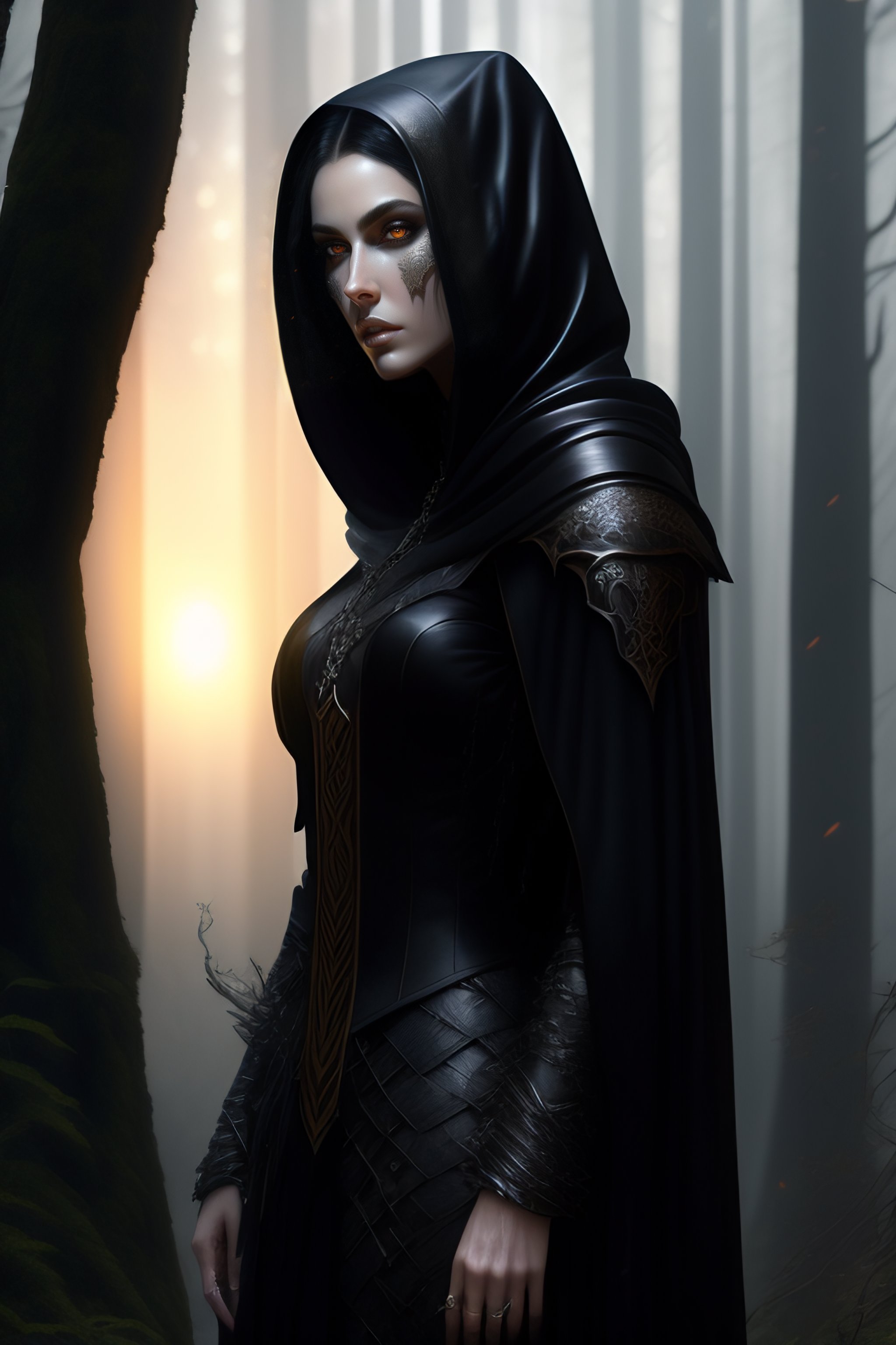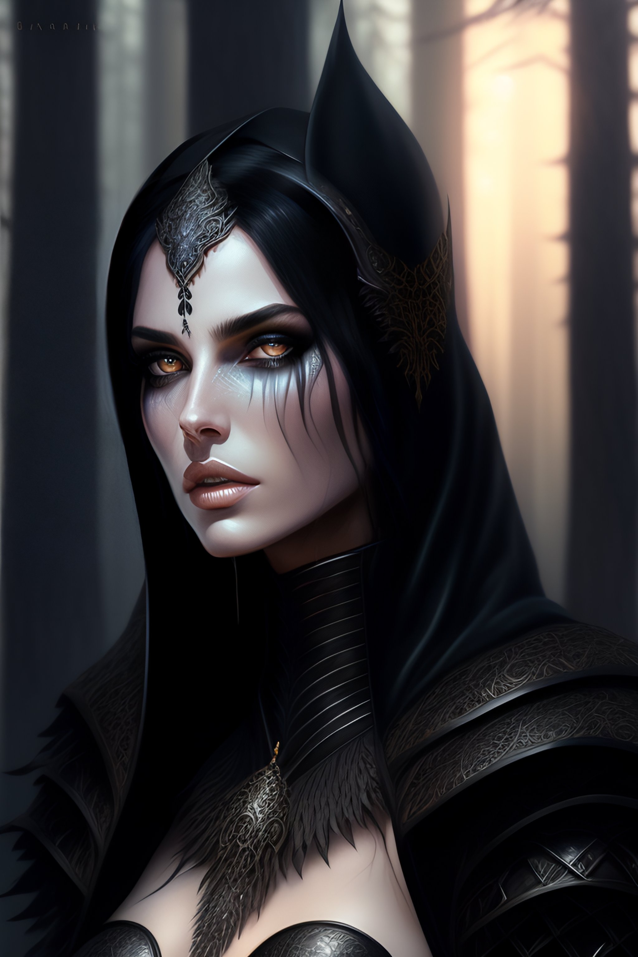 Intricate portrait of a horrifying pale assassin dusk elf, black hair, black eyes, fully covering black hooded armor, ravens, boney, eerie, intricate design, beautiful hot matrix girl in leathers, backlight, art by greg rutkowski, tom bagshaw, gloomy forest, art by h.r. giger, greg rutkowski