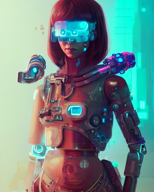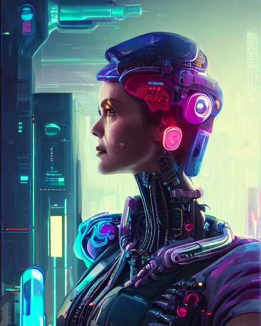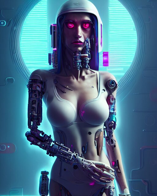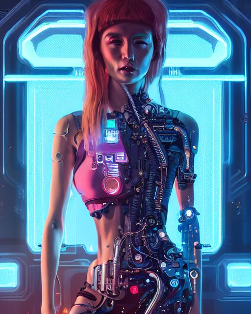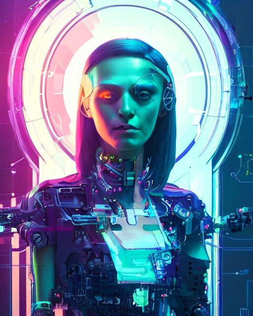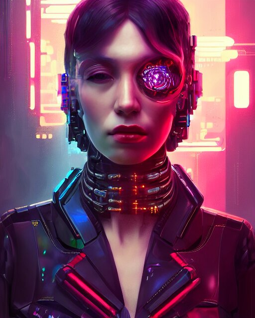 Portrait of agatha vega as a cyberpunk cyborg. sci - fi, missing panels, intricate abstract upper body intricate artwork, by tooth wu, wlop, beeple, dan mumford. concept art, octane render, deviantart, greg rutkowski, cinematic, key art, hyperrealism, iridescent accents