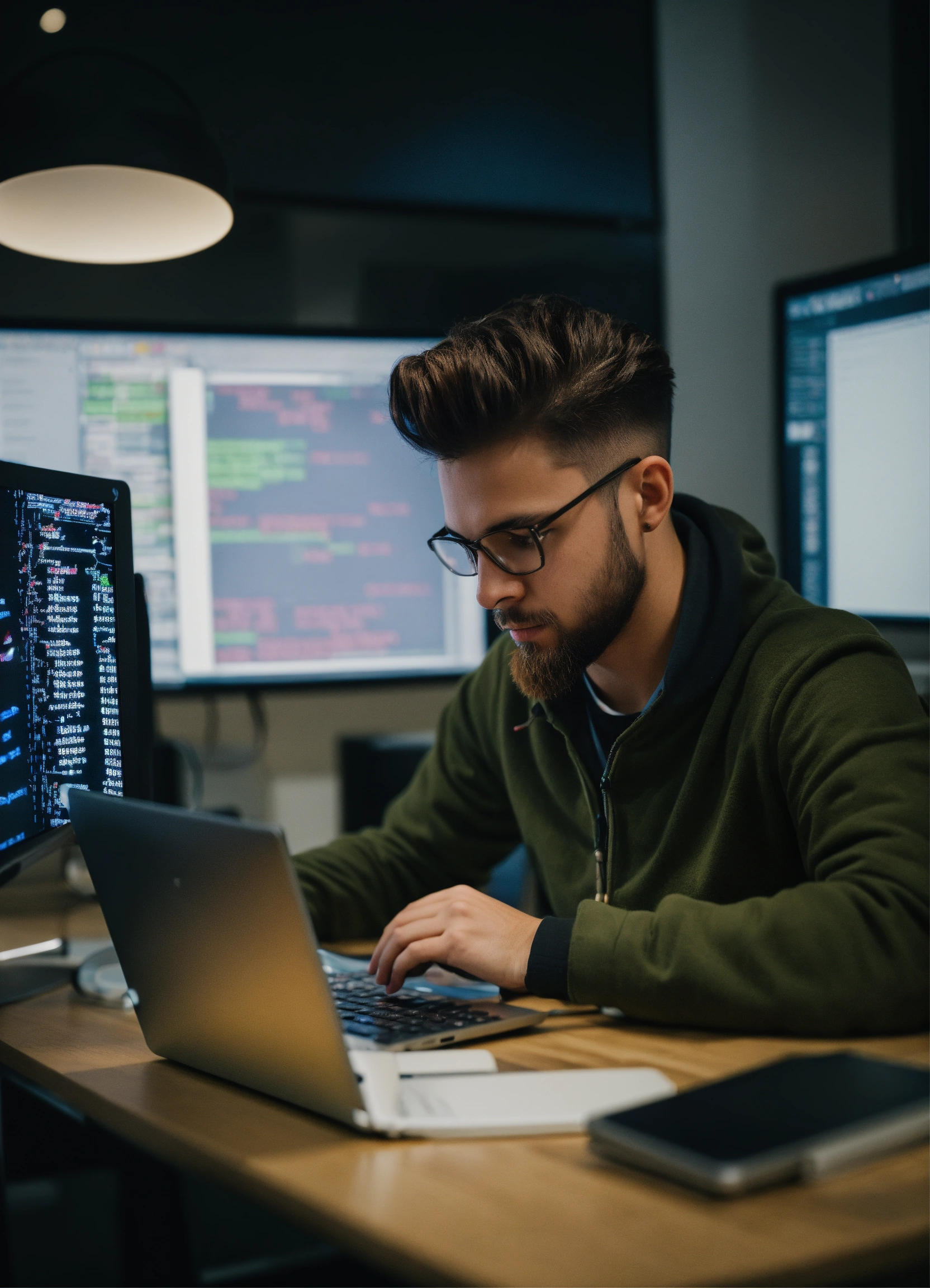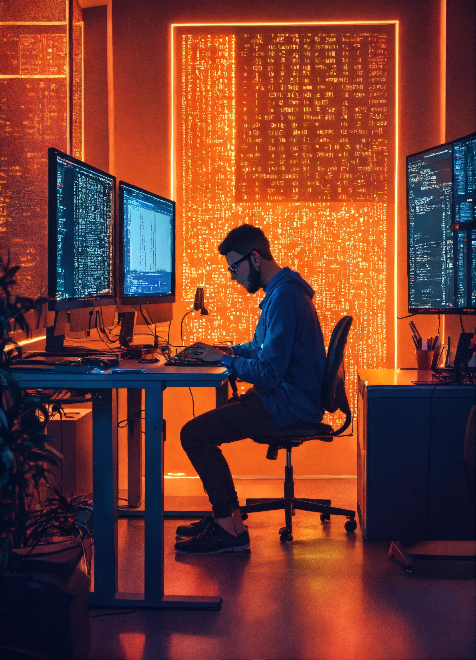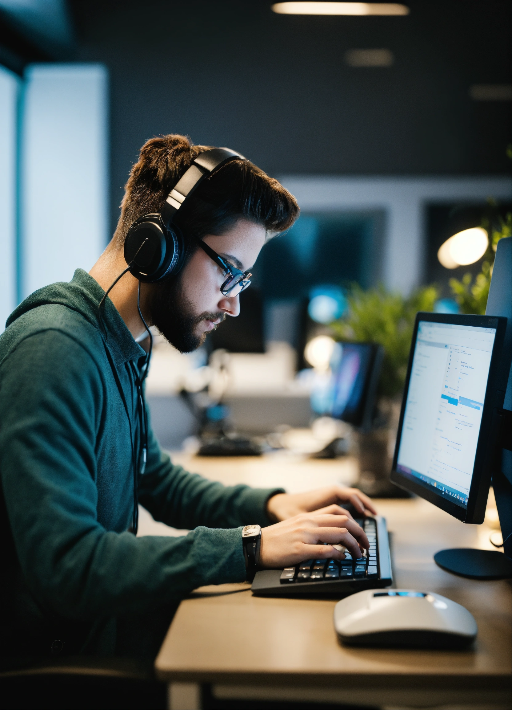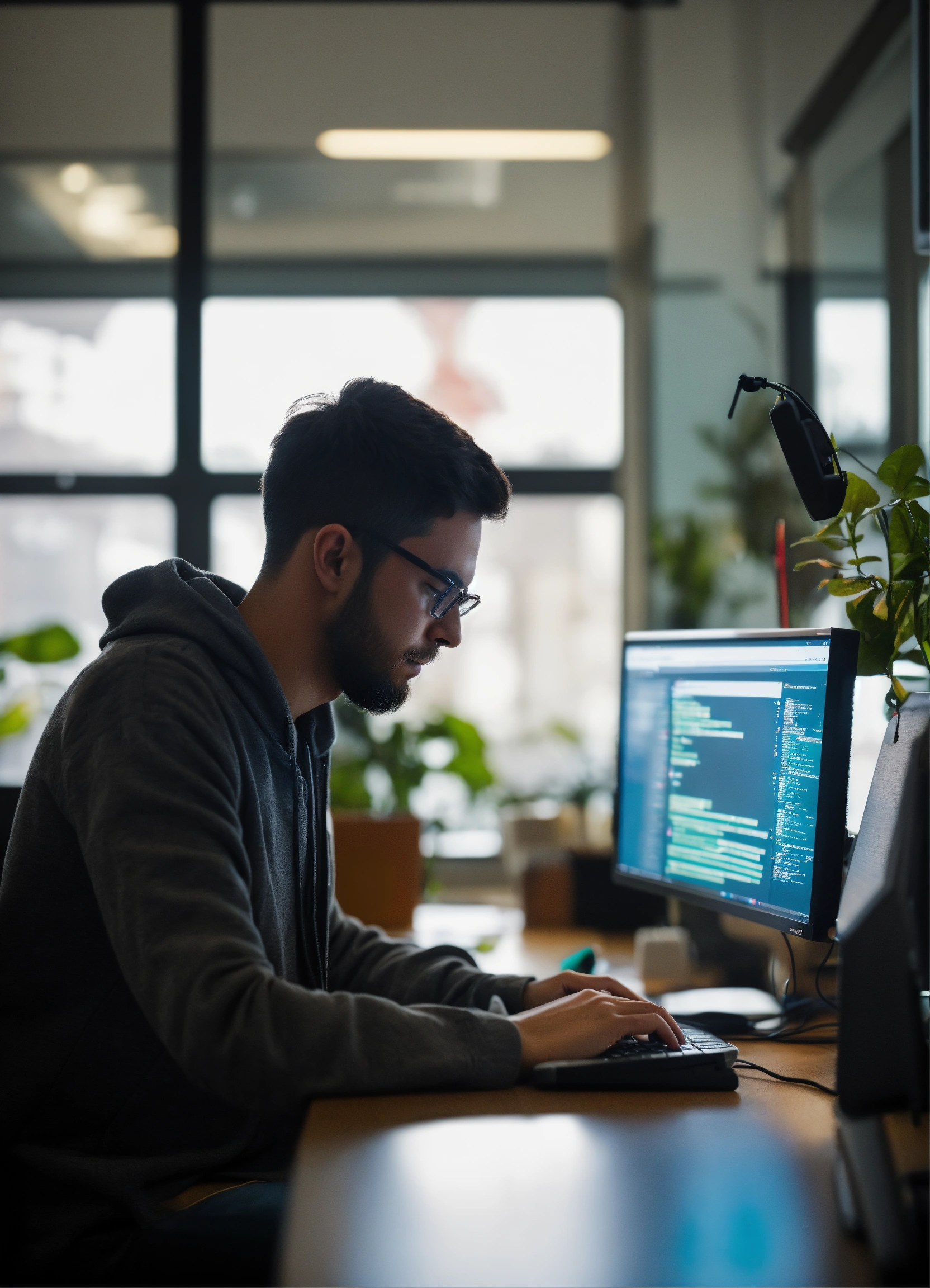 A photo of a computer programmer writing code on a computer, the programmer is working in a modern office