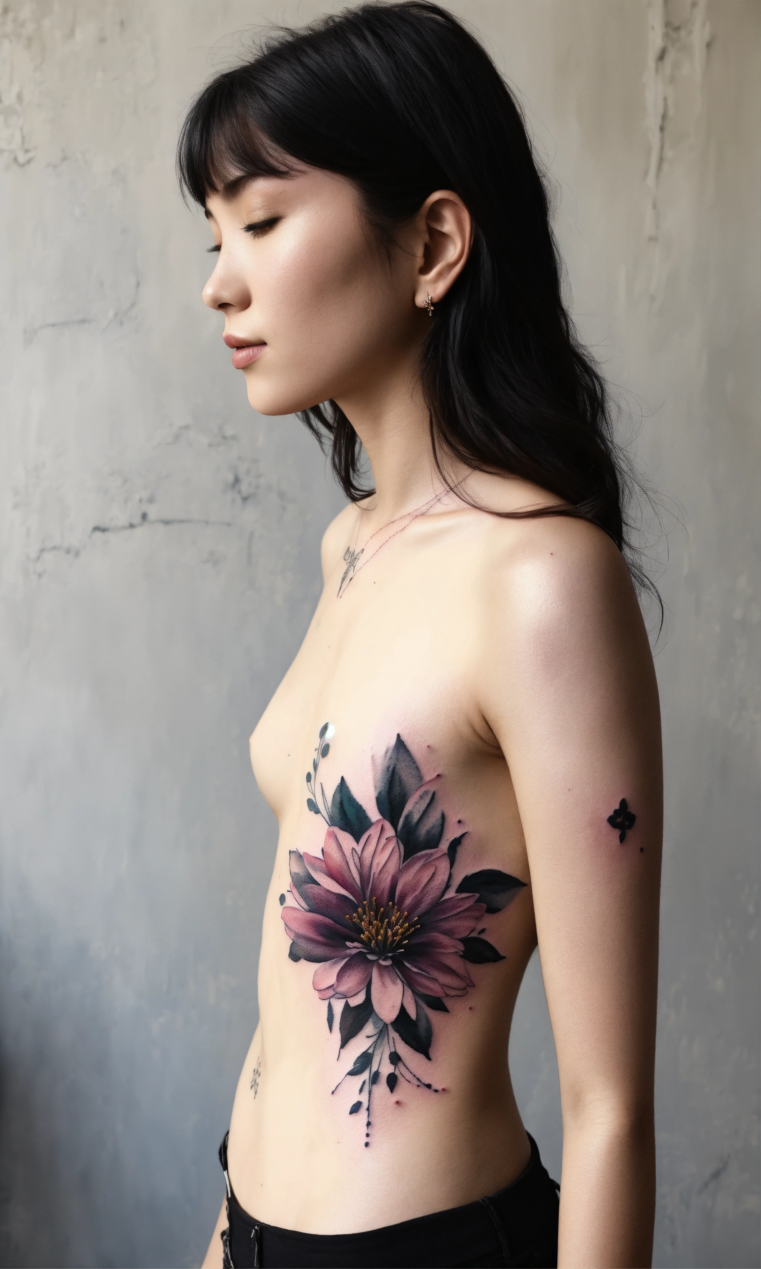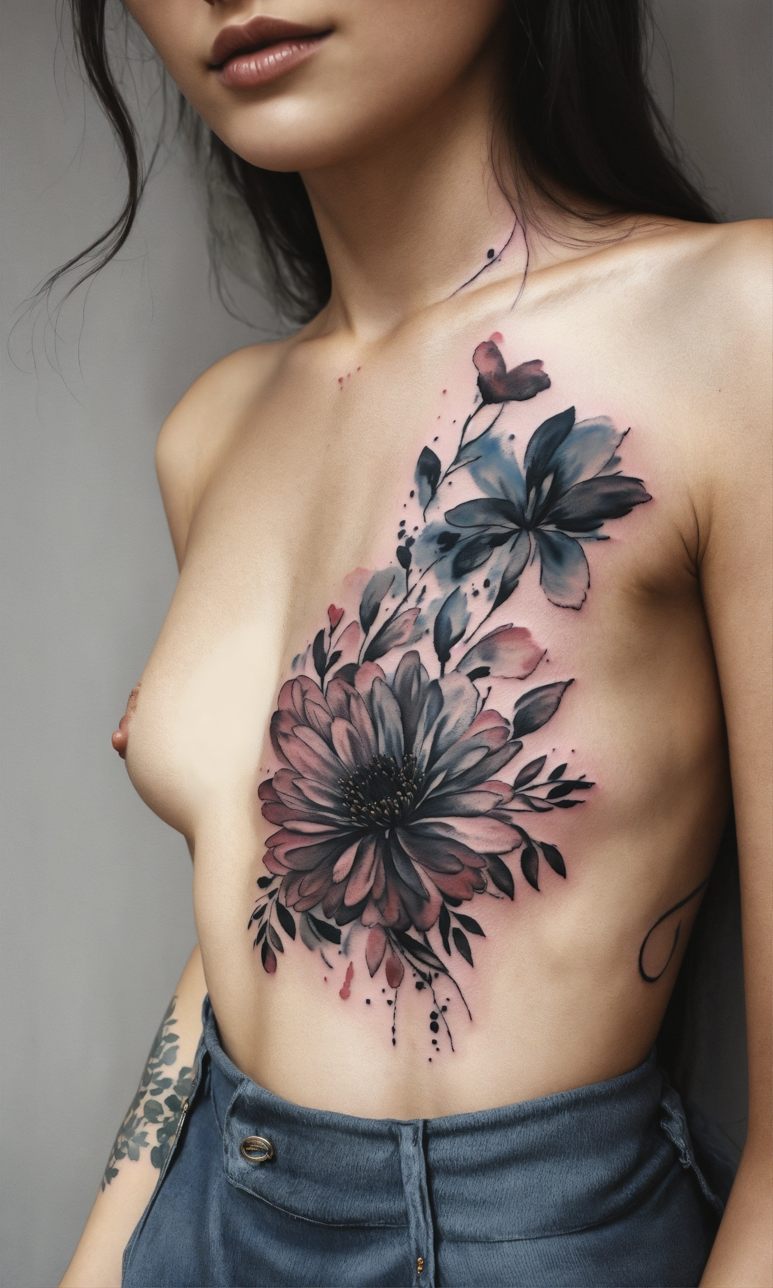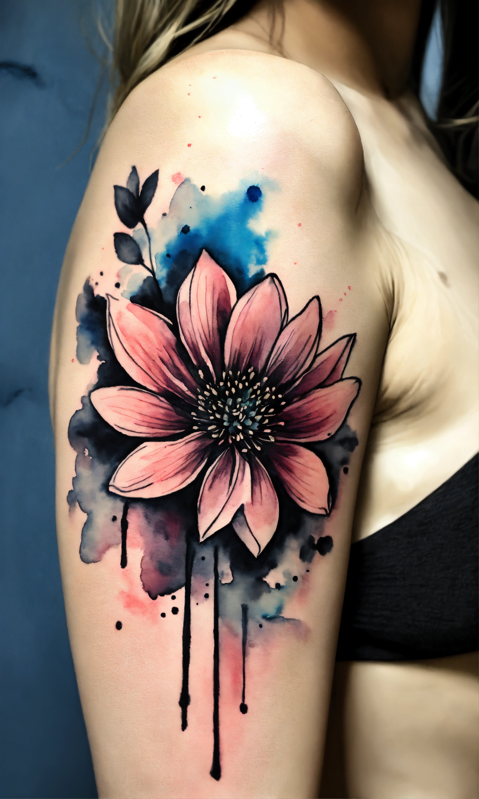 Black grey minimalist watercolor flower tattoo colors chest arm woman