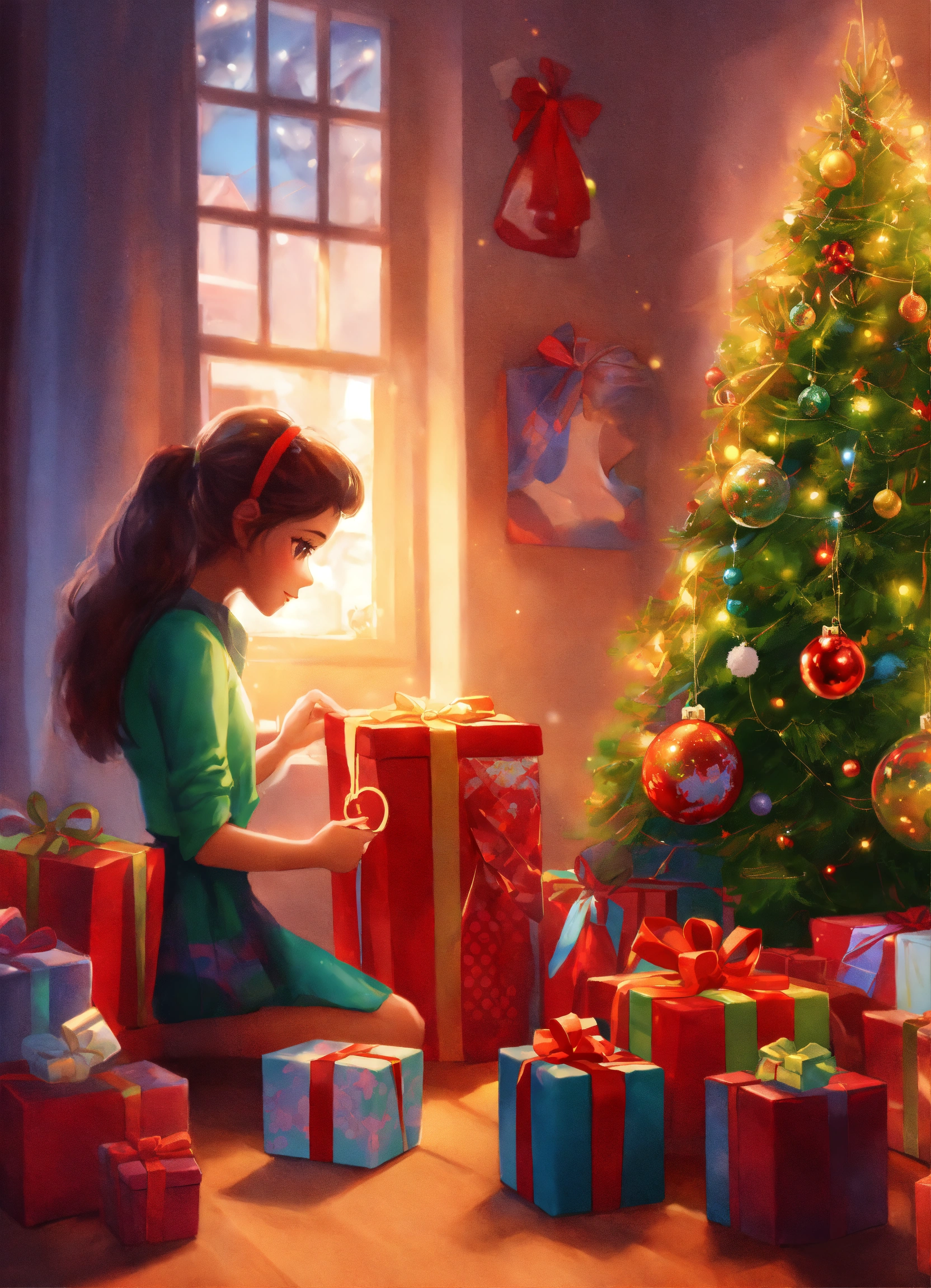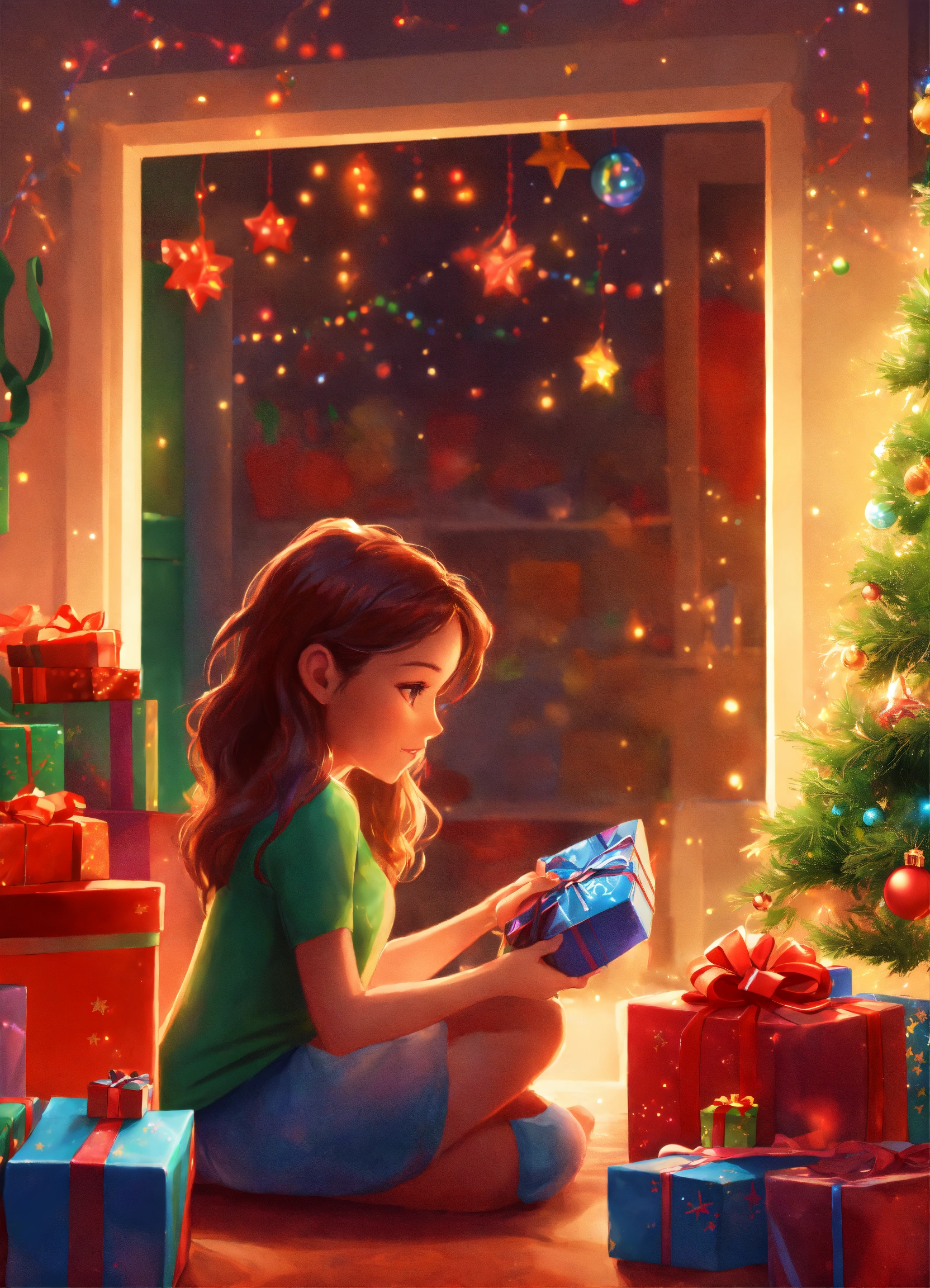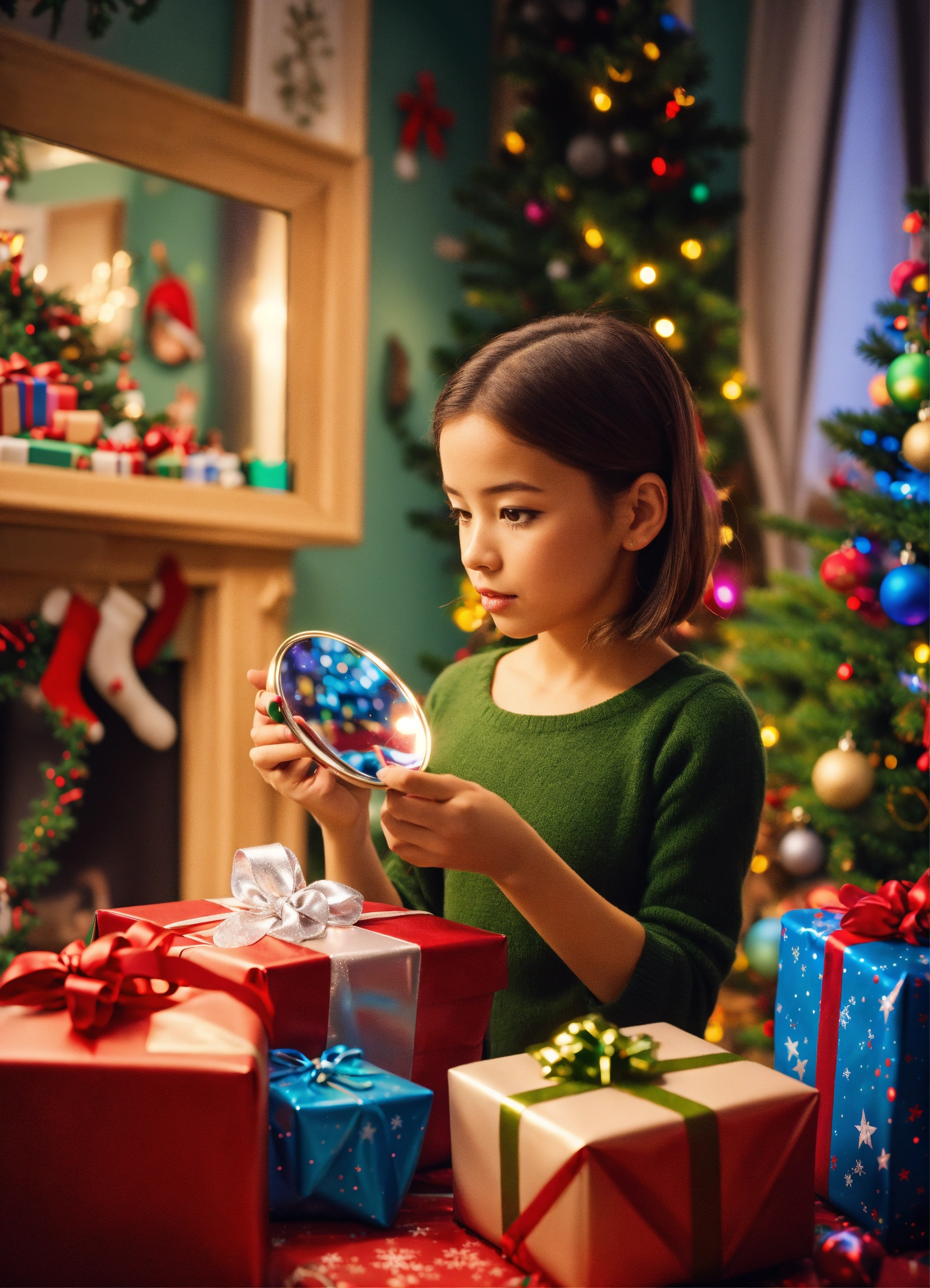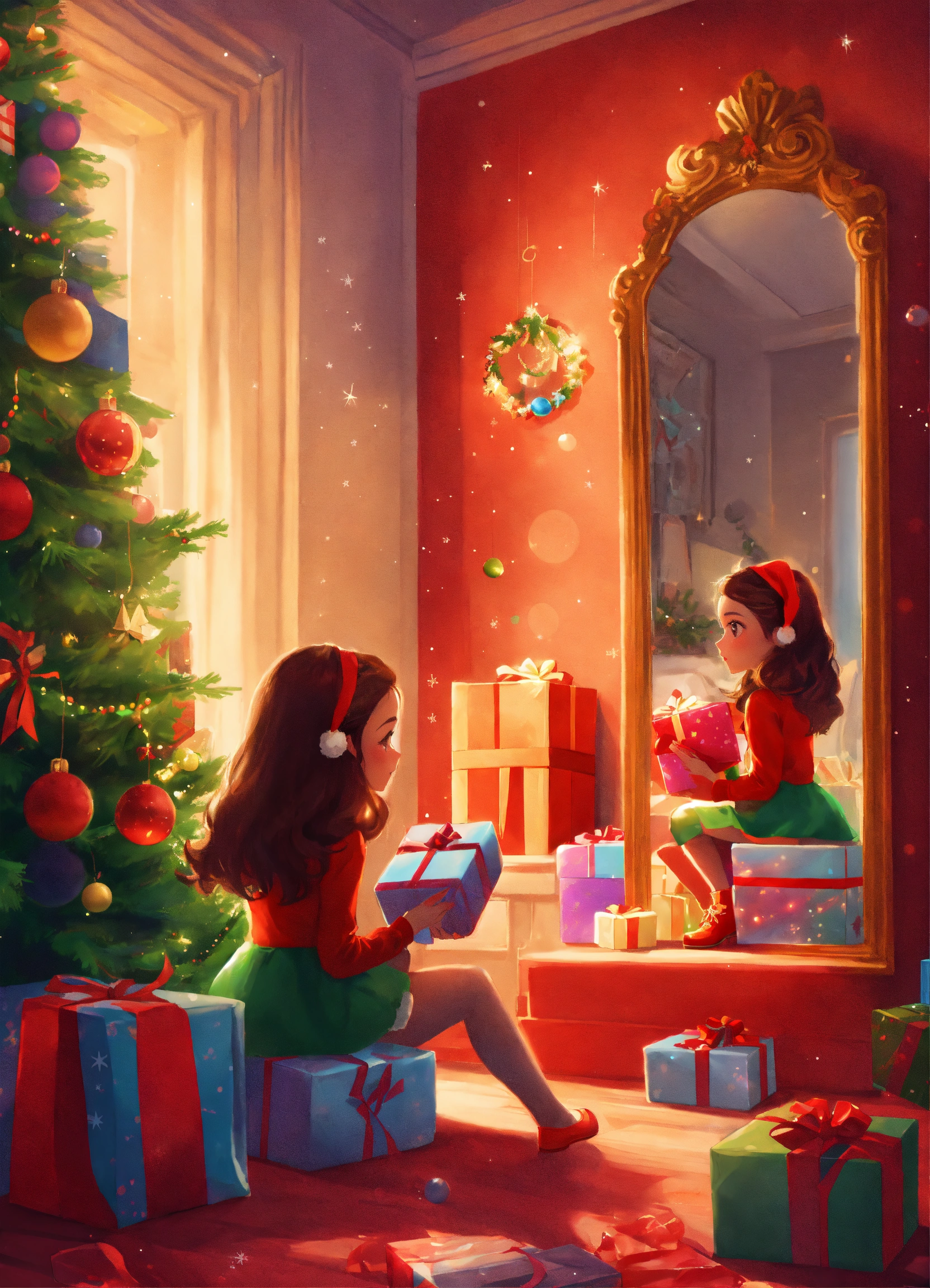 Pixar inspired mixed color girl looking into a mirror while opening a christmas presents with a christmas theme in the background