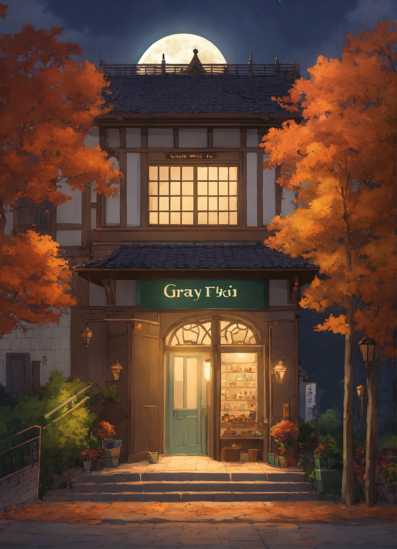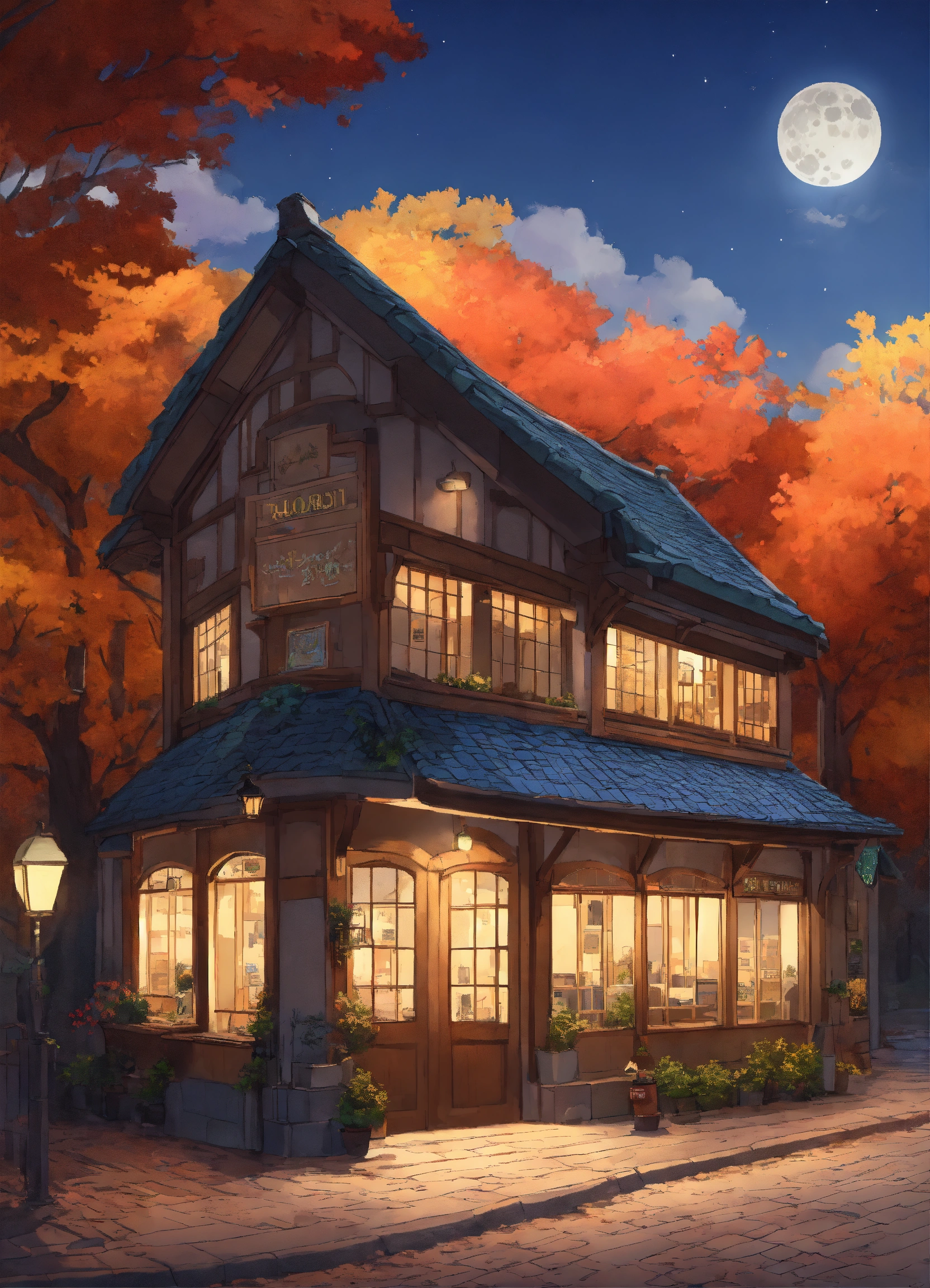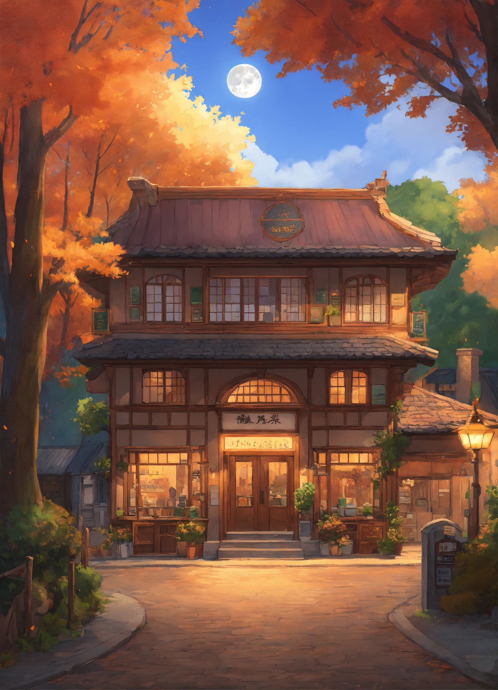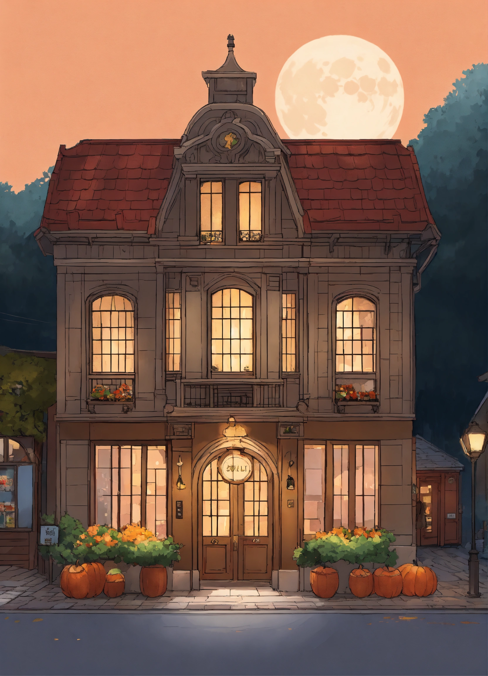 European building, forest around the building, shop sign above the entrance, wall color is skin tone, roof color is gray, tasteful, full moon in the sky, dusk, ghibli movie style illustration, autumn