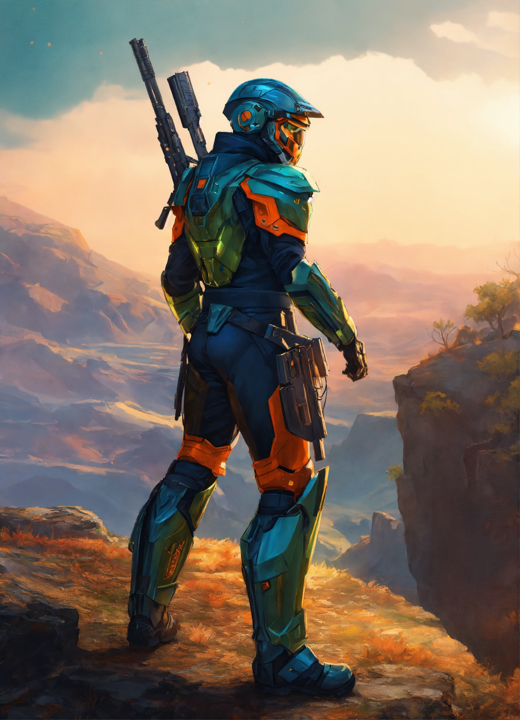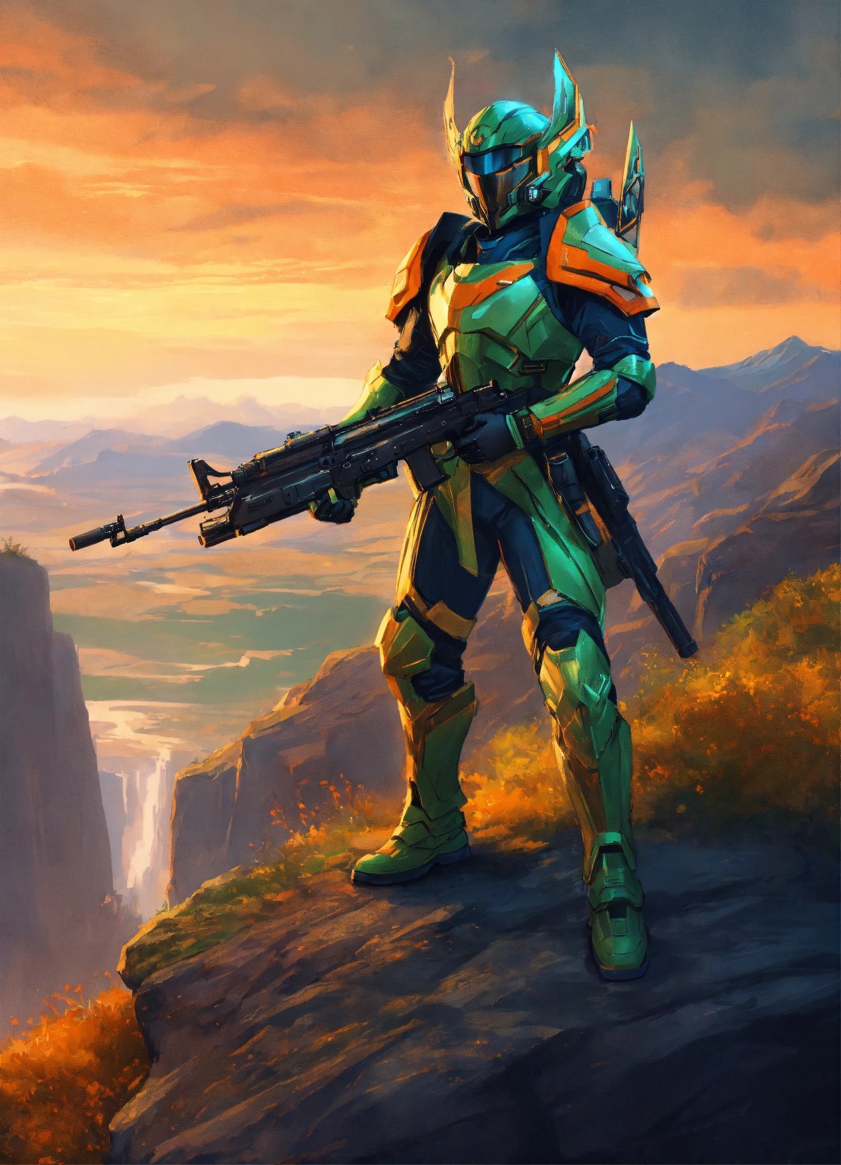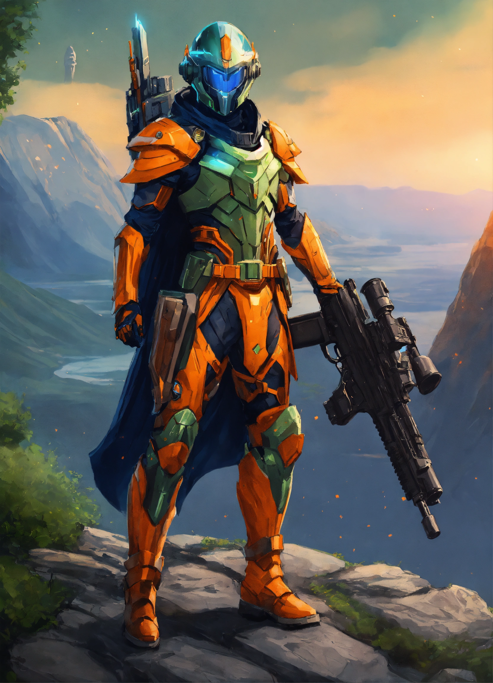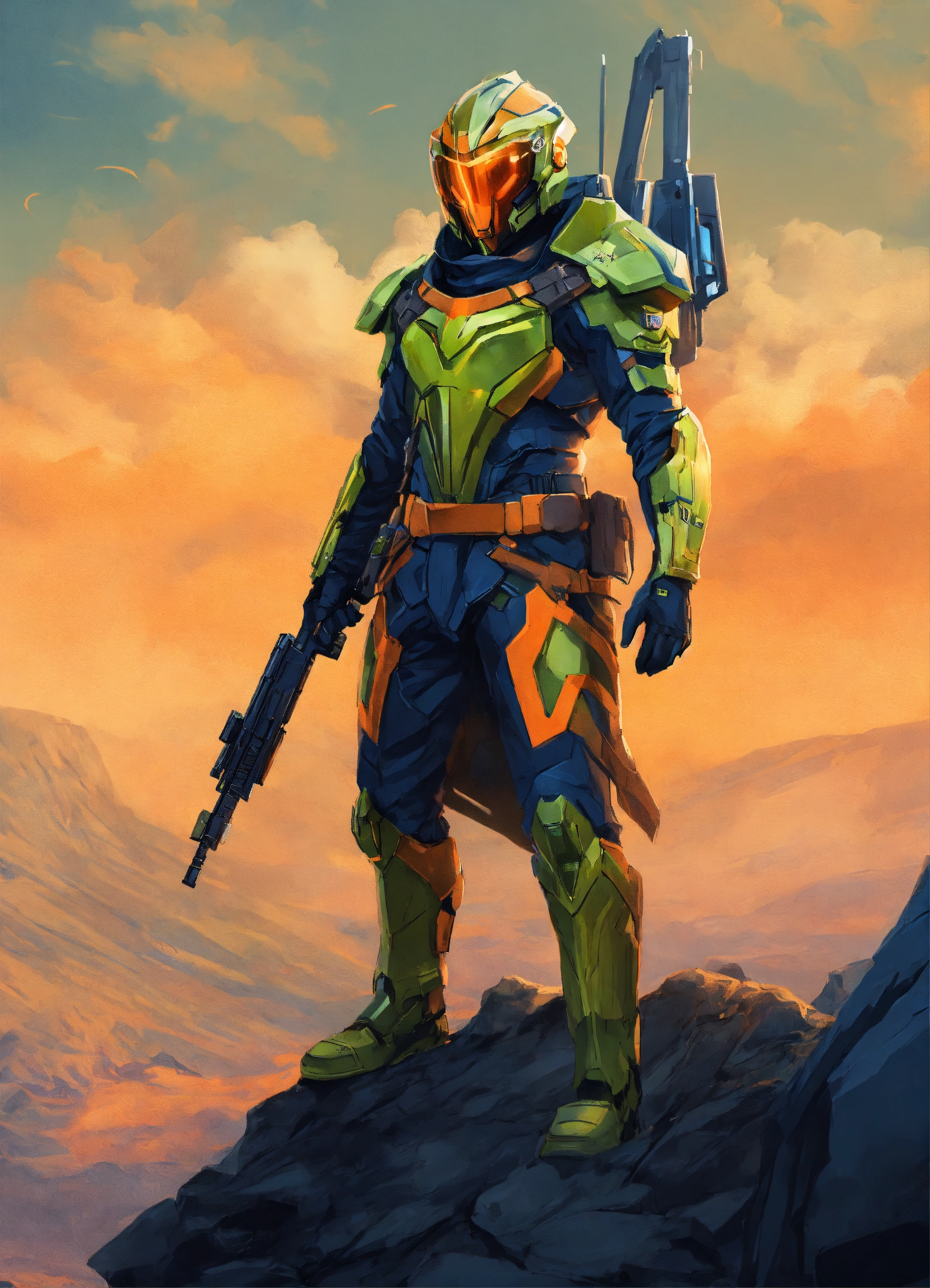 Epic drawing of a full body of a high elf sci fi soldier wearing sci fi armor, volt green and navy blue and orange sci fi armor and helmet, boots, male, posing with a machine gun with both hands, standing on a cliffside