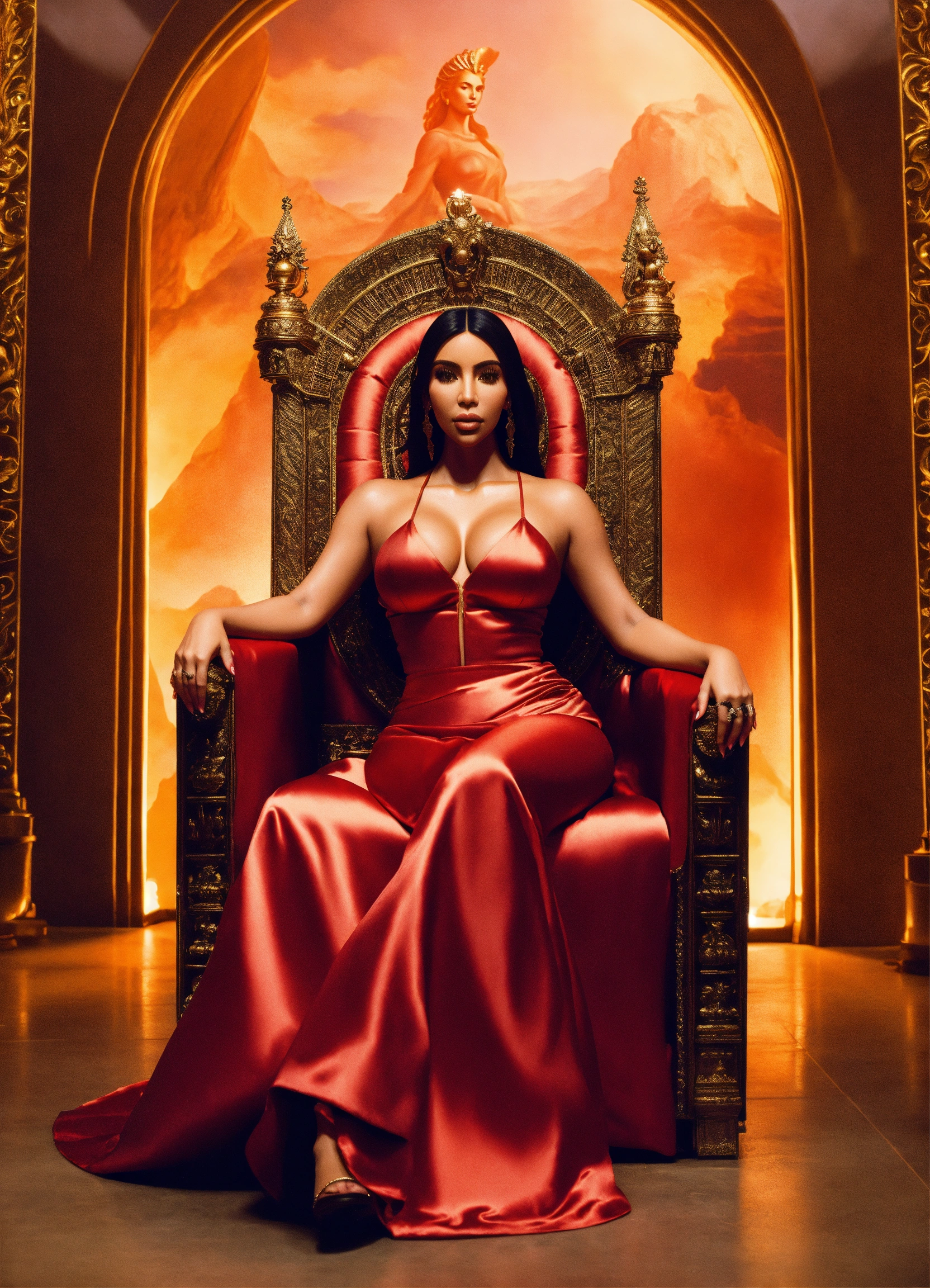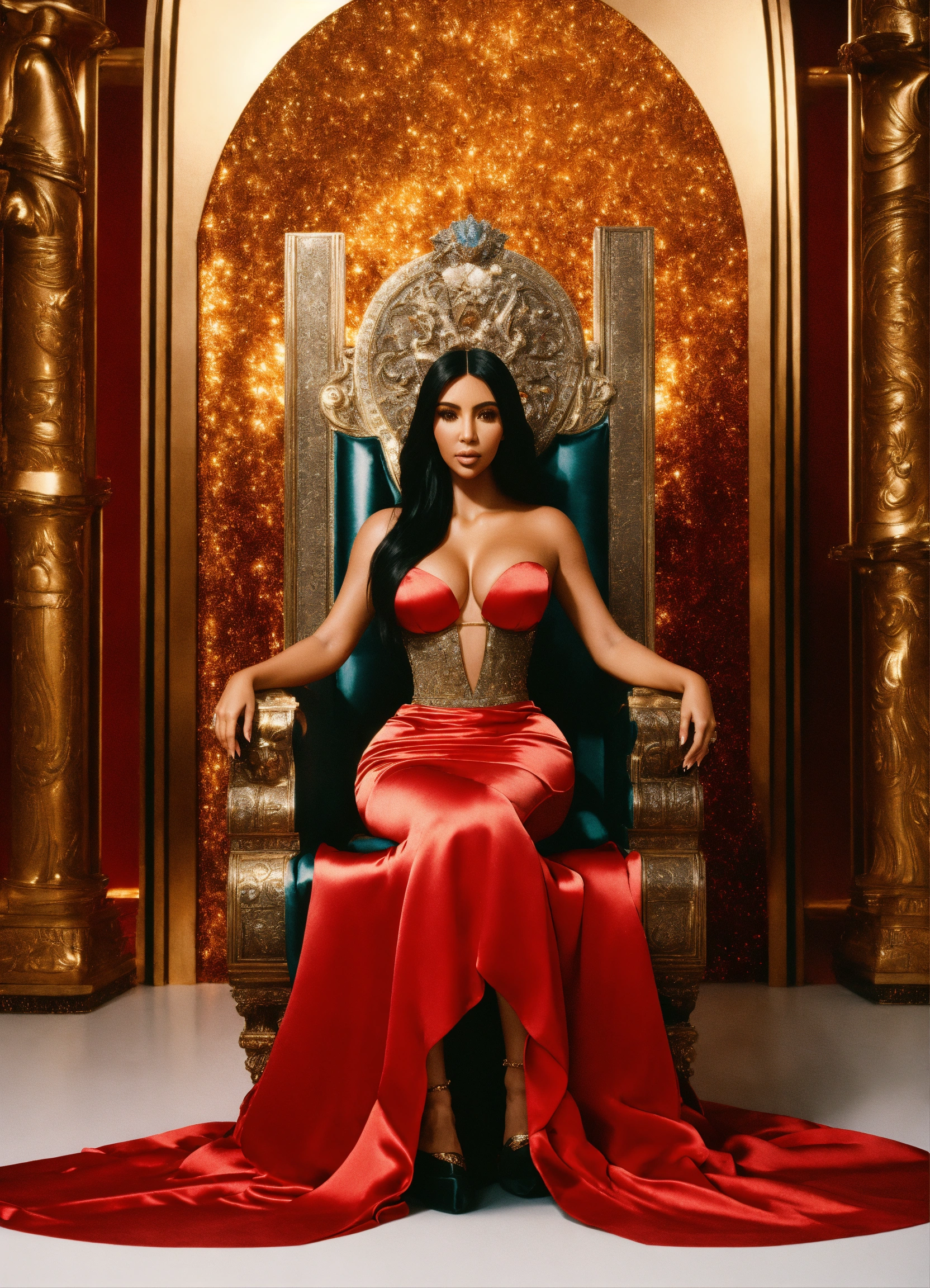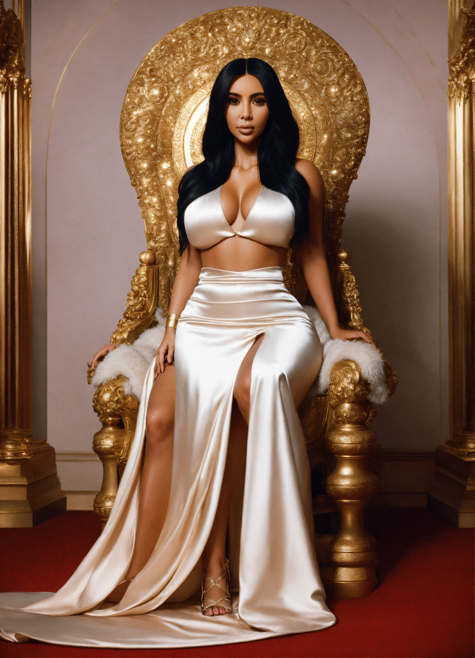 Kim kardashian as a goddess on a throne, satin skirt, portra 400 medium format, plain background, futuristic concept art
