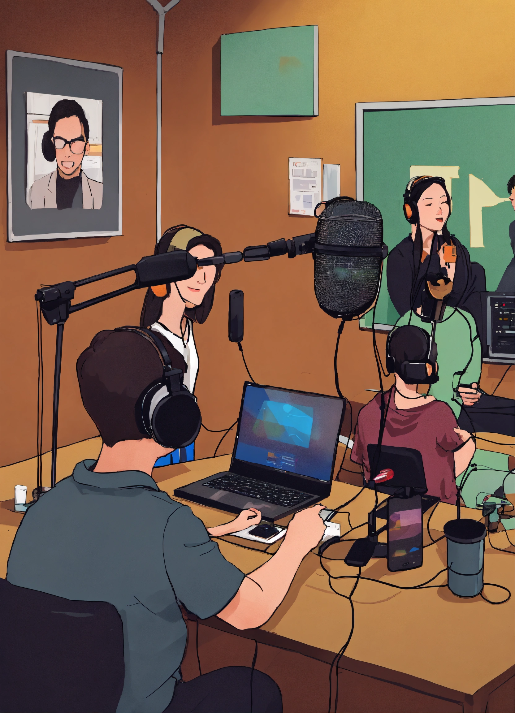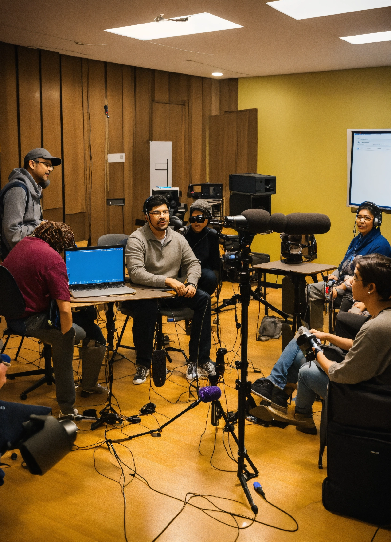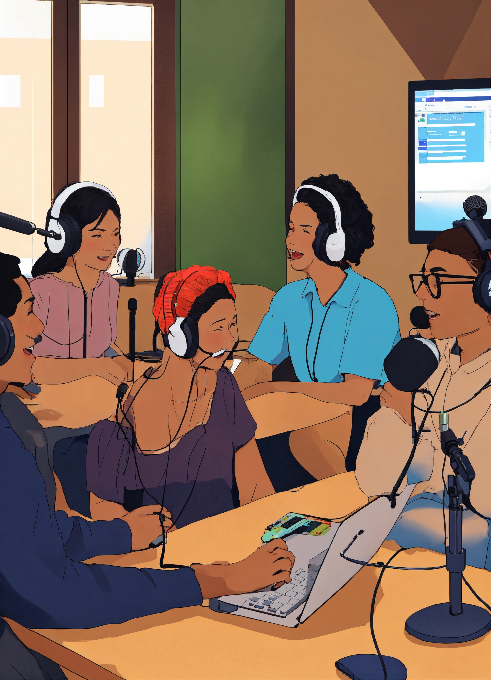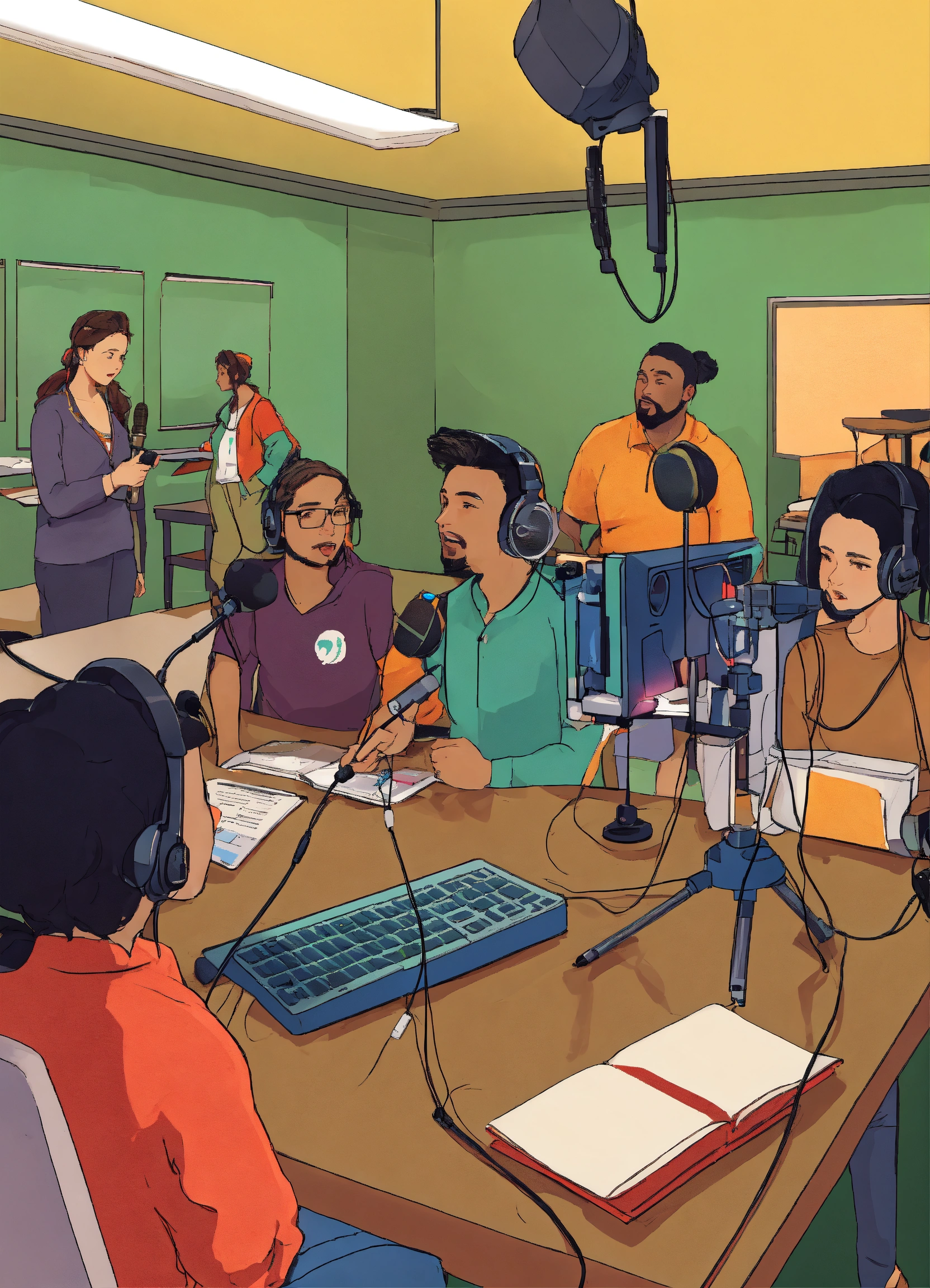 A scene where the community creates a podcast with pdcasting equipment, microphones, computer. with teachers and adult students