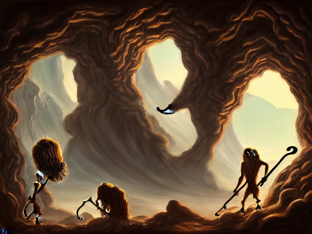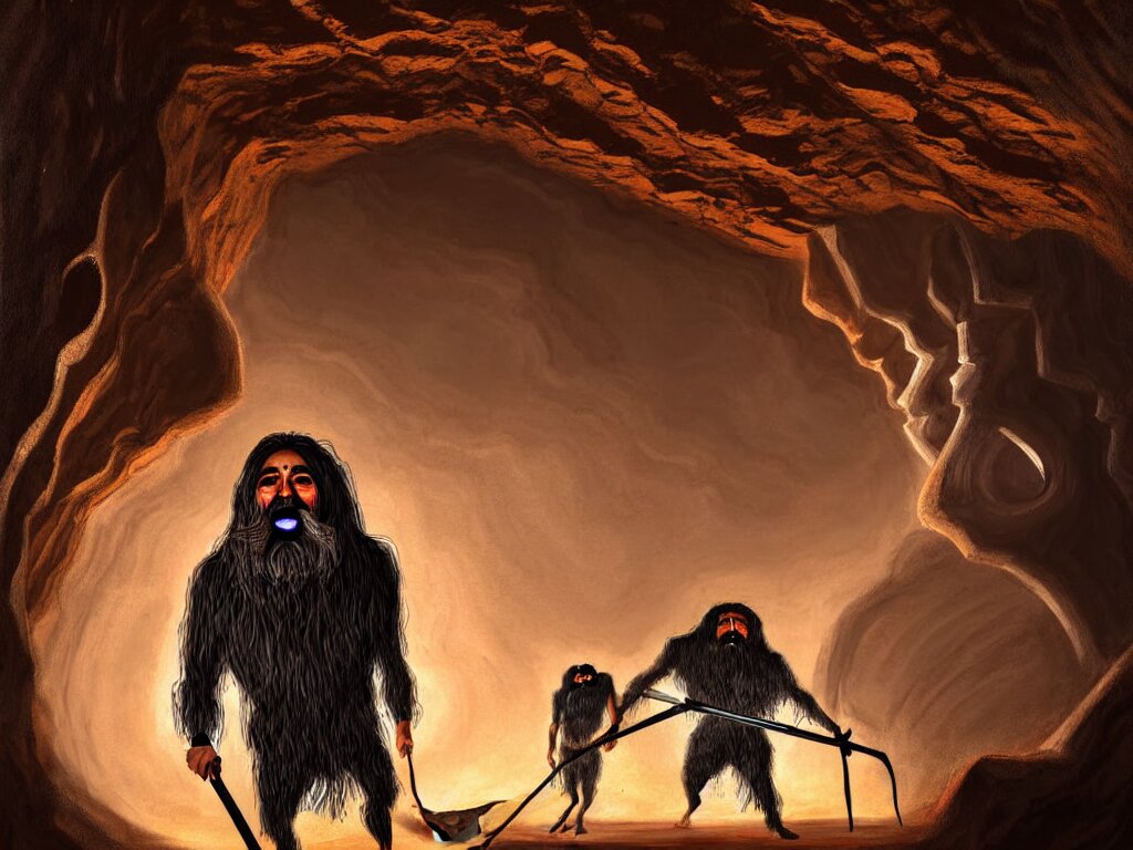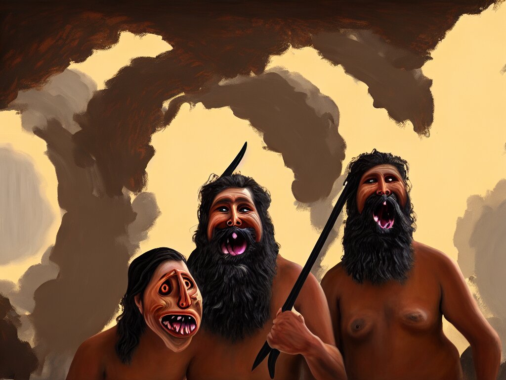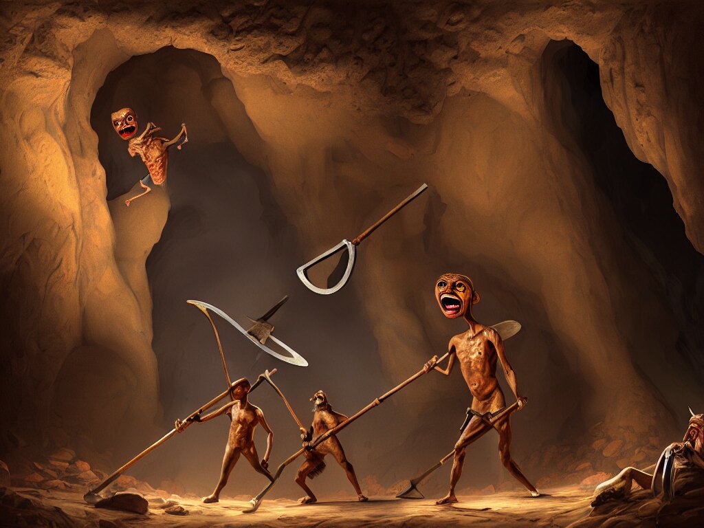 A painting of a human of a big mouth turns into a cave with strange bearded beings with scythes, 4 k, art by miguel alandia pantoja