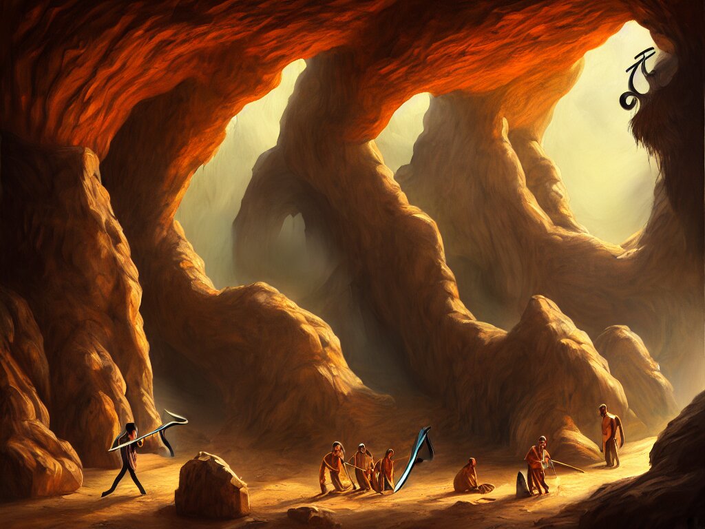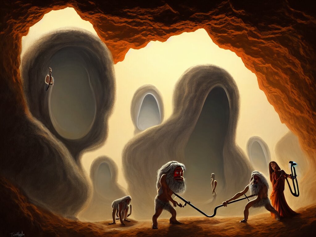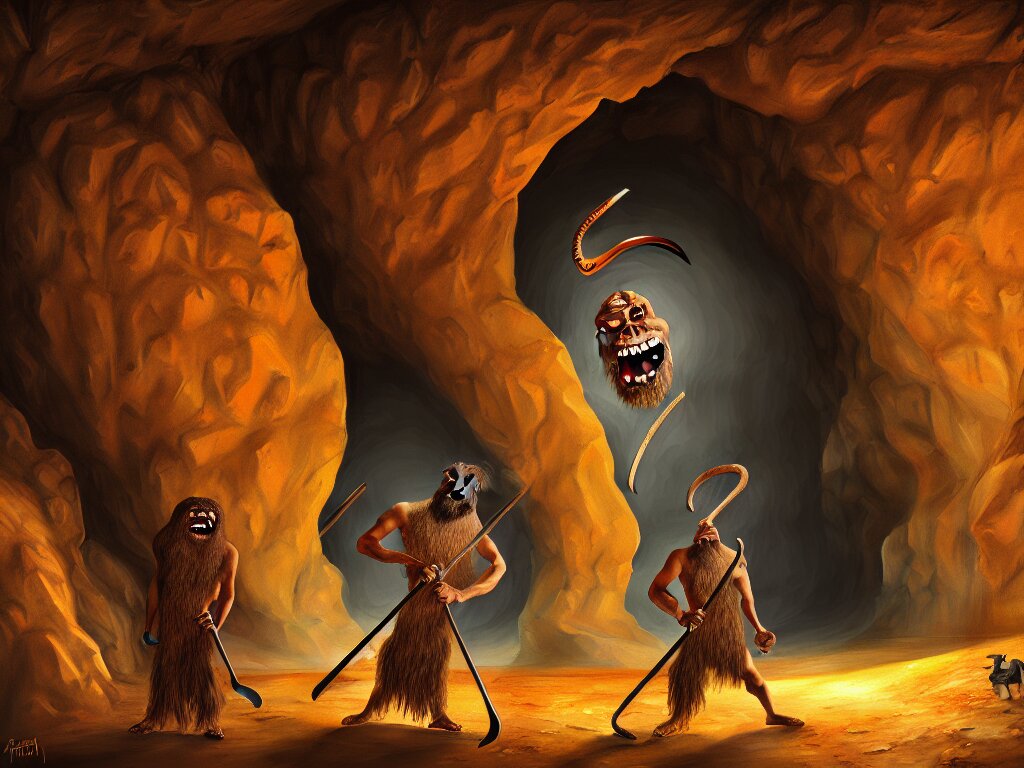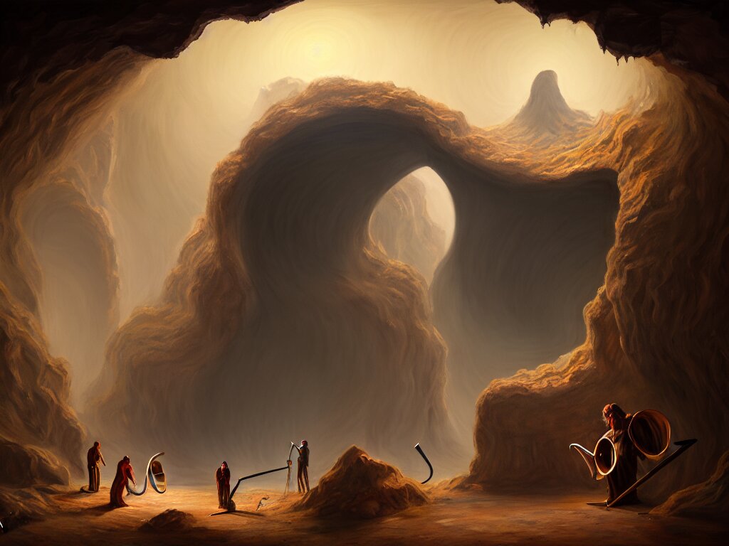 A painting of a human of a big mouth turns into a cave with strange bearded beings with scythes, 4 k, art by miguel alandia pantoja