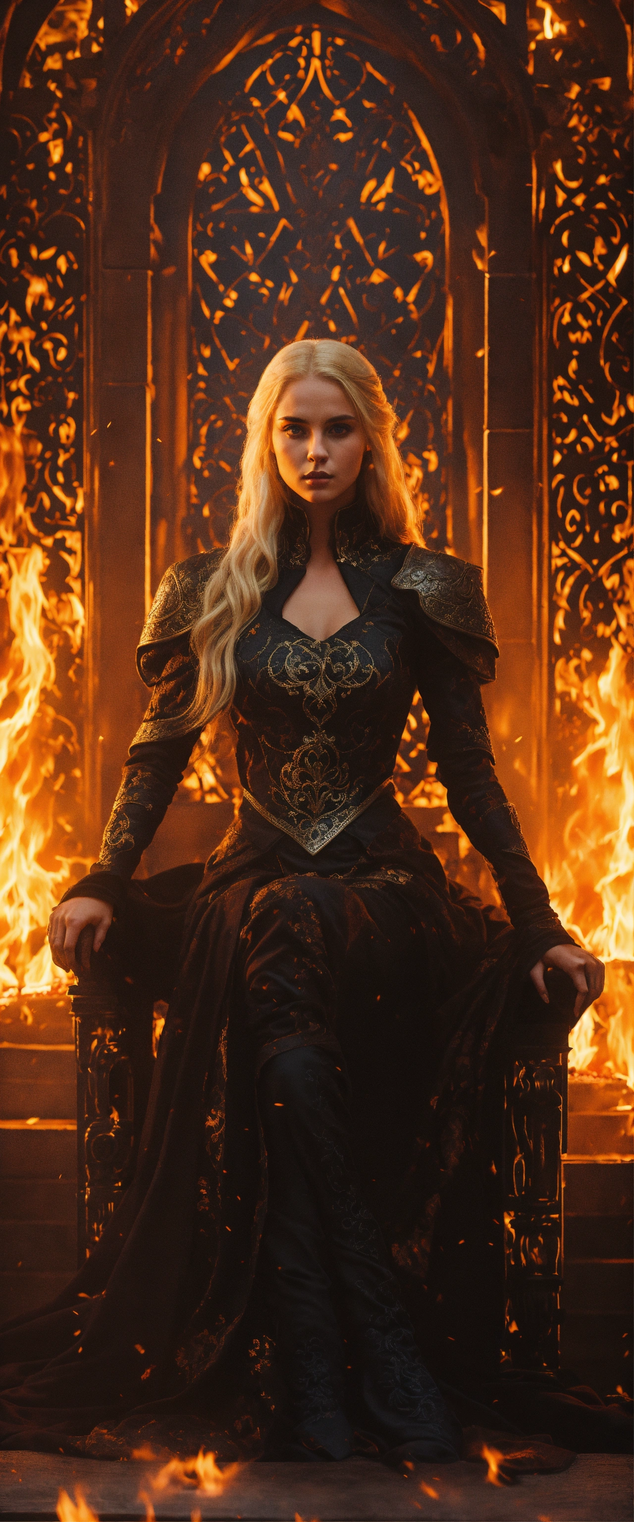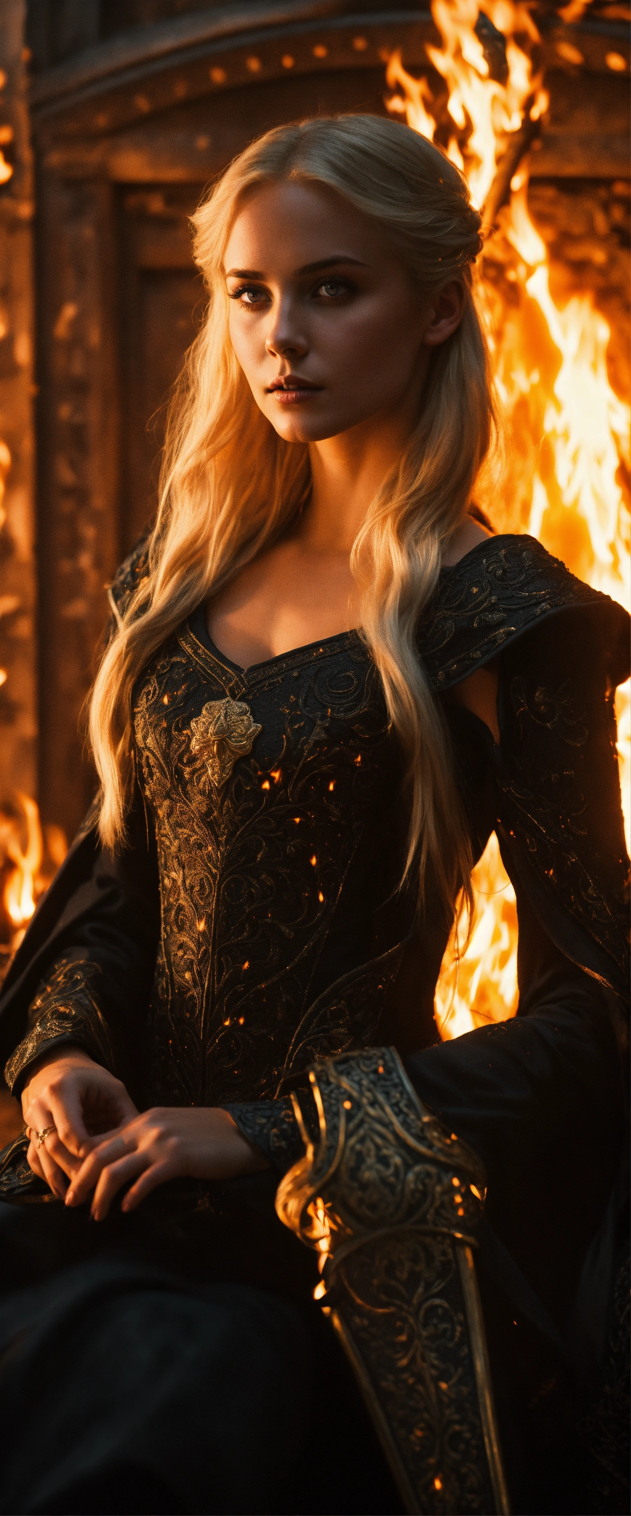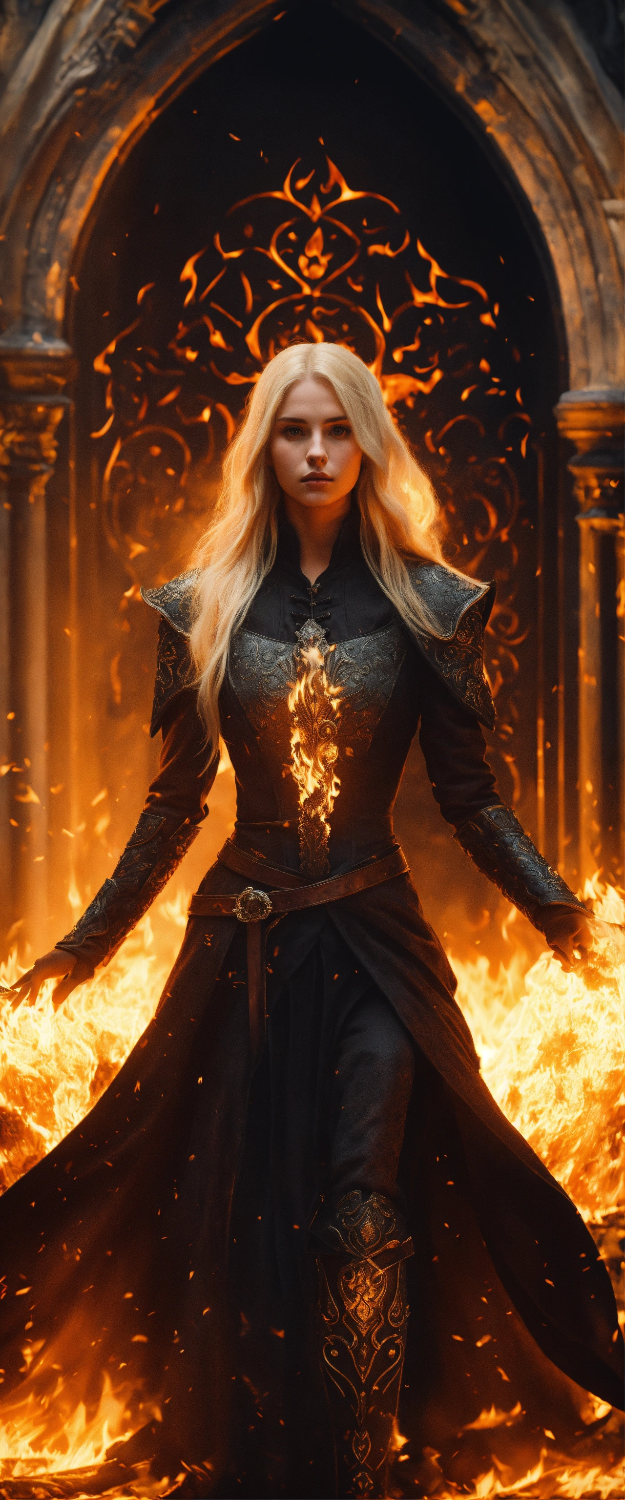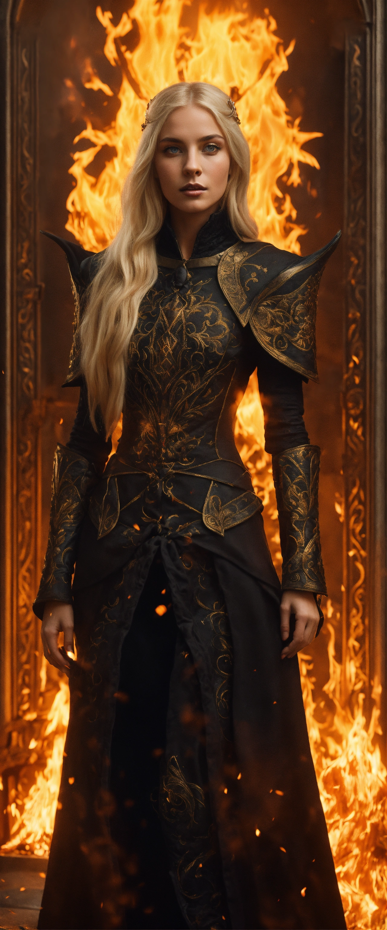 Young medieval warlock woman in black gorgeous suit, simple medieval room, fire, blond, hyperdetailed eyes, gorgeous face, warrior, throne of glass, aelin galathynius, powerful queen, hands burning in fire