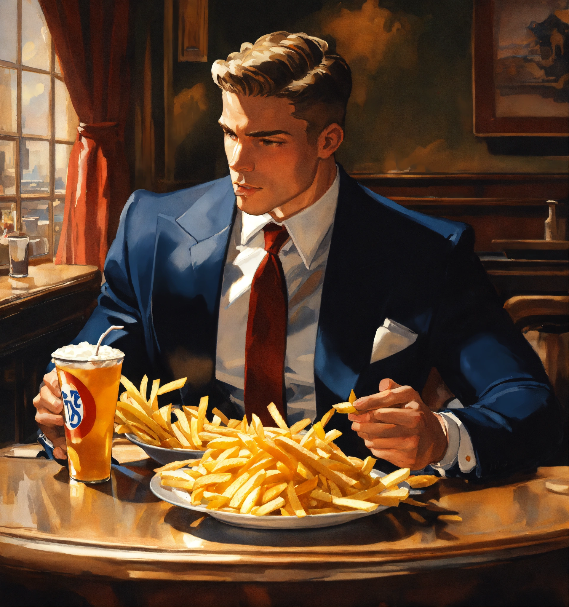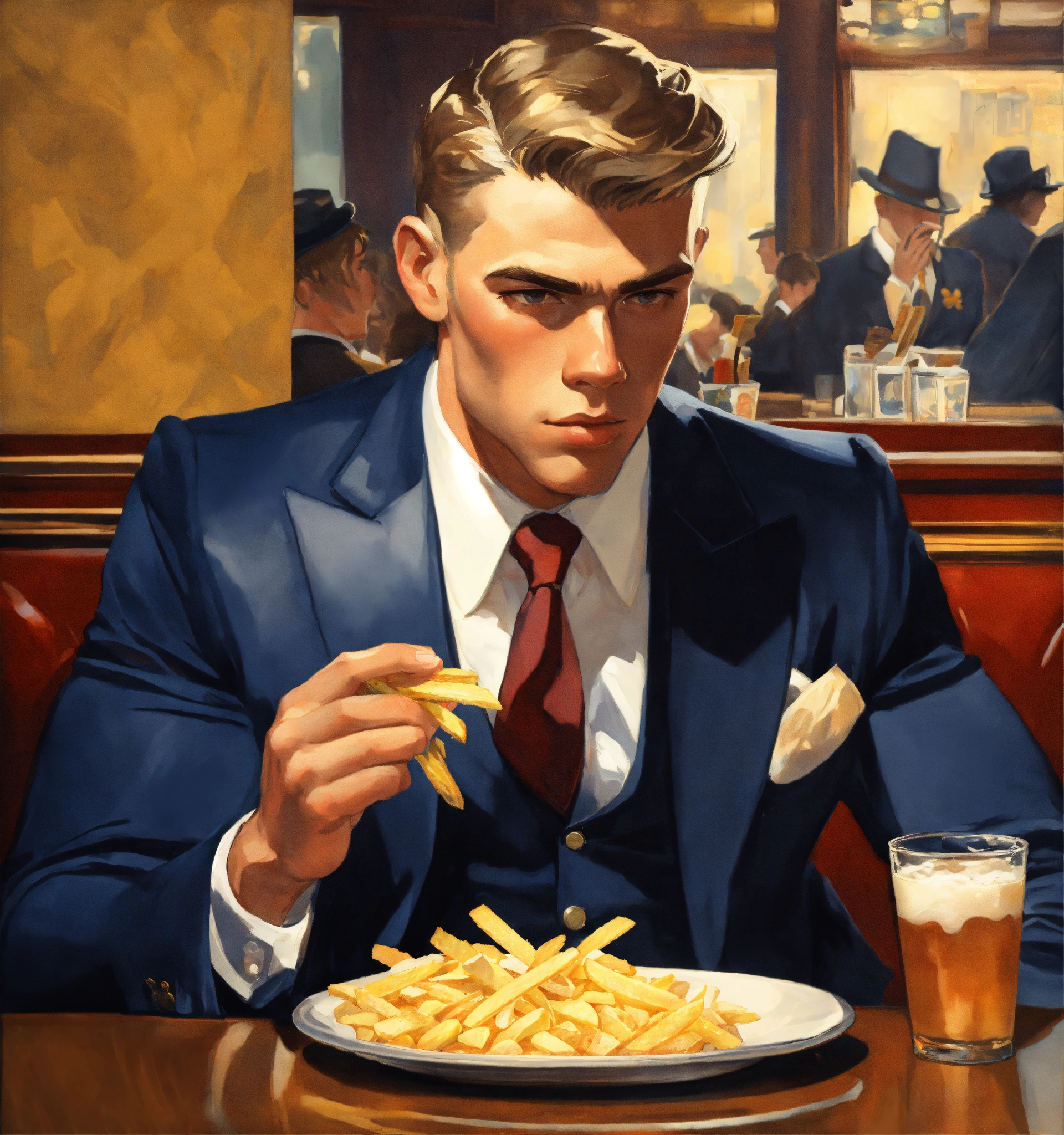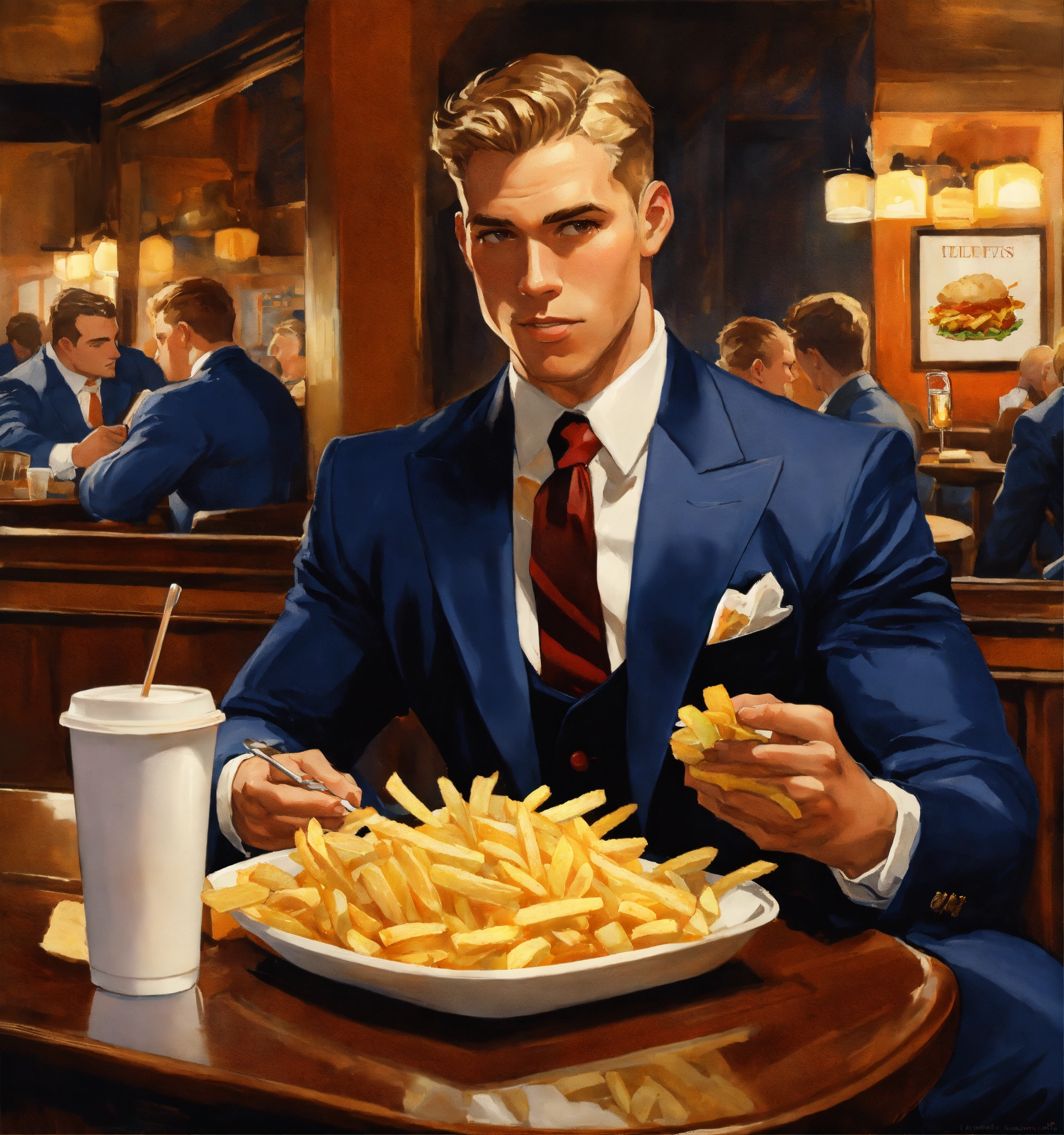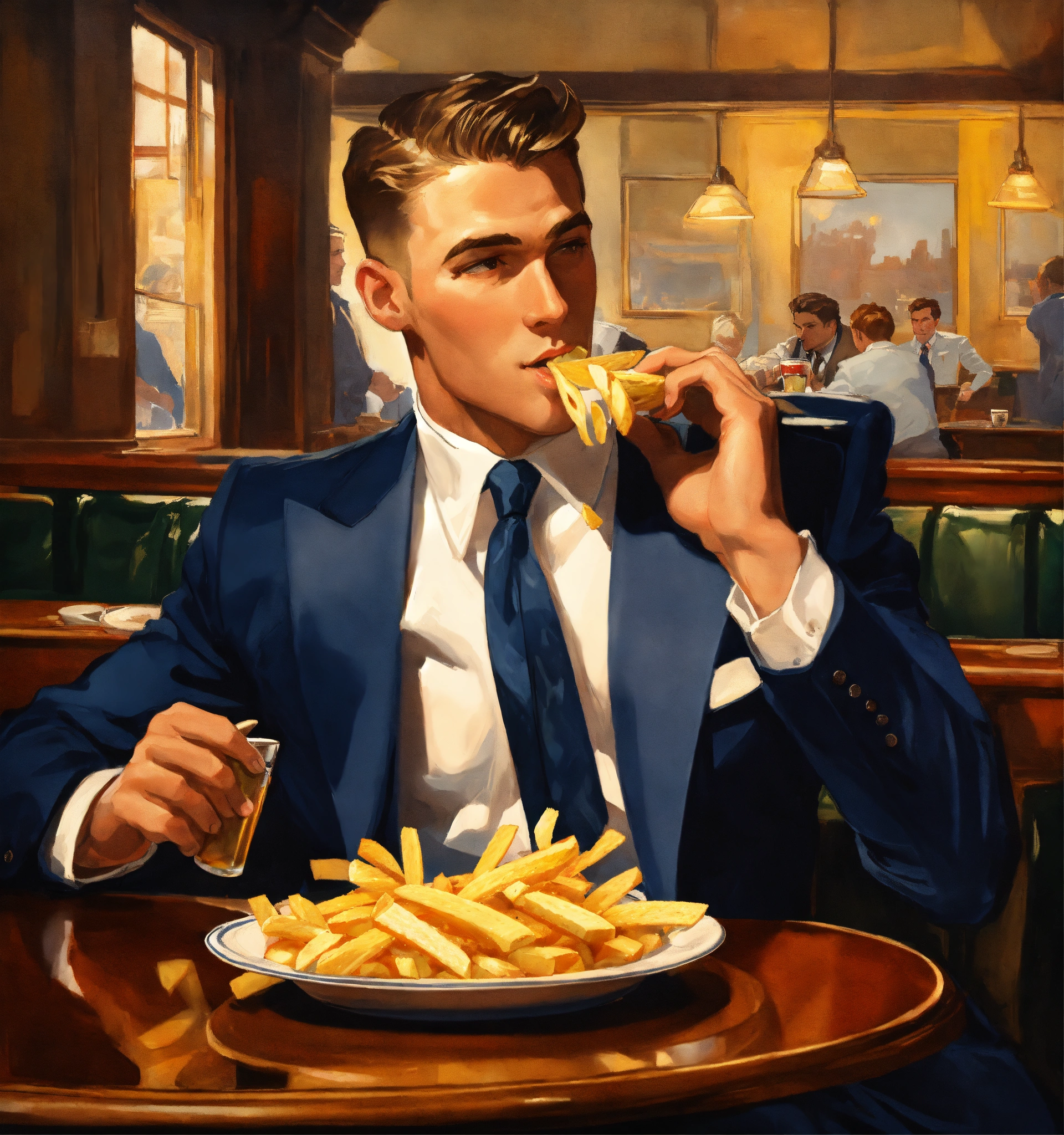 A muscled male sportsman in navy suit, club tie, brushed hair, eating french fries in a pub, leyendecker style