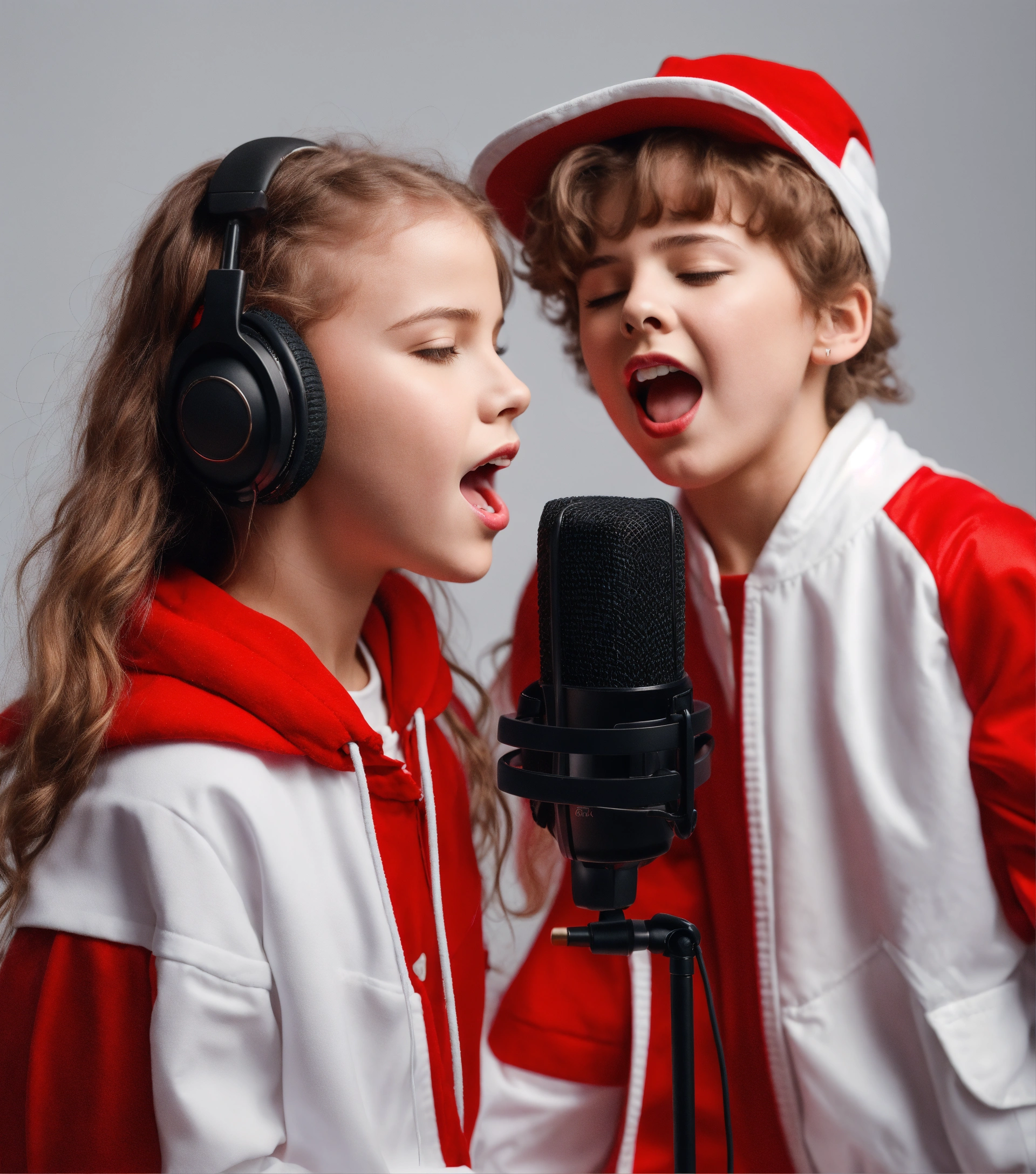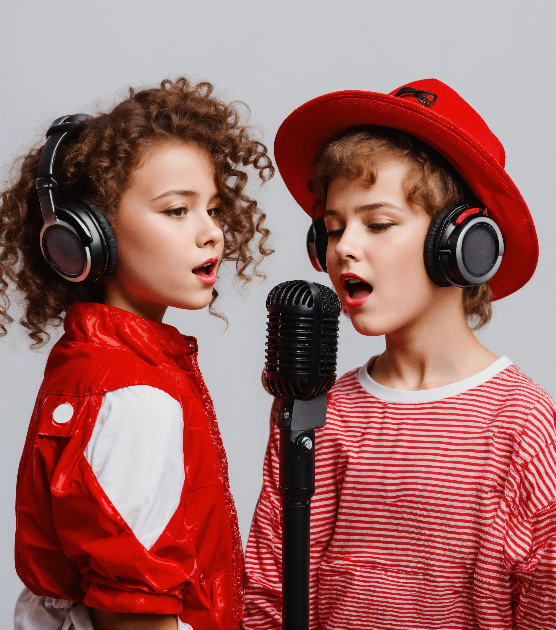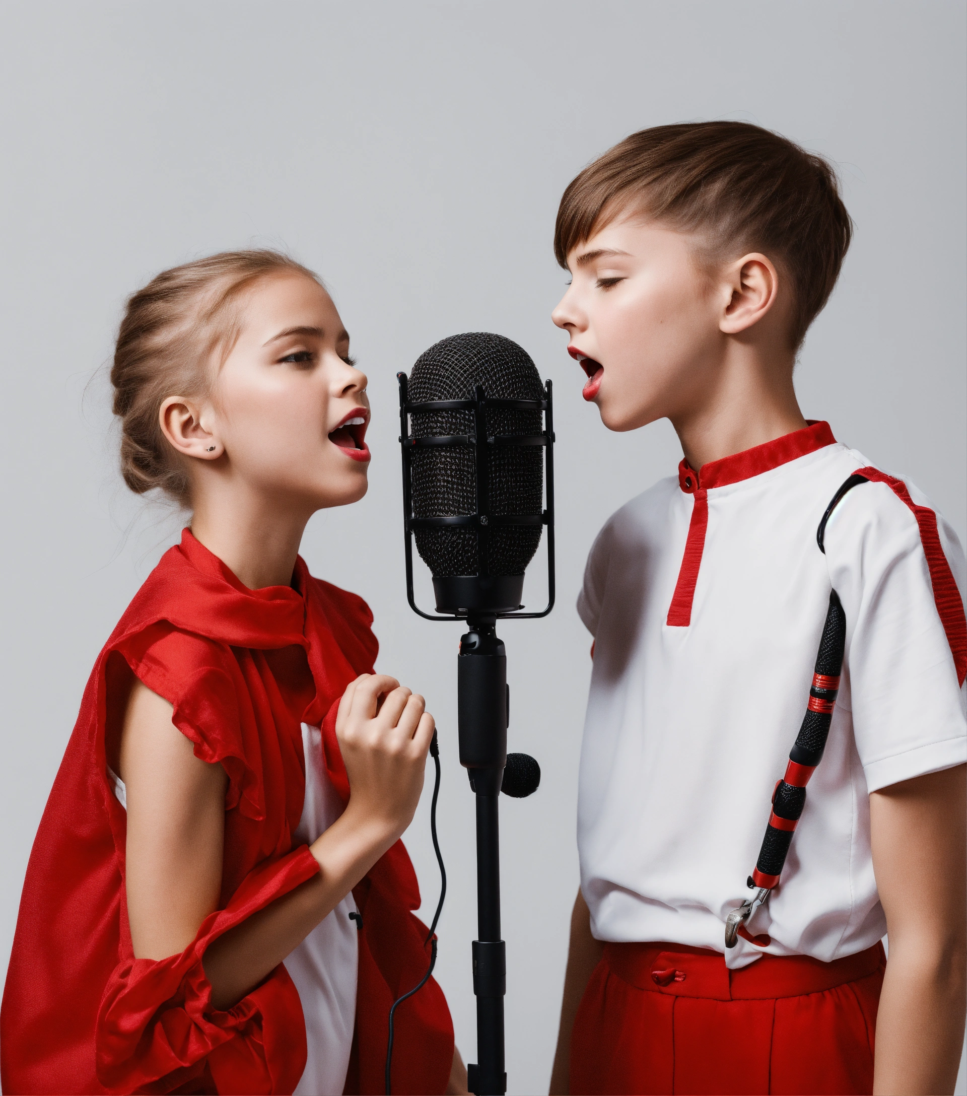 A european young girl and a boy singing in a black microphone standing in white and red clothes on a white background