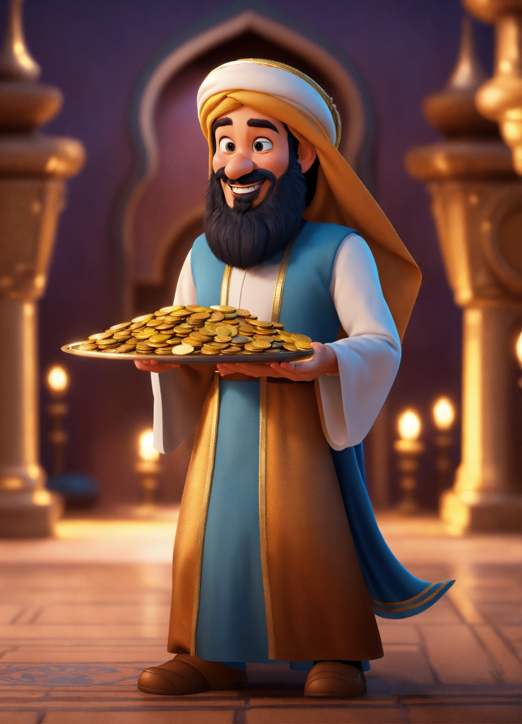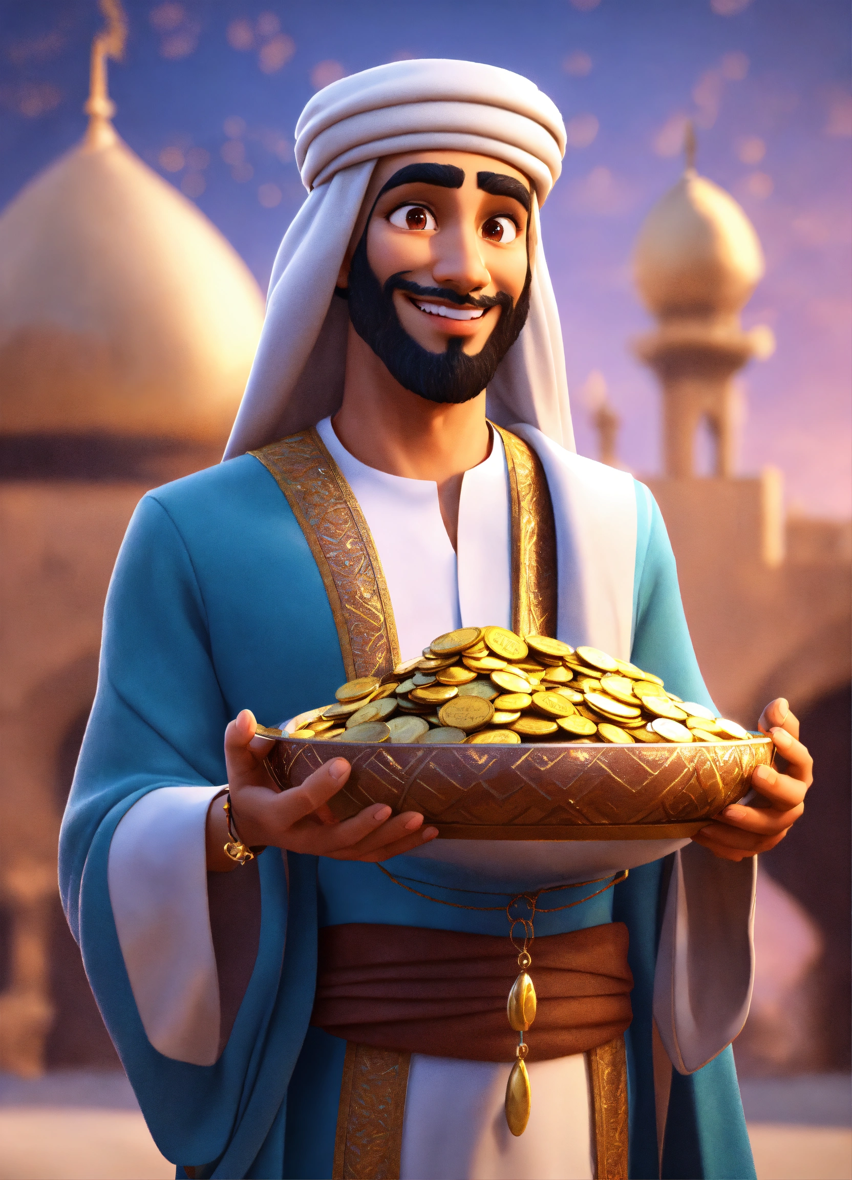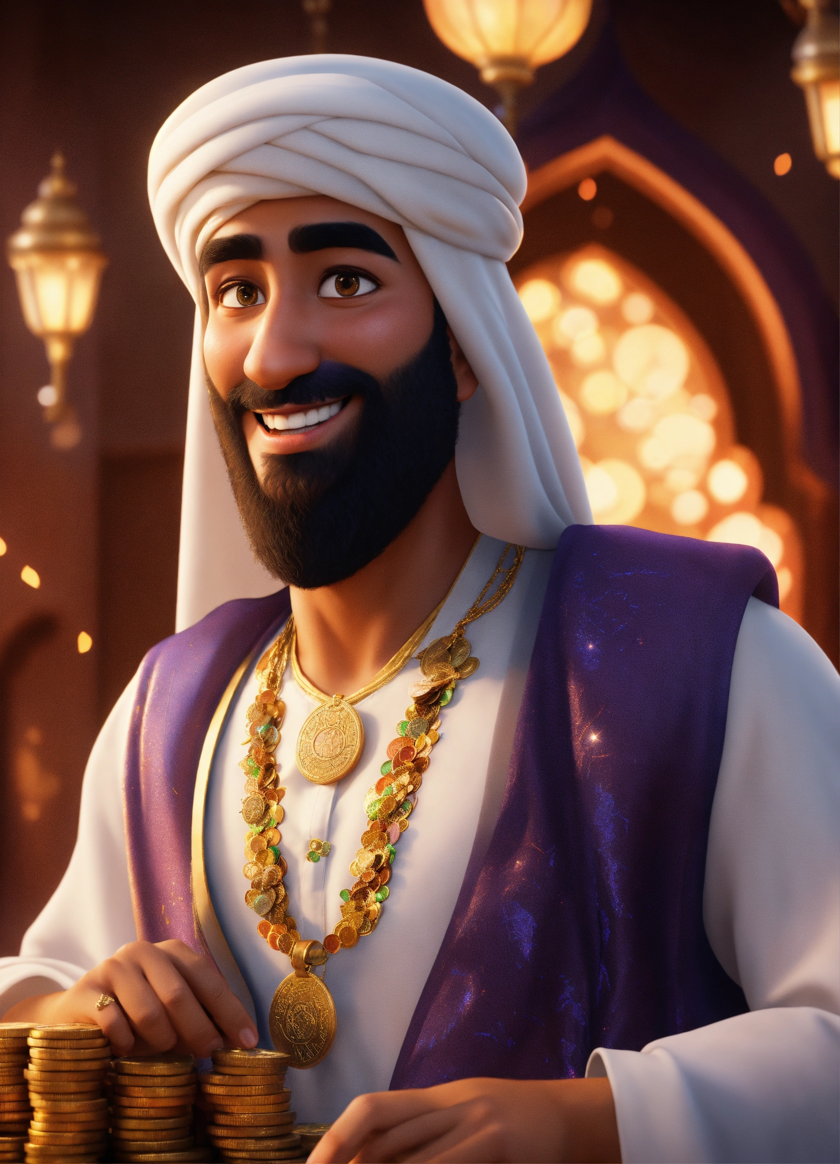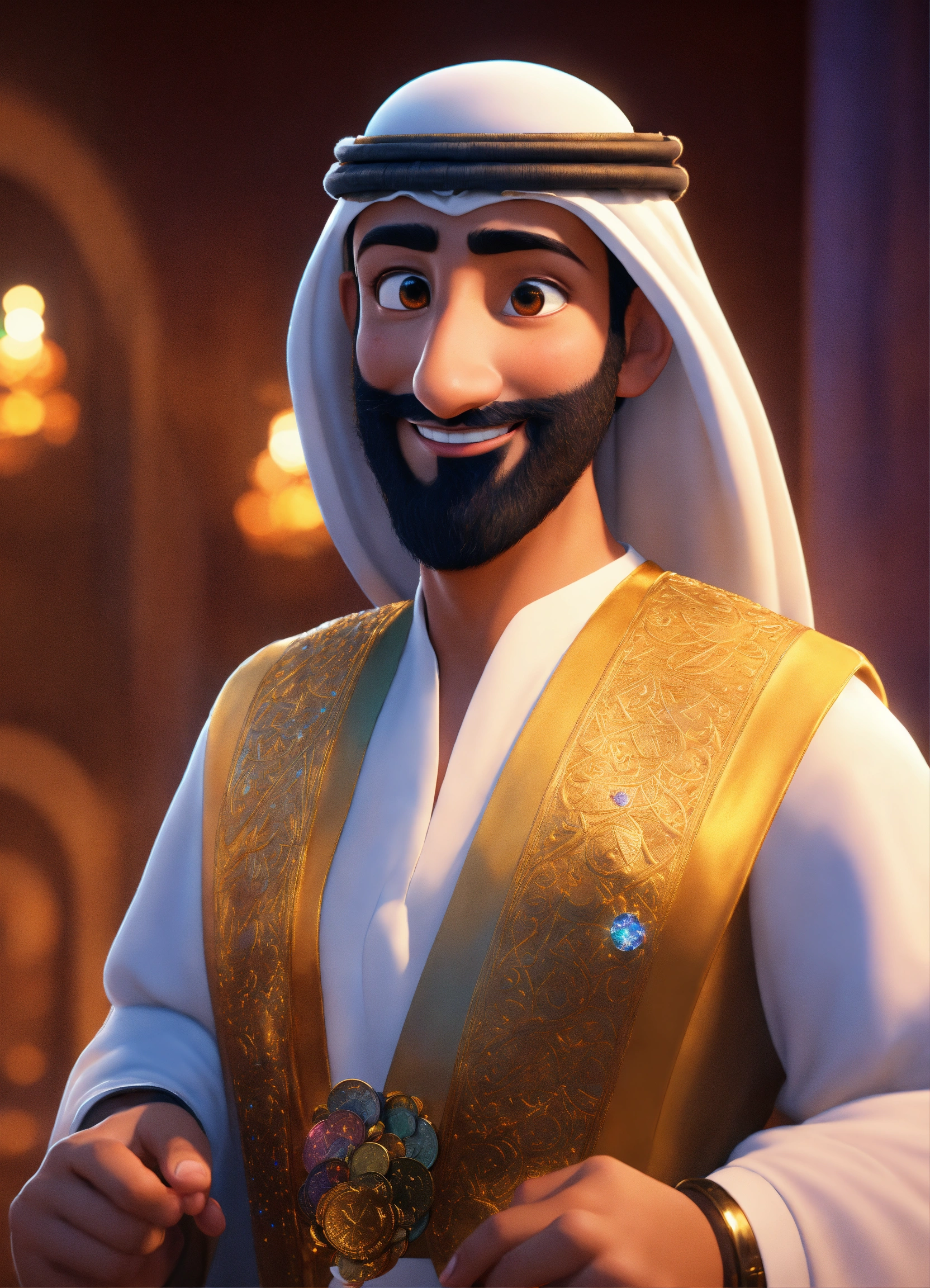 Create a 3d rendering of a wealthy arab male sheikh from dubai, inspired by the disney animation style. the sheikh must have a smile and a playful but wise character. place your character in the atmosphere of arabian nights and aladdin. the image must be in high resolution format. dynamic pose from the waist up, holding coins in your hands in front of you. (pixar art style)++ highly detailed digital painting, art stations, concept art, soft focus, hard focus, illustrations. cinematic, visual effects, hdr, unreal engine 5, ray tracing, soft light, 8k, high detail, sparkling backlighting, luxury gem, game art, 3d, cartoon, colorful, magical, mysterious