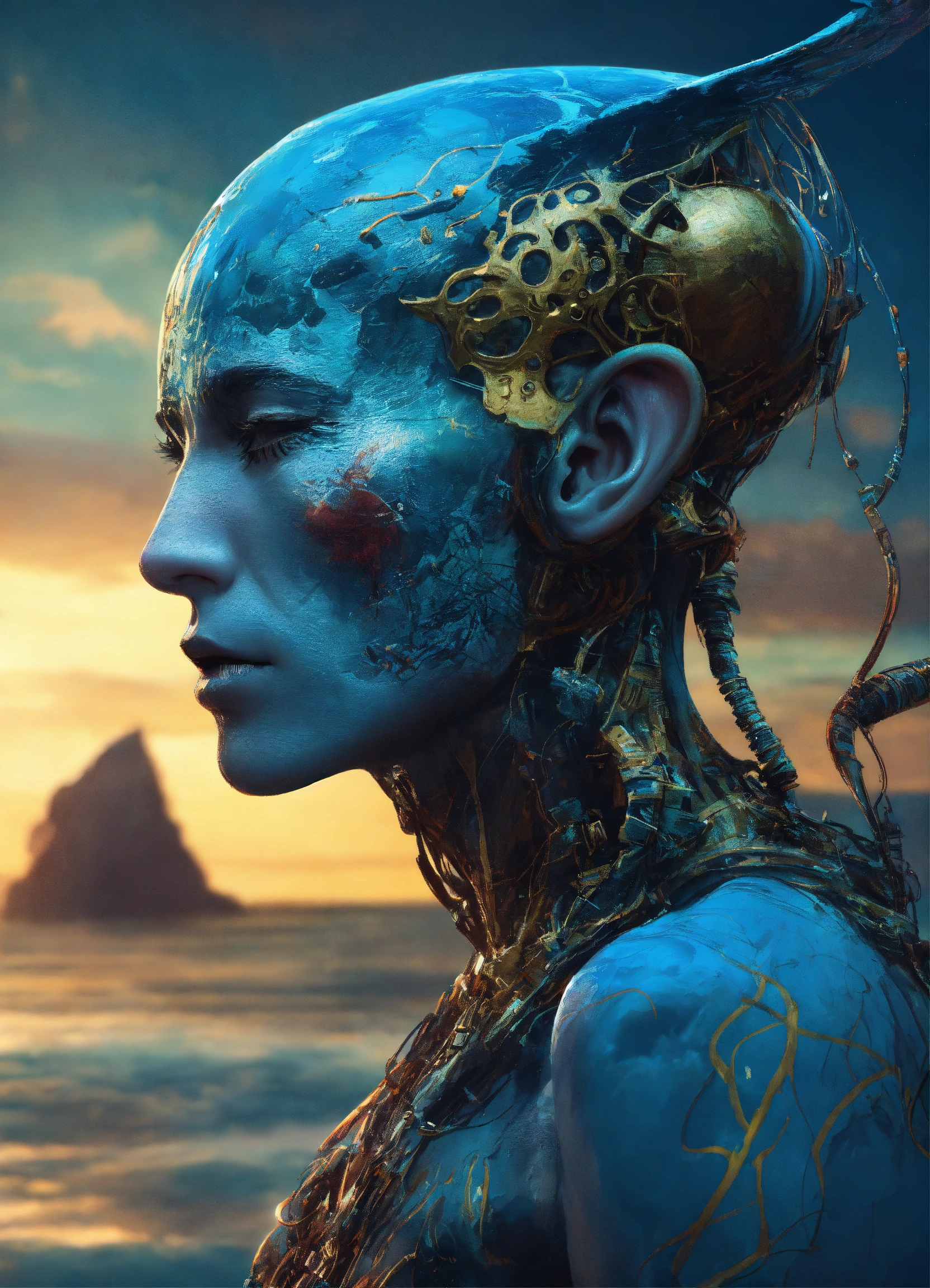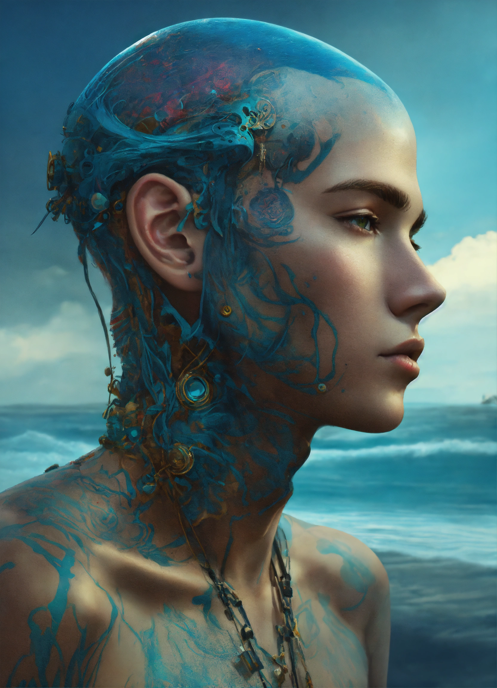 Professional portrait of a alien race tatooed typ, the head with 3d bony growths under the skin on the head normal face full body side view the backdrop sea and clouds the sea is ocean_blue the male is natural colored, abstract beauty, approaching perfection, delicate face, dynamic, moonlight, highly detailed, digital painting, artstation, concept art, smooth, sharp focus, illustration, art by carne griffiths and wadim kashin