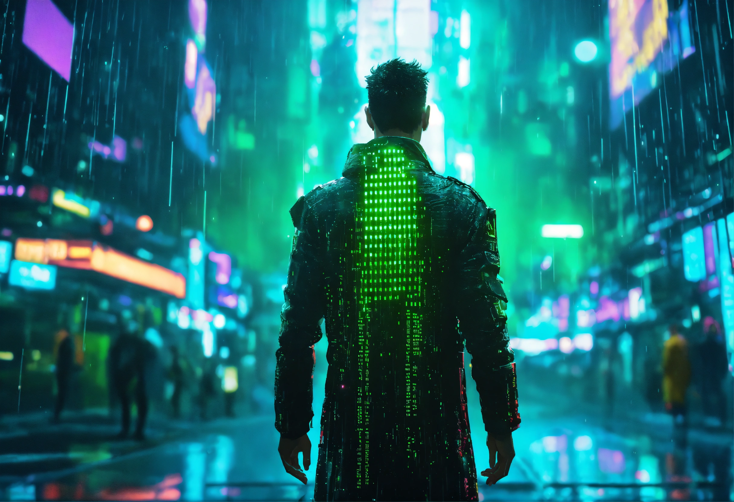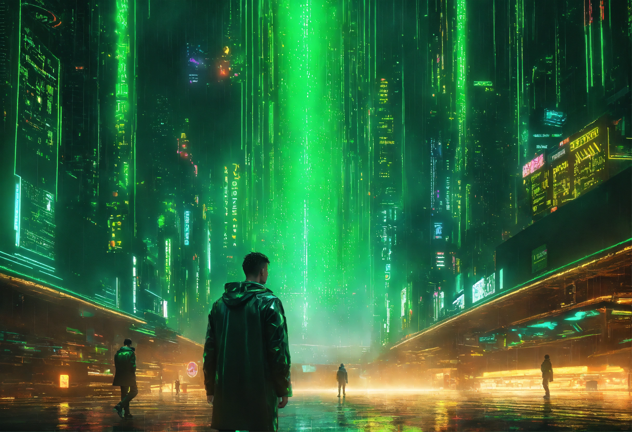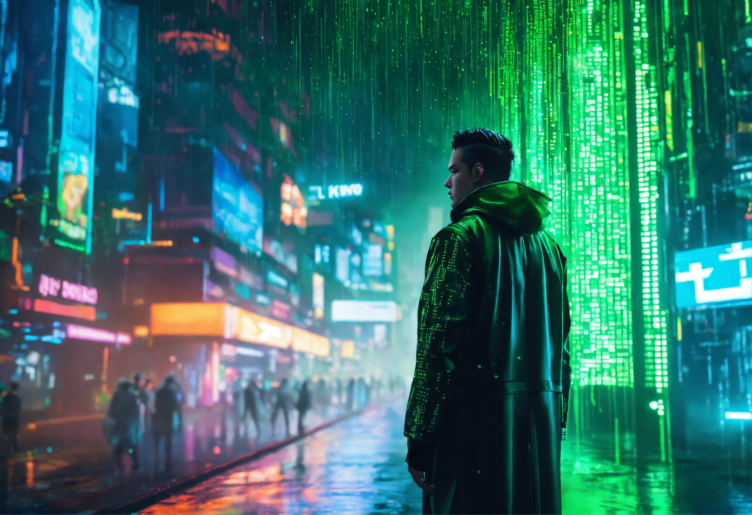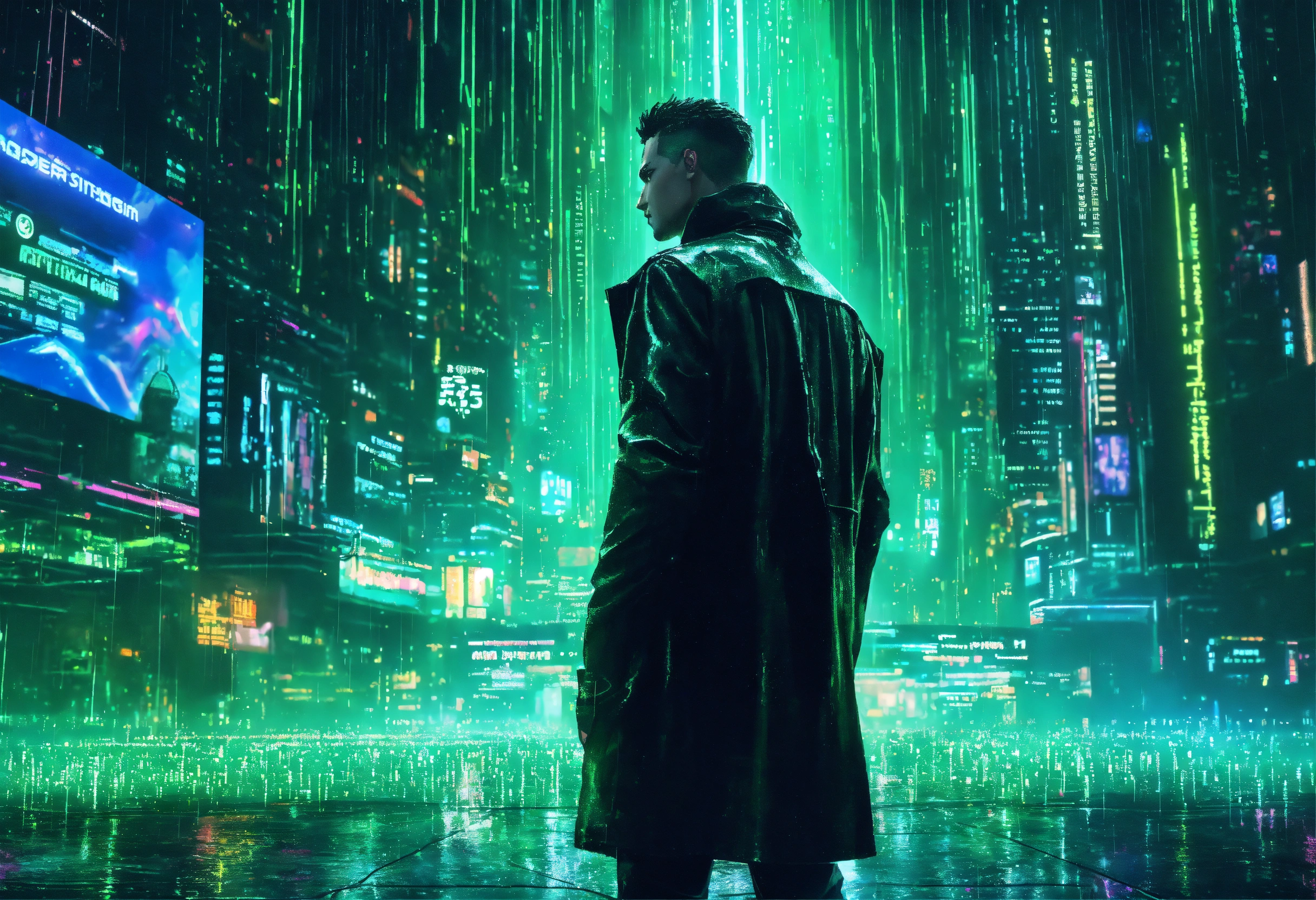 If social media were cyberpunk, green and black futuristic, cyberpunk. in the background, a mesmerizing rain of binary code, creating a matrix-style atmosphere. the image is in 8k resolution, hyper-realistic, and hyper-detailed. the neon lights cast vibrant glows on the male's figure, and volumetric lighting enhances the cyberpunk ambiance.