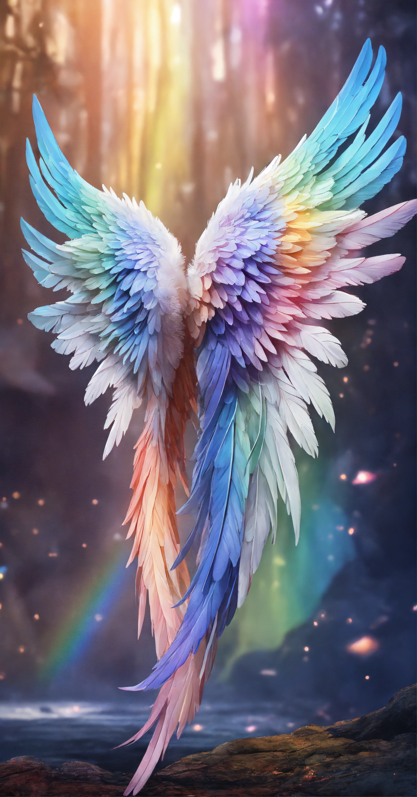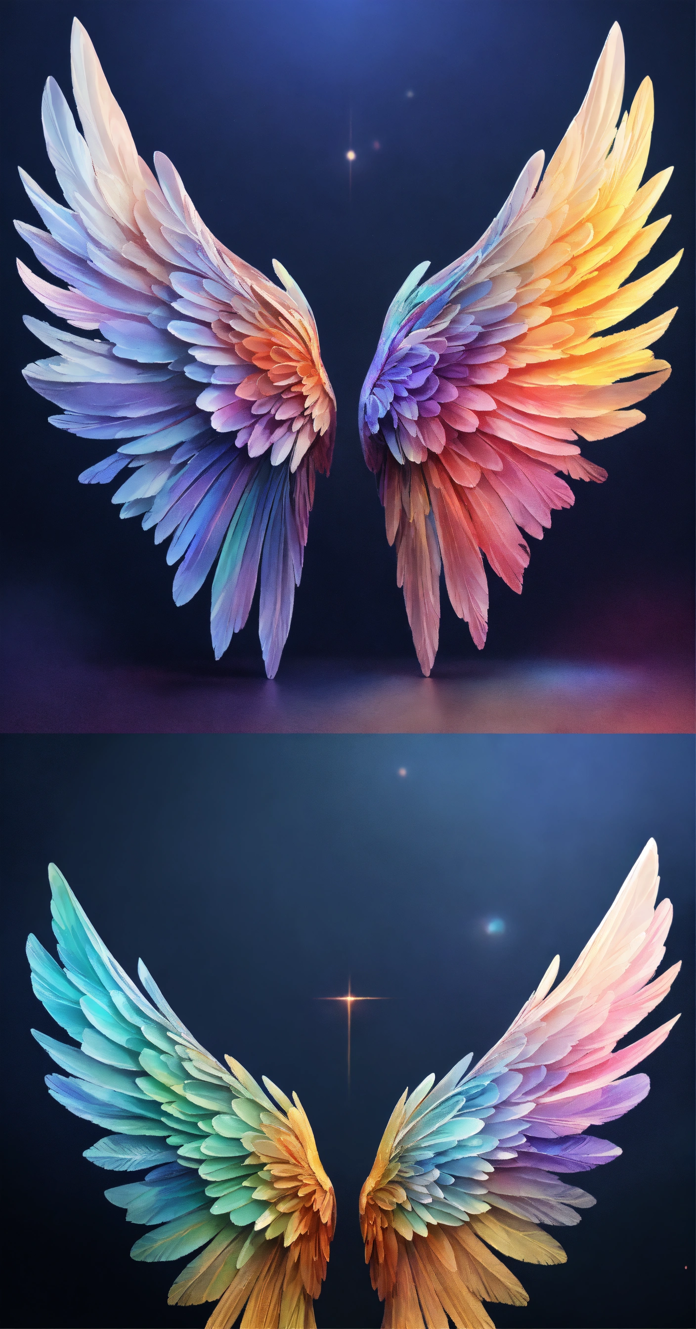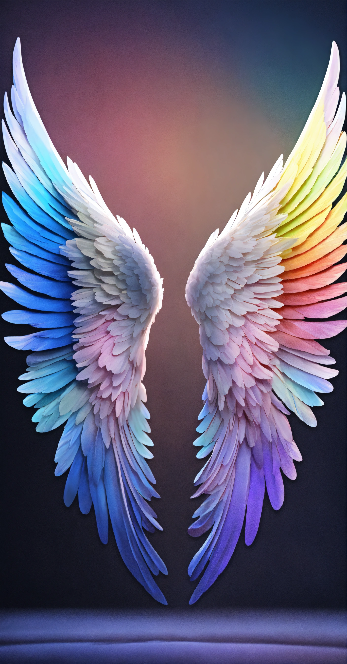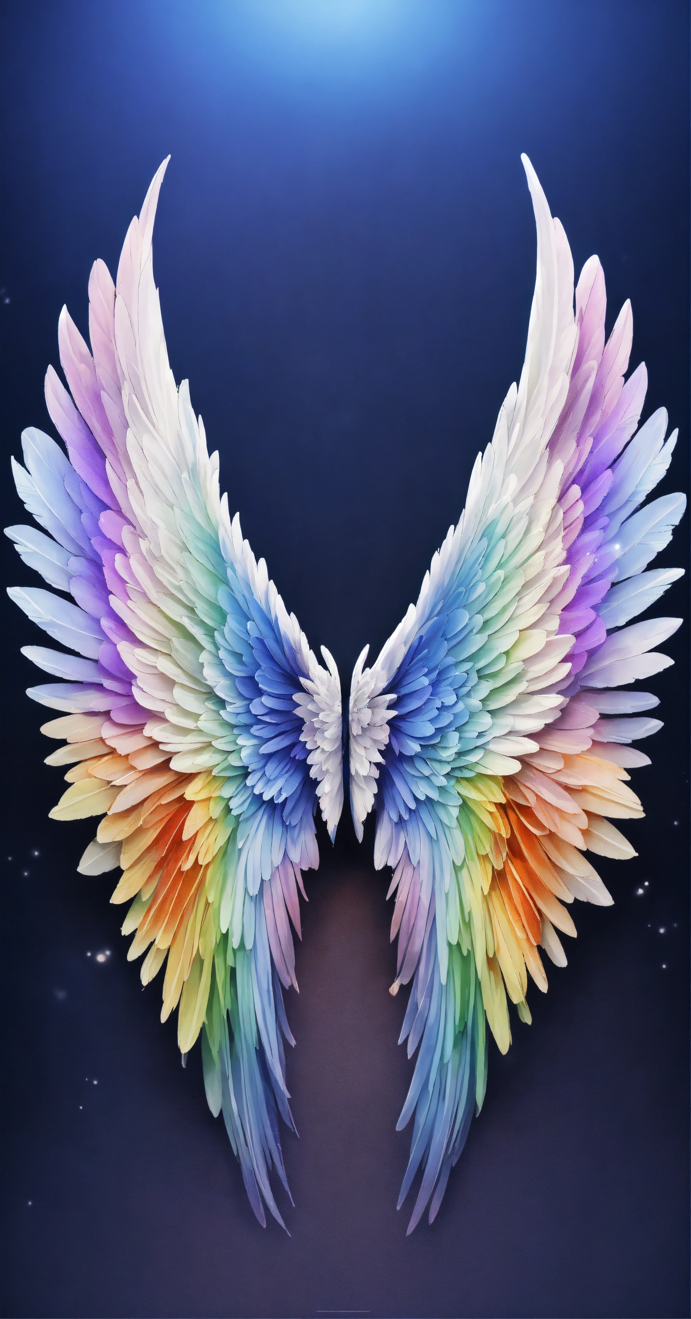 Beautiful and perfect small angel wings in soft rainbow colors, detailed and defined and at the same time some white details. just a pair of small full soft rainbow colored wings and some white details. hyper-detailed and hyper-realistic wings. wings with a slight decoration in soft rainbow tones and white details. small wings complete both the right wing and the left wing, the background is dark blue, 3d, masterpiece. hd. realism. high resolution. high quality. digital art. 8k