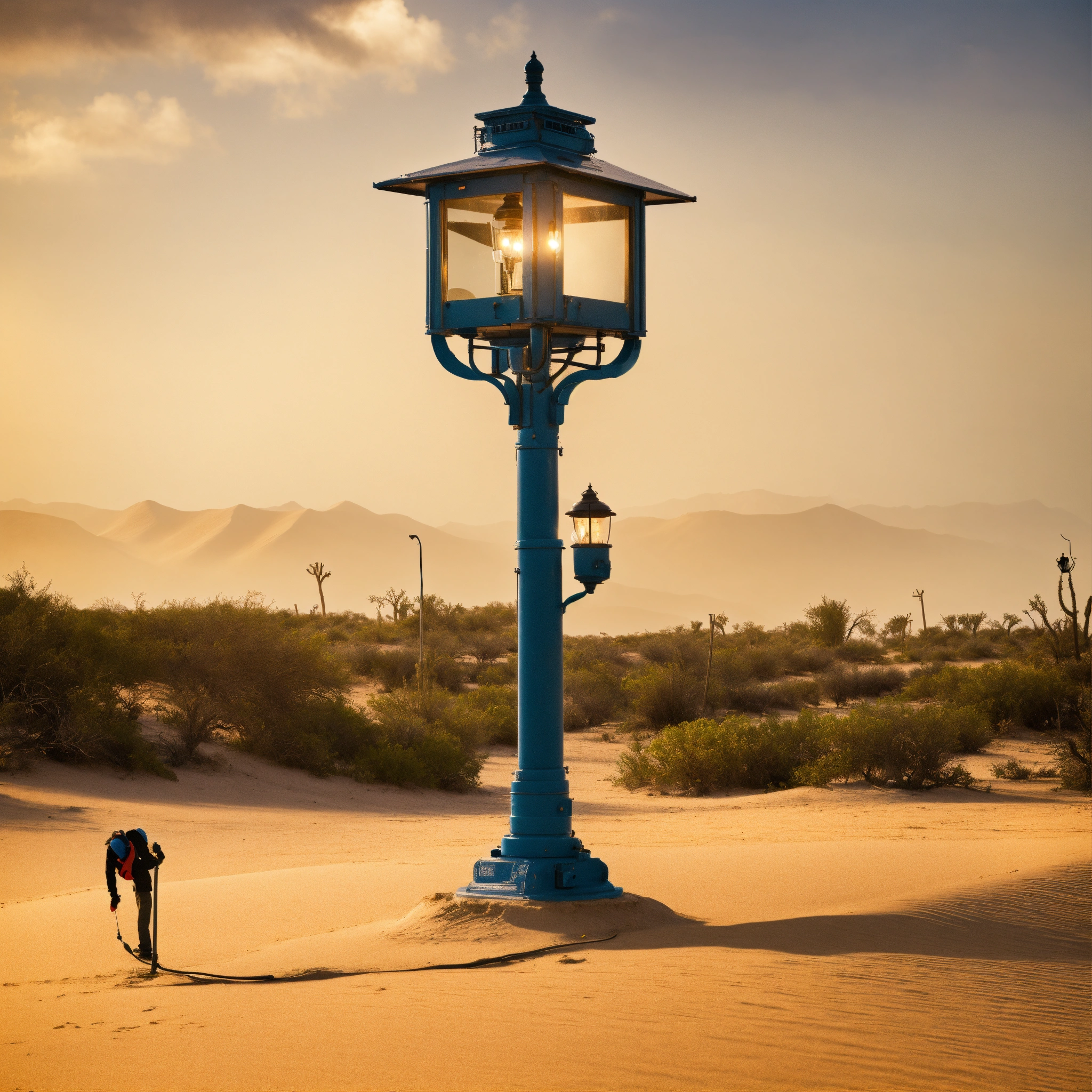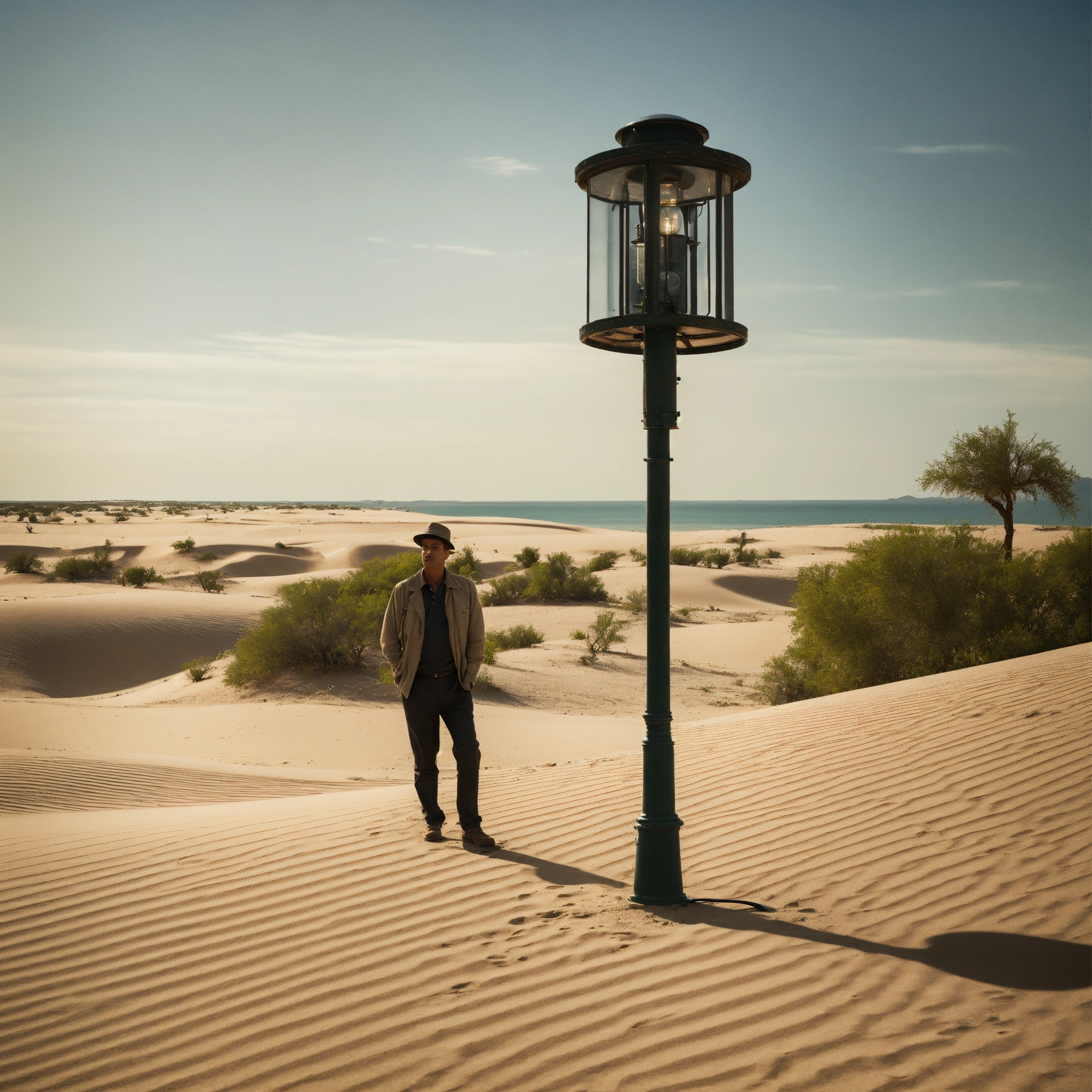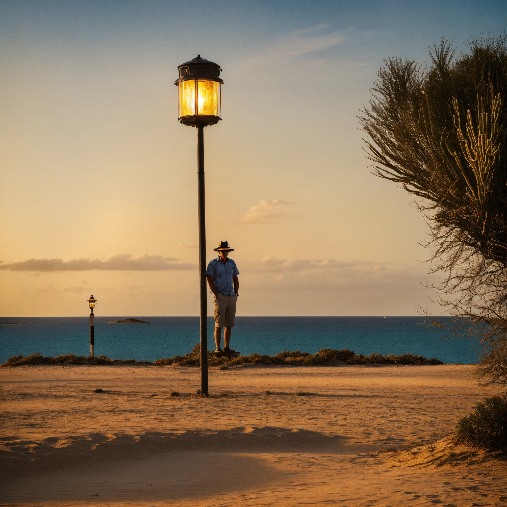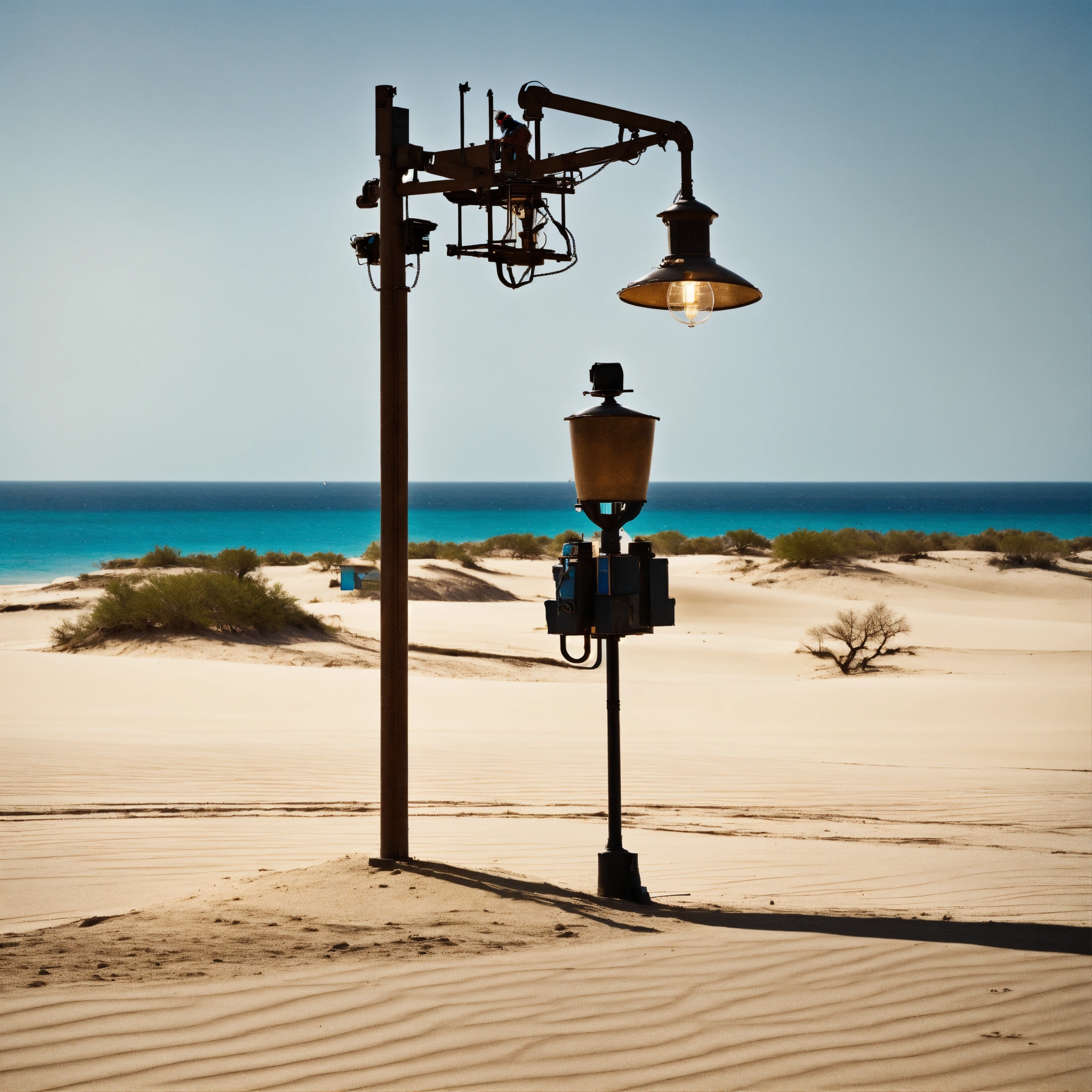 Man in machine lamp post on desert island