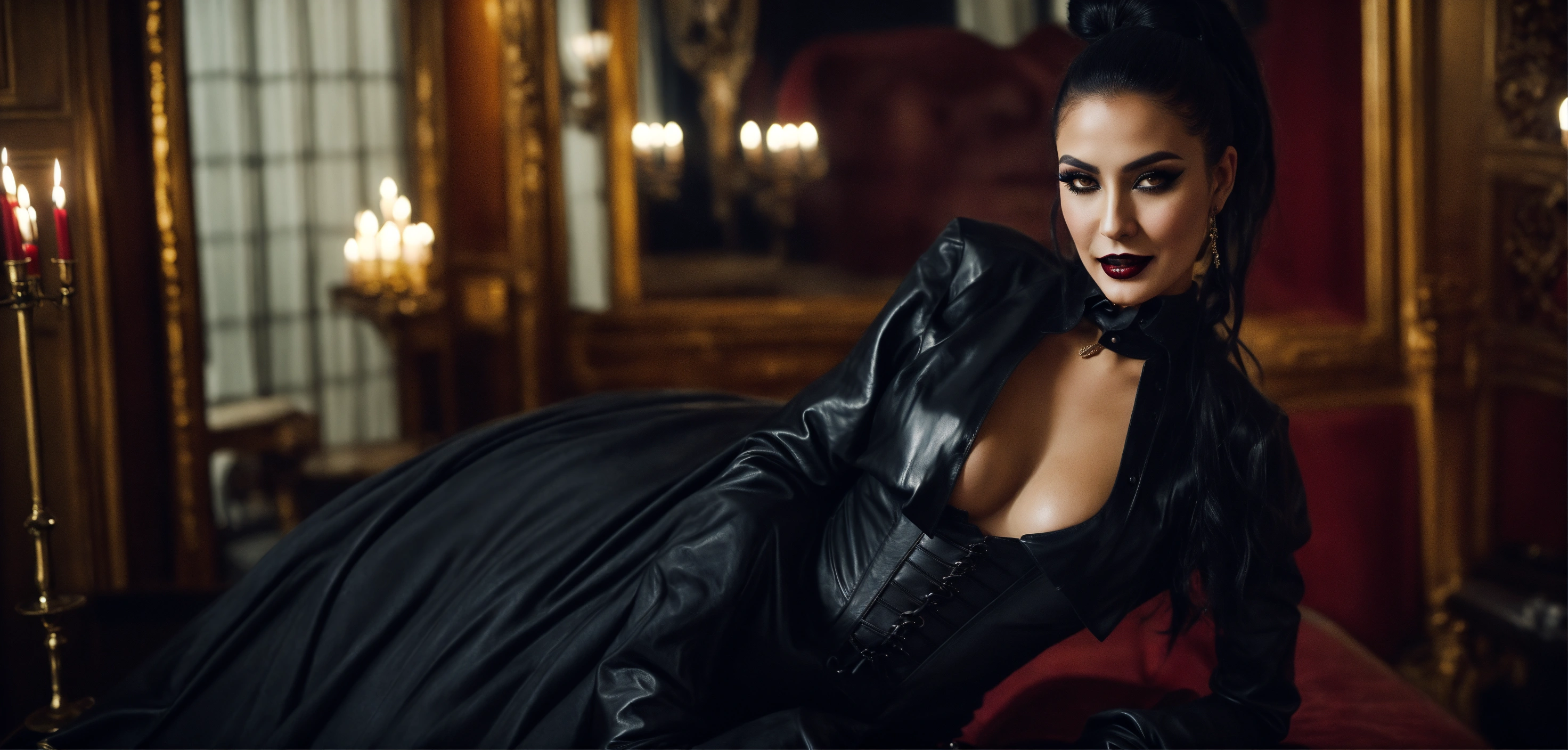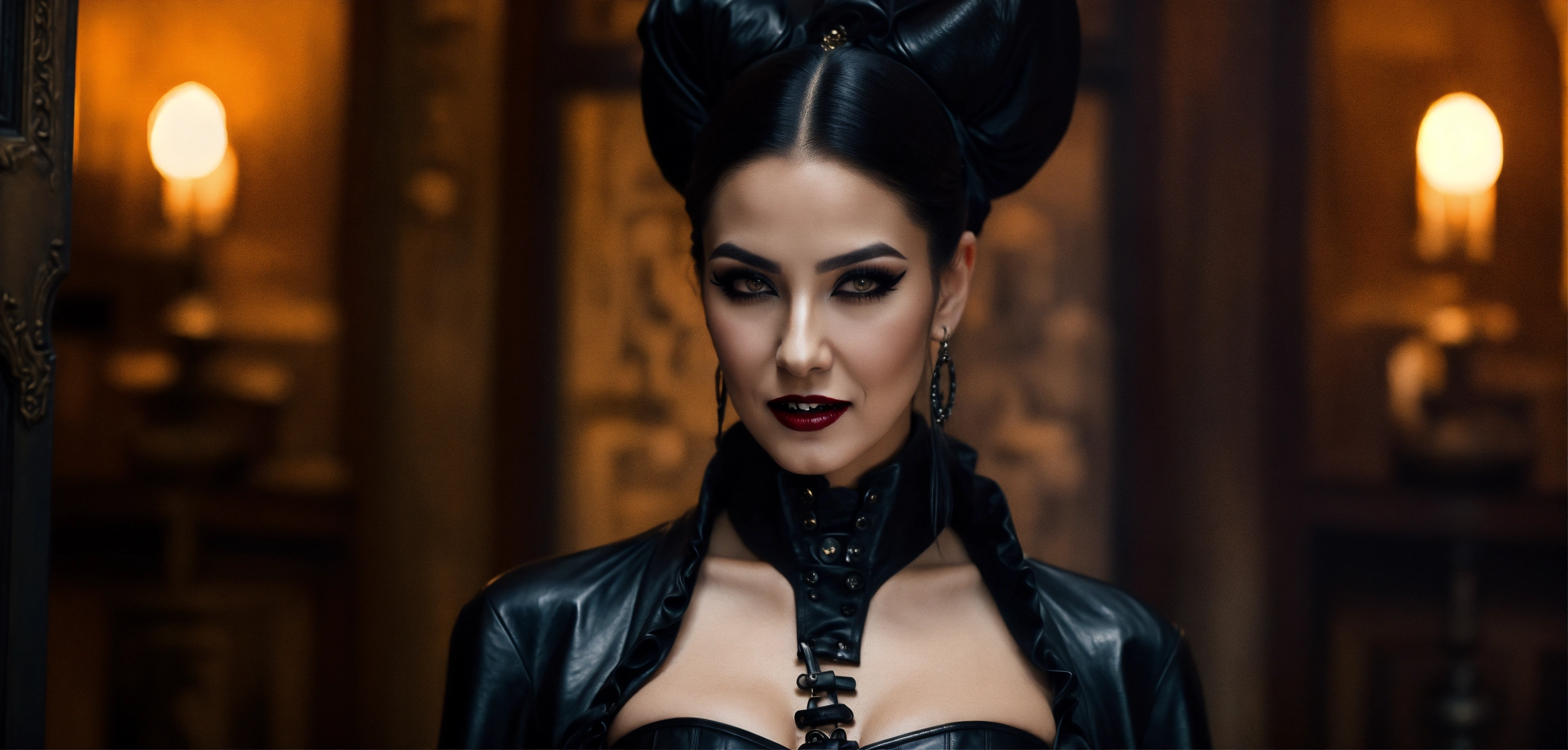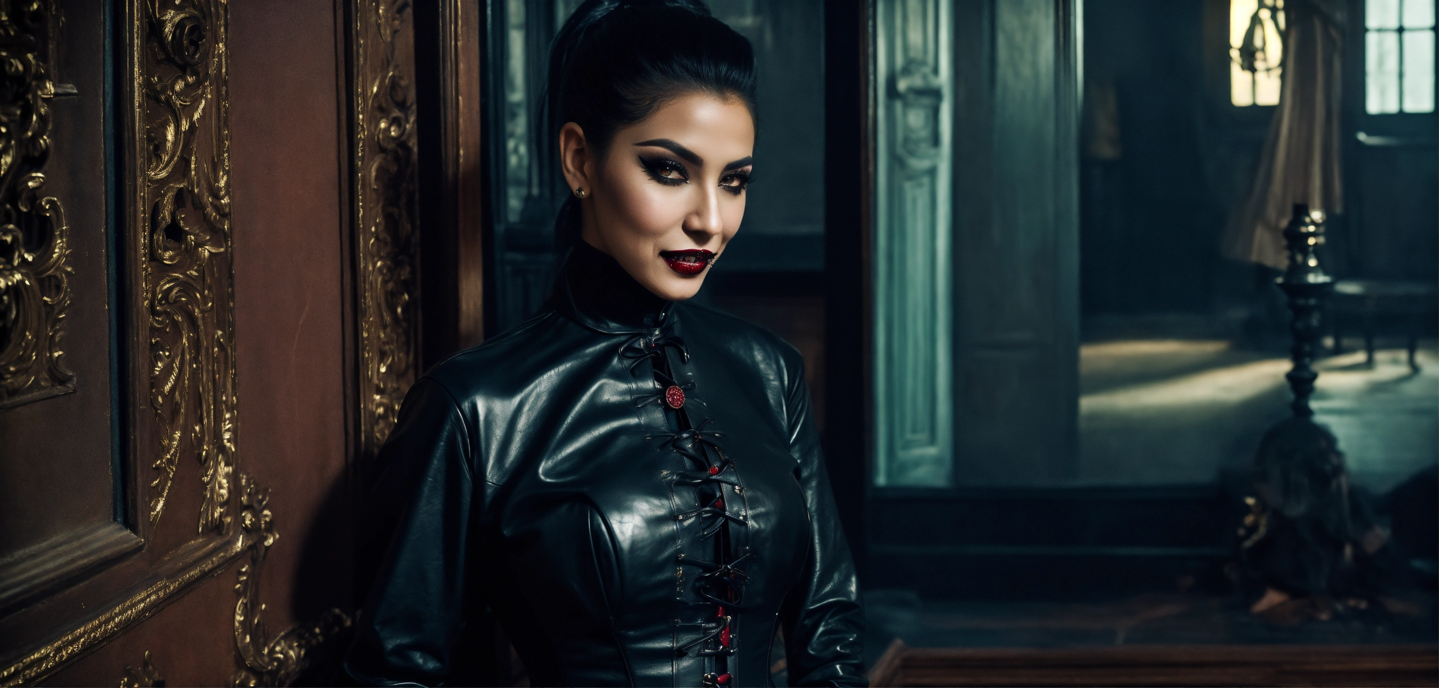 Cinematic look, stunning arab seductress woman fashion model, arrogant evil smile from above showing vampire teeth, black straight hair very high ponytail, black leather corset, long strict victorian governess wide black long leather shirt dress with long big puff sleeves and big buttons, mansion hall by night haze, eyeliner makeup, underworld vampire movie style