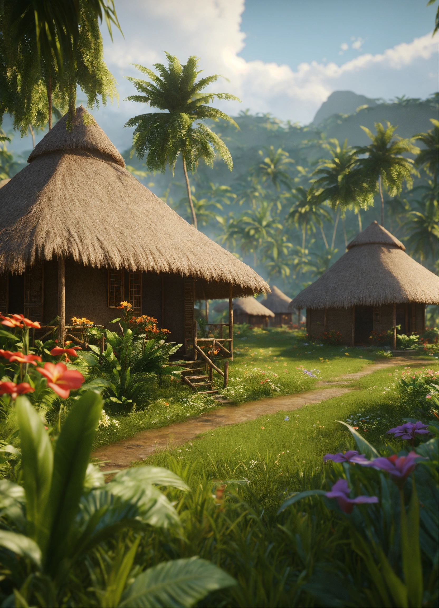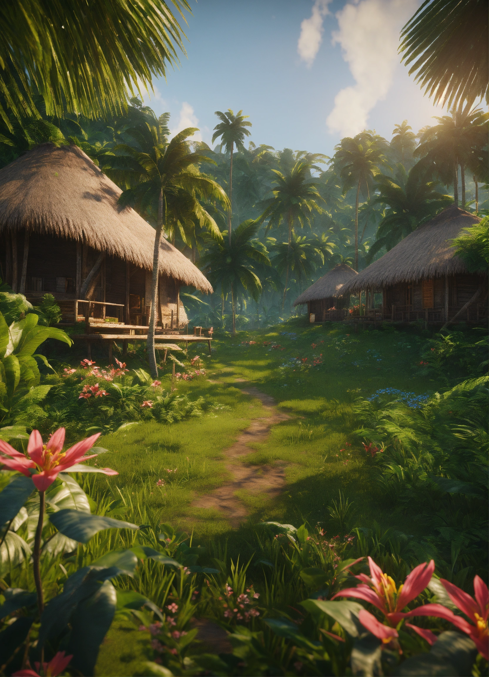 Massive open tropical landscape, tropical flowers, lush green grass. multiple basic man-made huts, hyper detailed 8k, unreal engine.