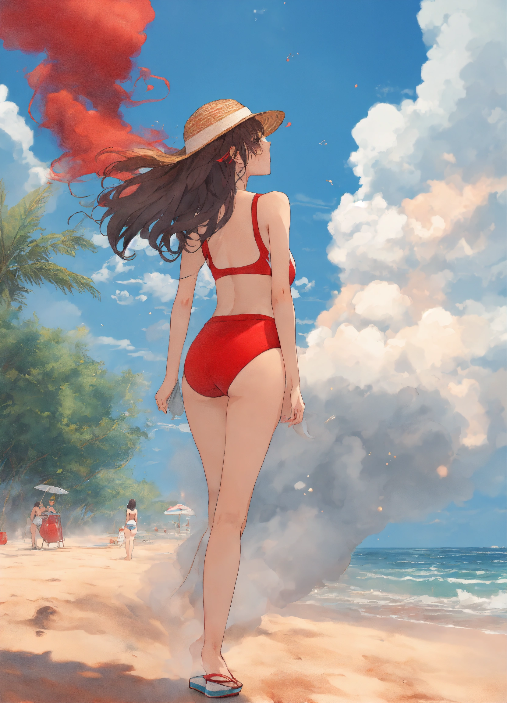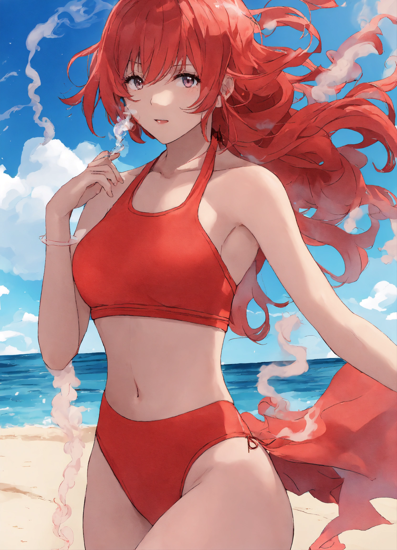 Anime picture of woman wearing red 2 piece swim suit and wedges blowing out blue smoke on the beach