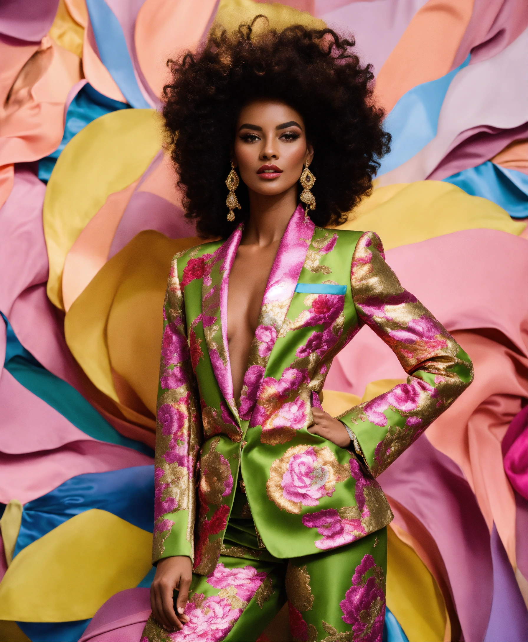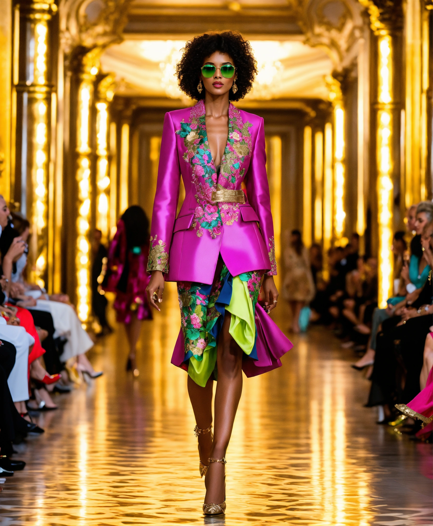 Ultra realistic full body photo of a stylish beautiful elegant supermodel voluminous wavy hair walking the runway modeling summer cruise designer wear brave, paris versailles details cutouts and gold geometric pattern floral structured tailored jacket pink gold green lilac peridot silver magenta lime fuchsia yellow blue black gray copper mauve bronze haute couture embroidered contrasting colors vivid intricate bold vibrant glamorous ultimate elegance beautiful luxurious awesome wealthy opulent exquisite resplendent sheen magnificent sublime 12k