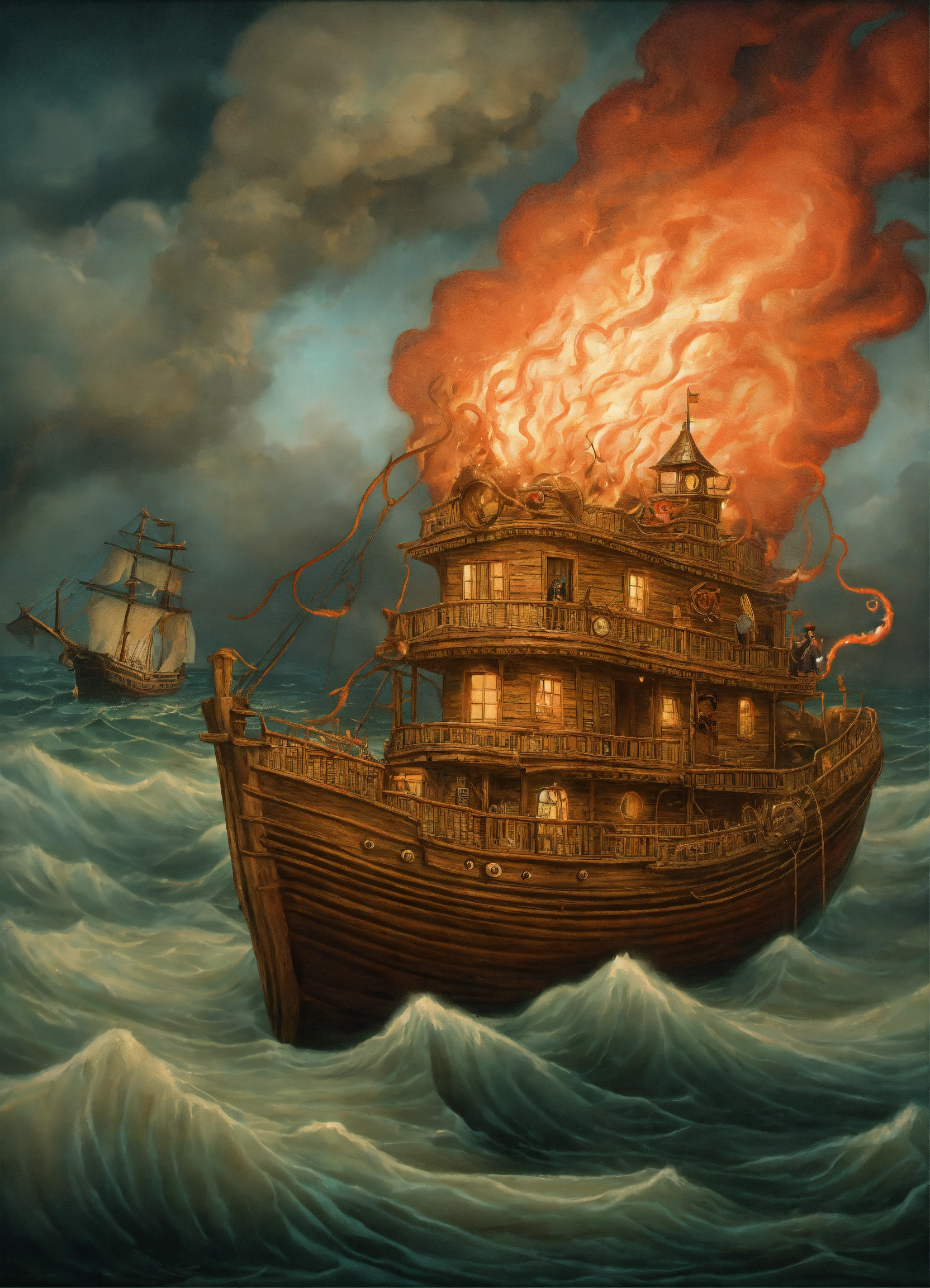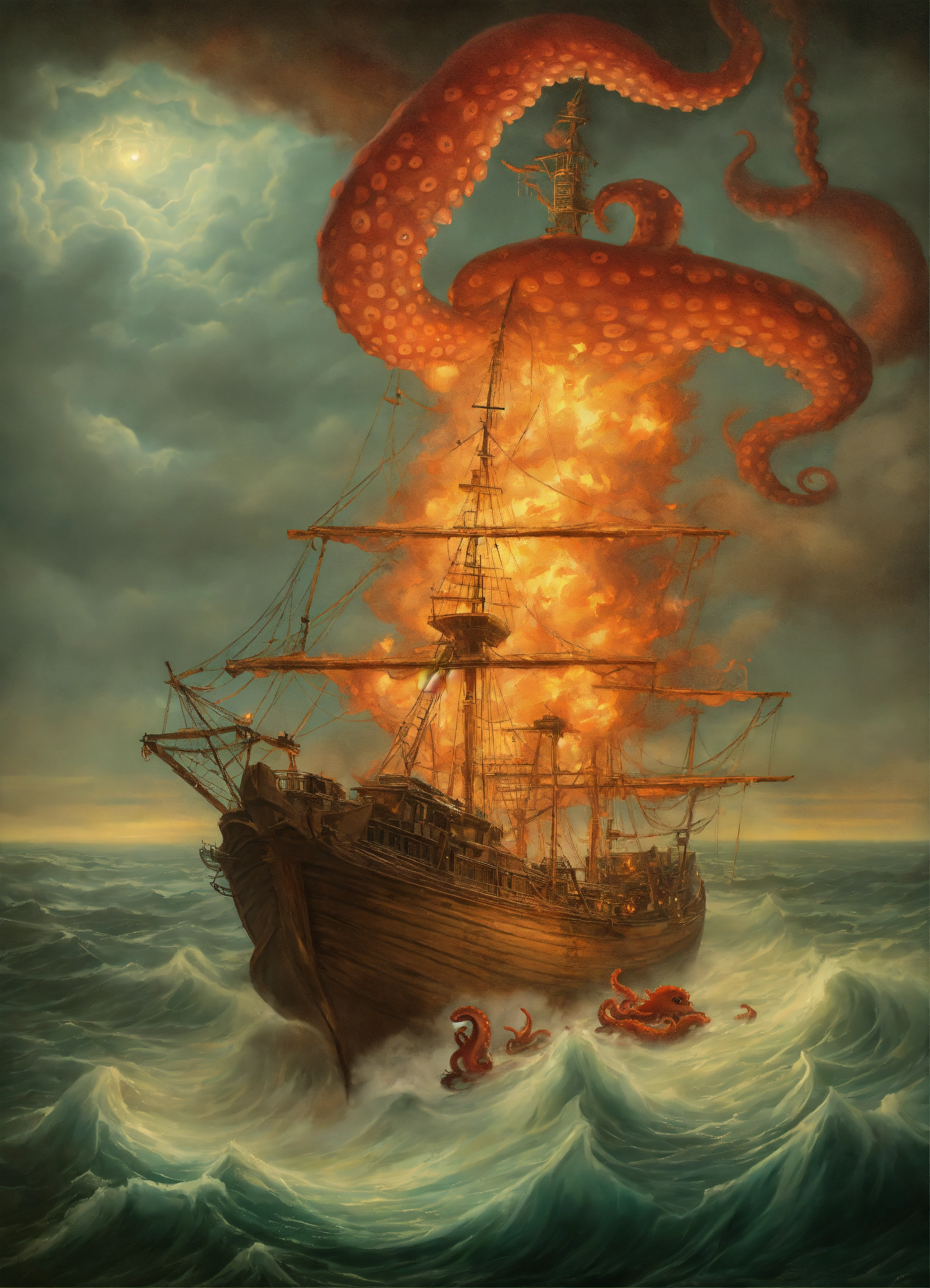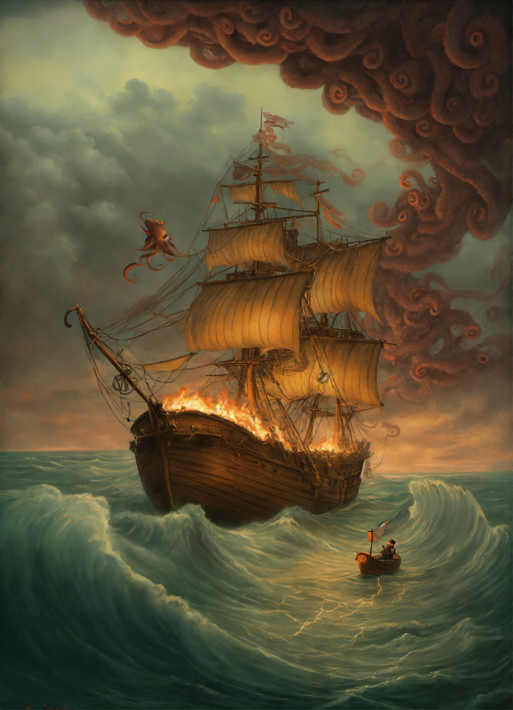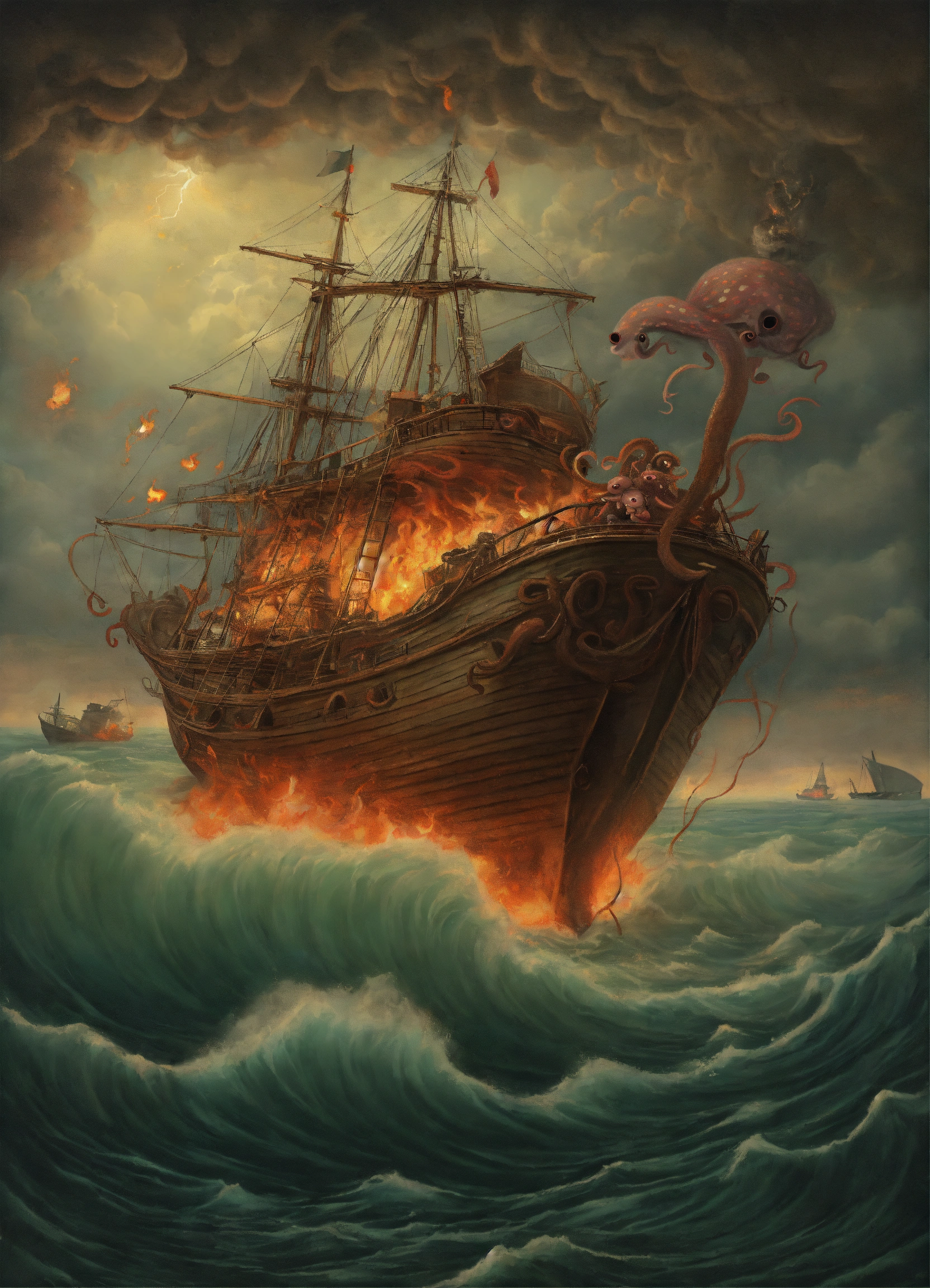 Giant creep octopus in a stormy sea with tentacles wrapping a old wooden ship in flames and lightning in the sky by mark ryden