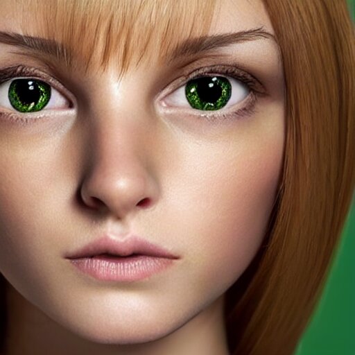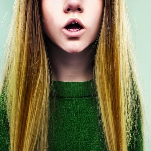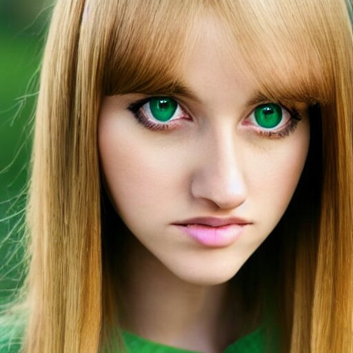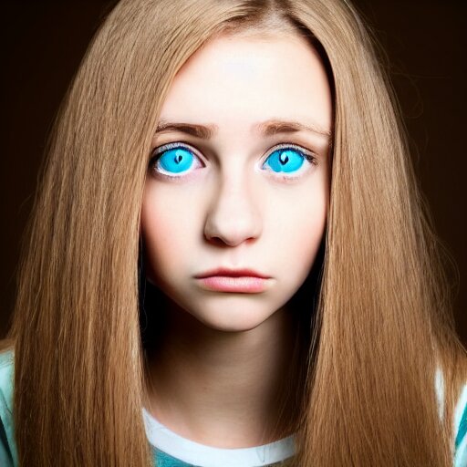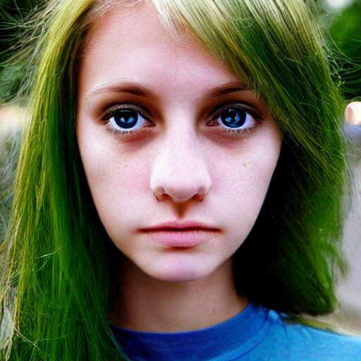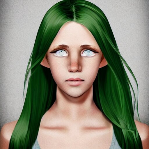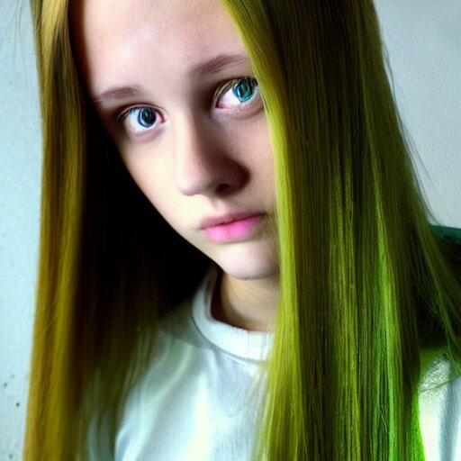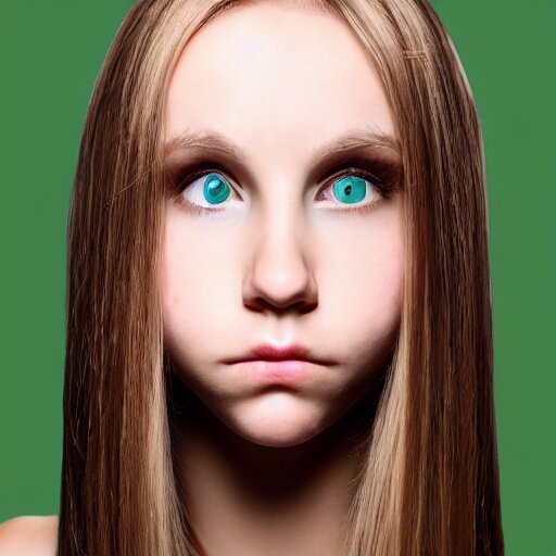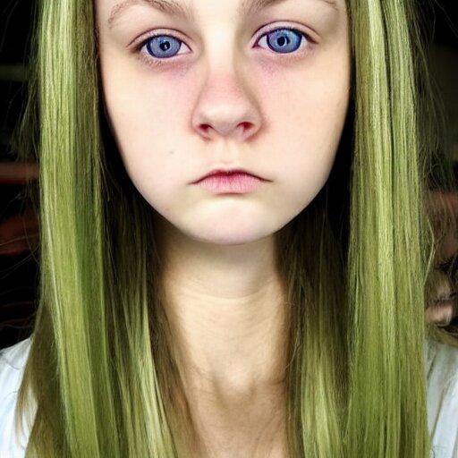 Brunette with dyed blonde hair, 15 years old, 155 cm tall, long flat hair, blonde, green big eyes, small nose, small mouth, round shaped face, big forehead, lop eared, full body shot, thin eyebrows, real life photograph