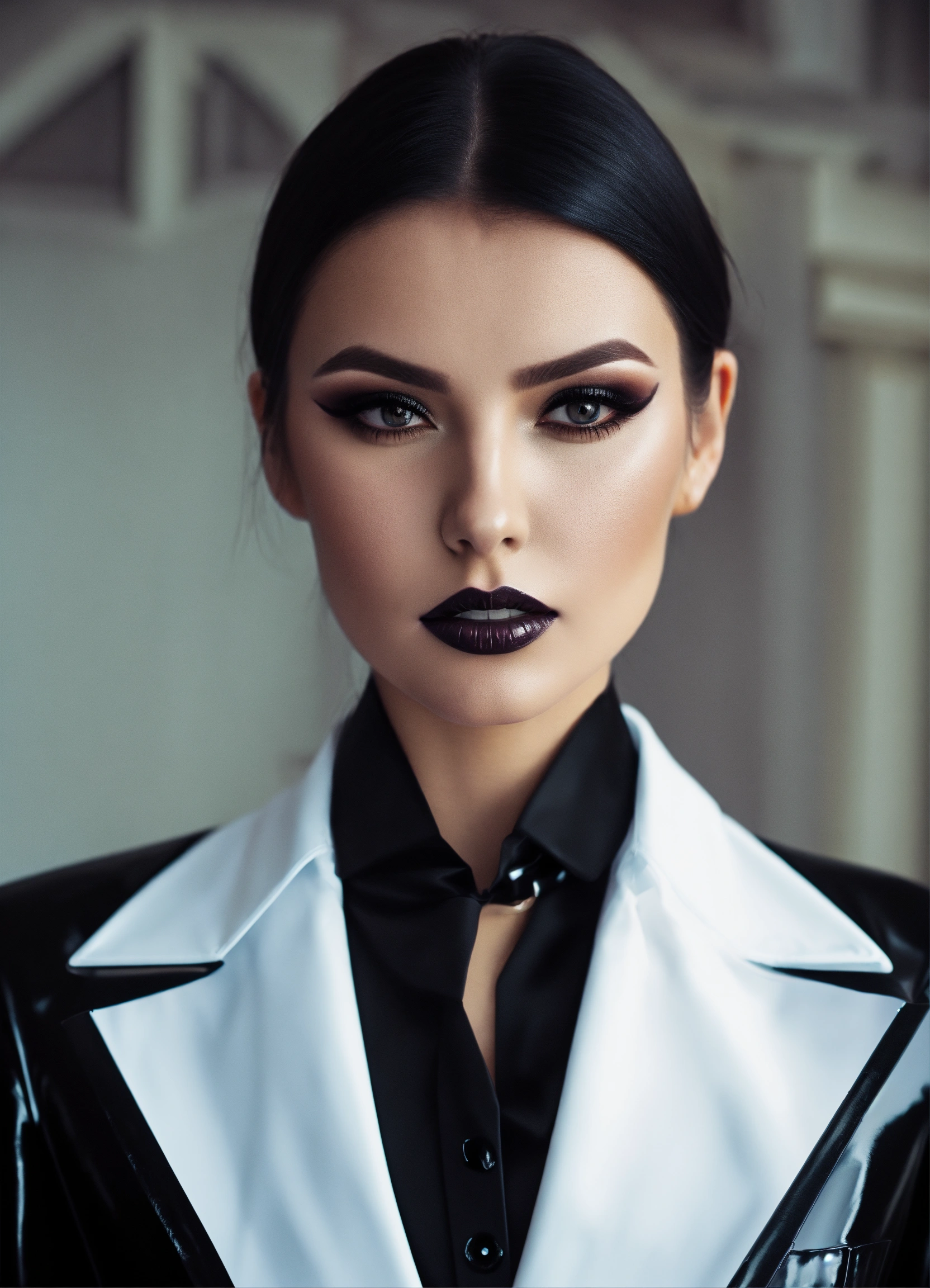 Stunning caucasian woman model, wearing business suit, black pvc latex business blazer and black pvc skirt, white shirt and black necktie, makeup, castle room, straight black hair.
