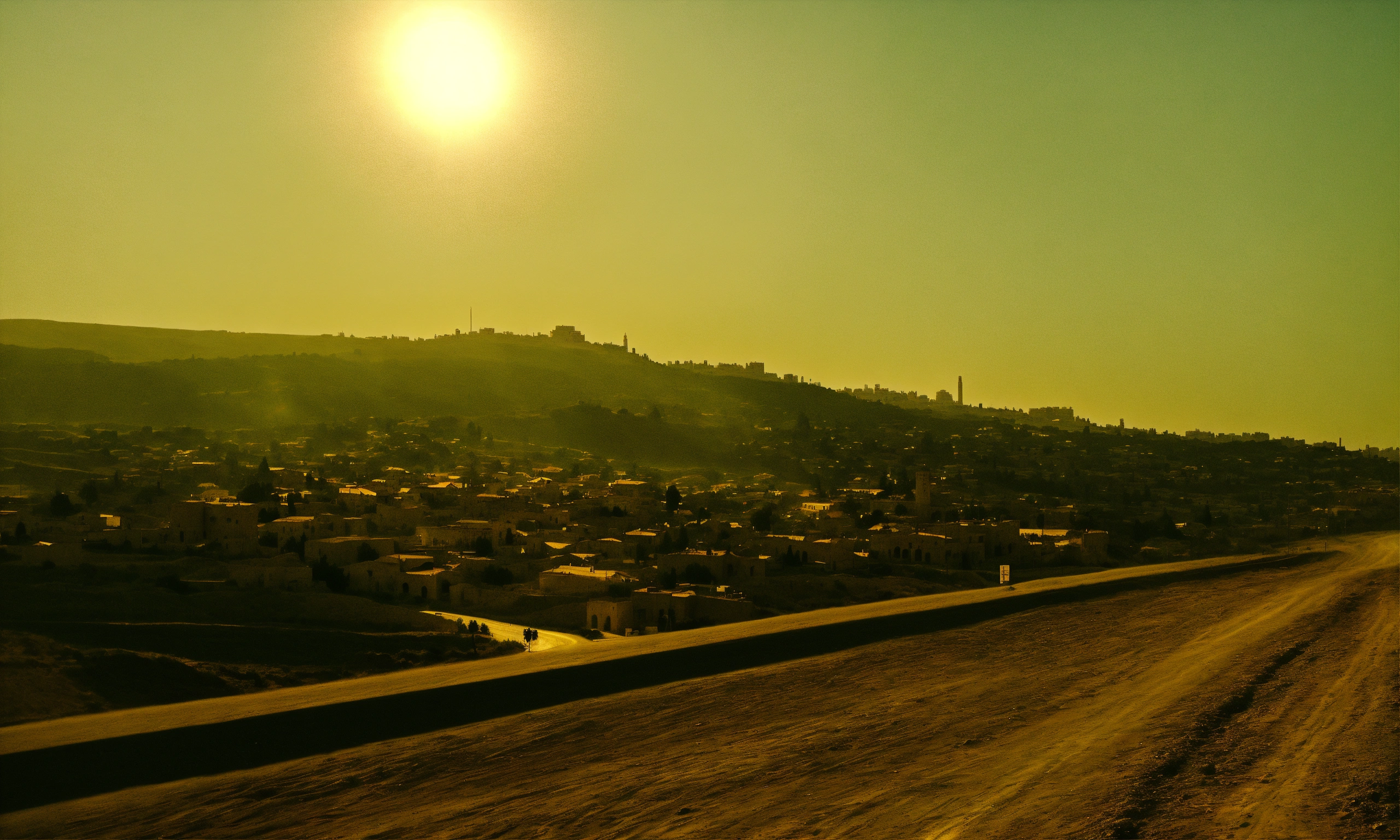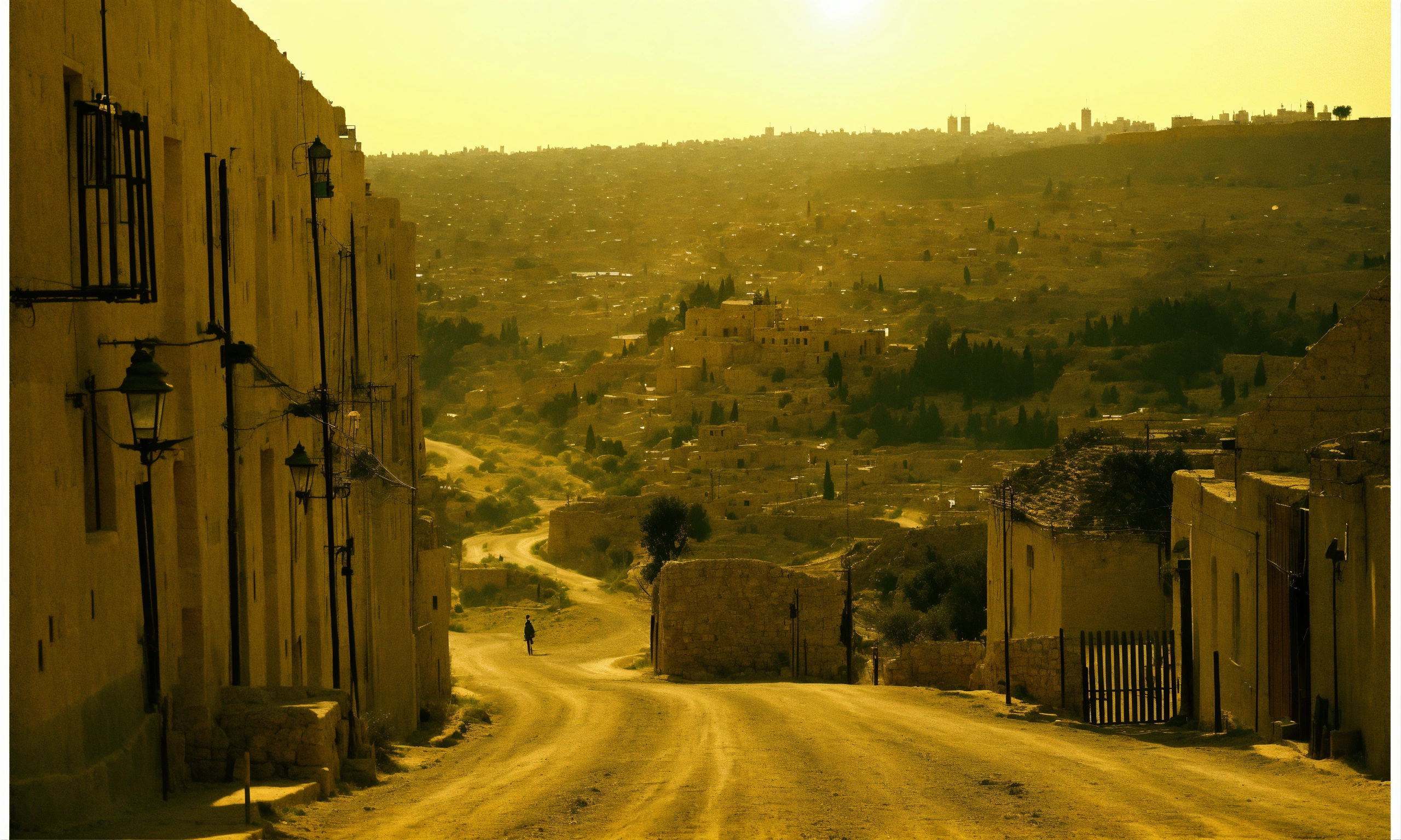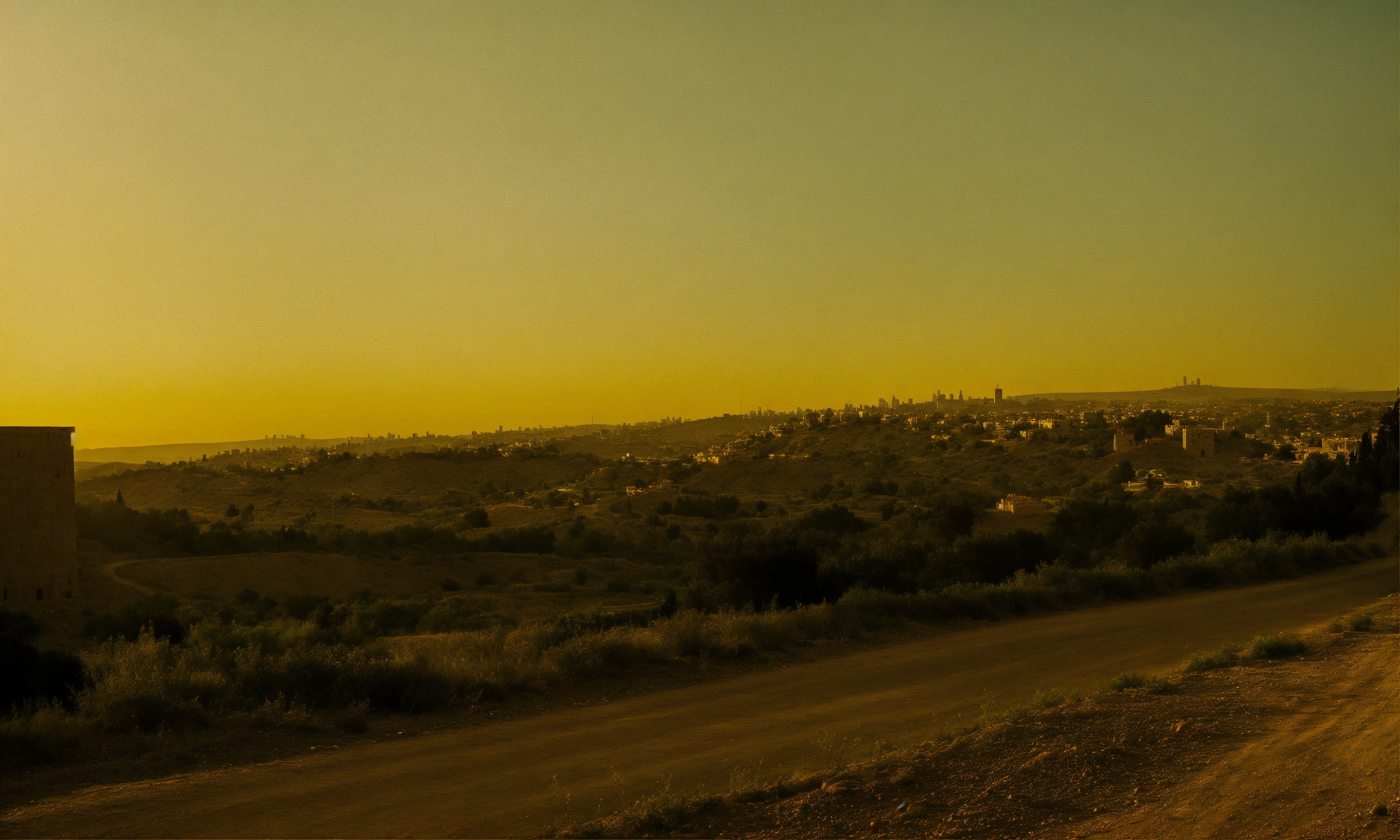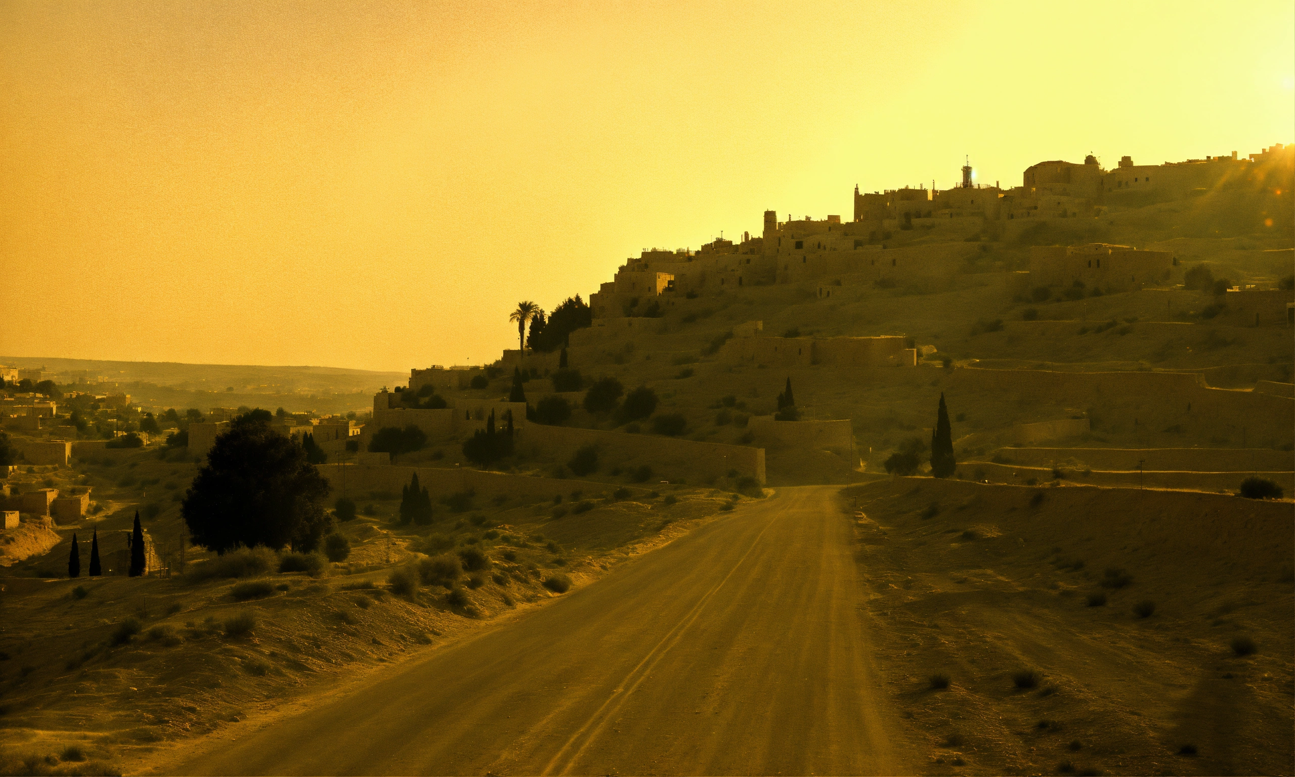 Dirt road heading south into palesine from lebanon, 1940s, no people, no vehicles, empty road and scenery, the done of the rock and city buildings present in the distance (about a mile and a half away. the sun is to the right side, barely in the picture. cinema quality. photo quality. sharp image and crisp lines to image. sony a74 iv quality. raw image quality. no vehicles are present. animated art type.. sunrise. approaching jerusalem, the city is taking up the view in front.