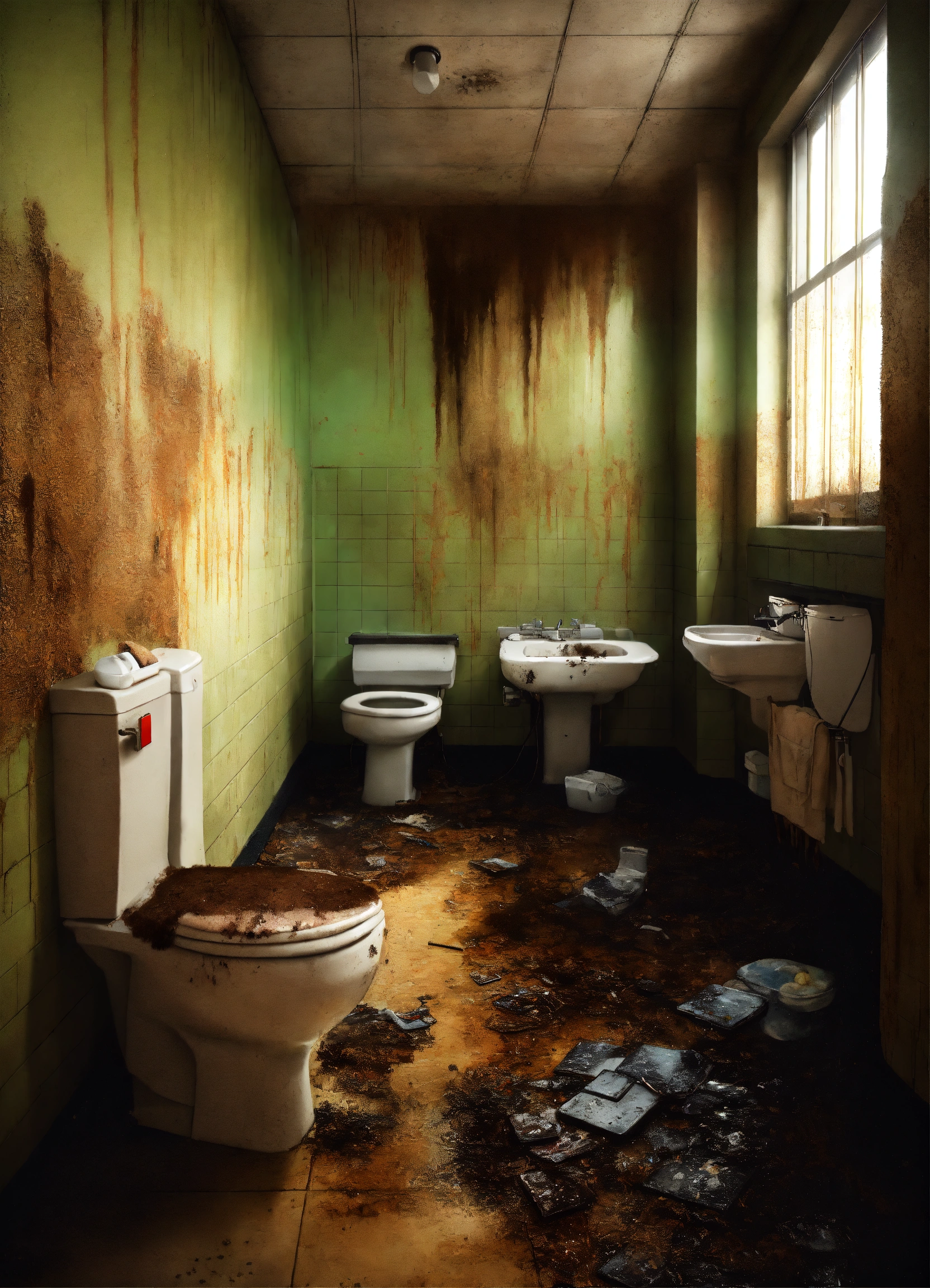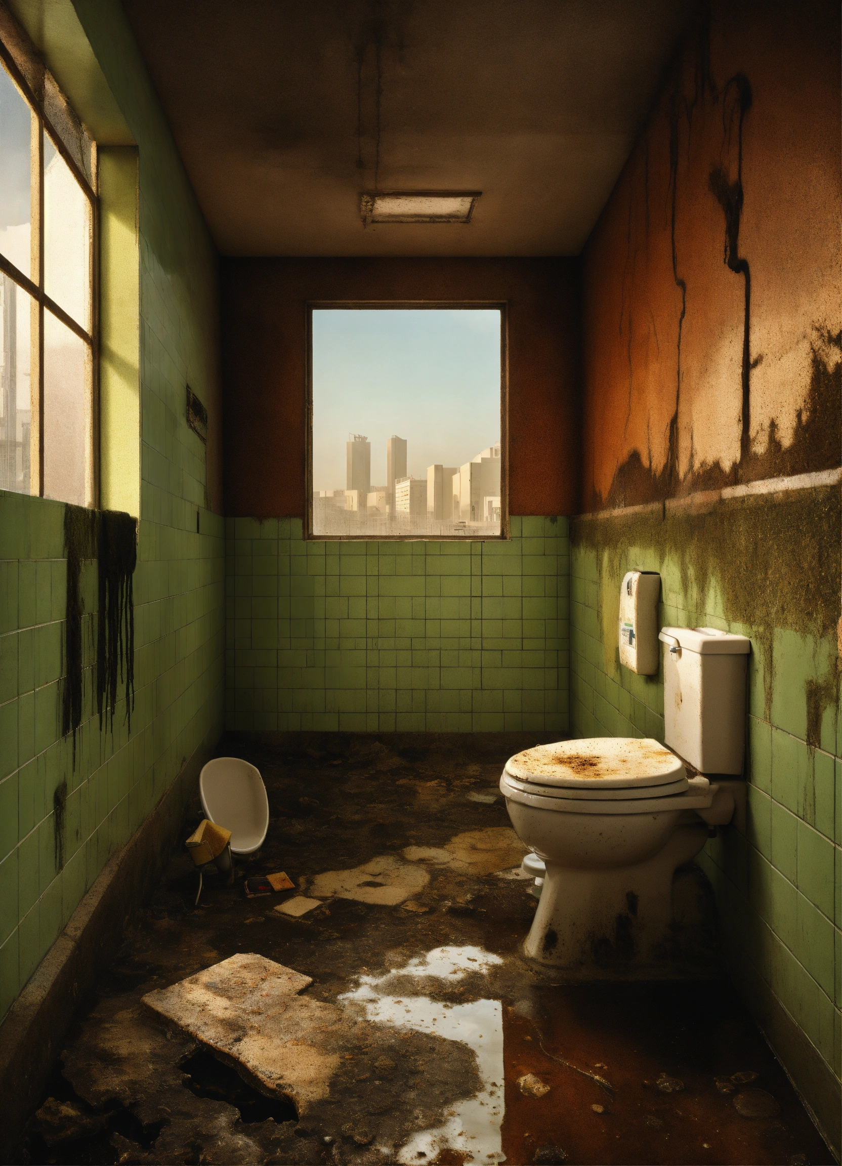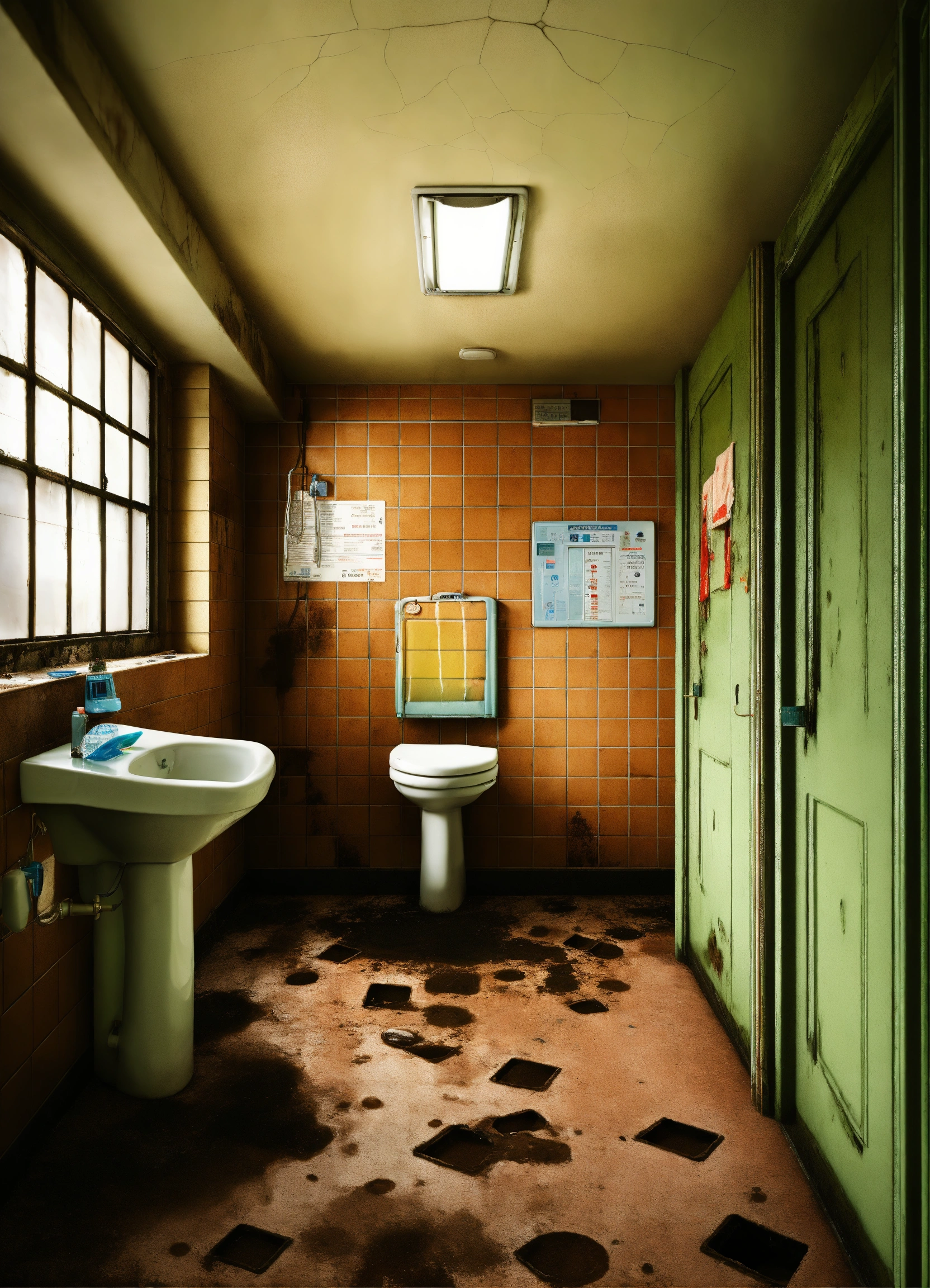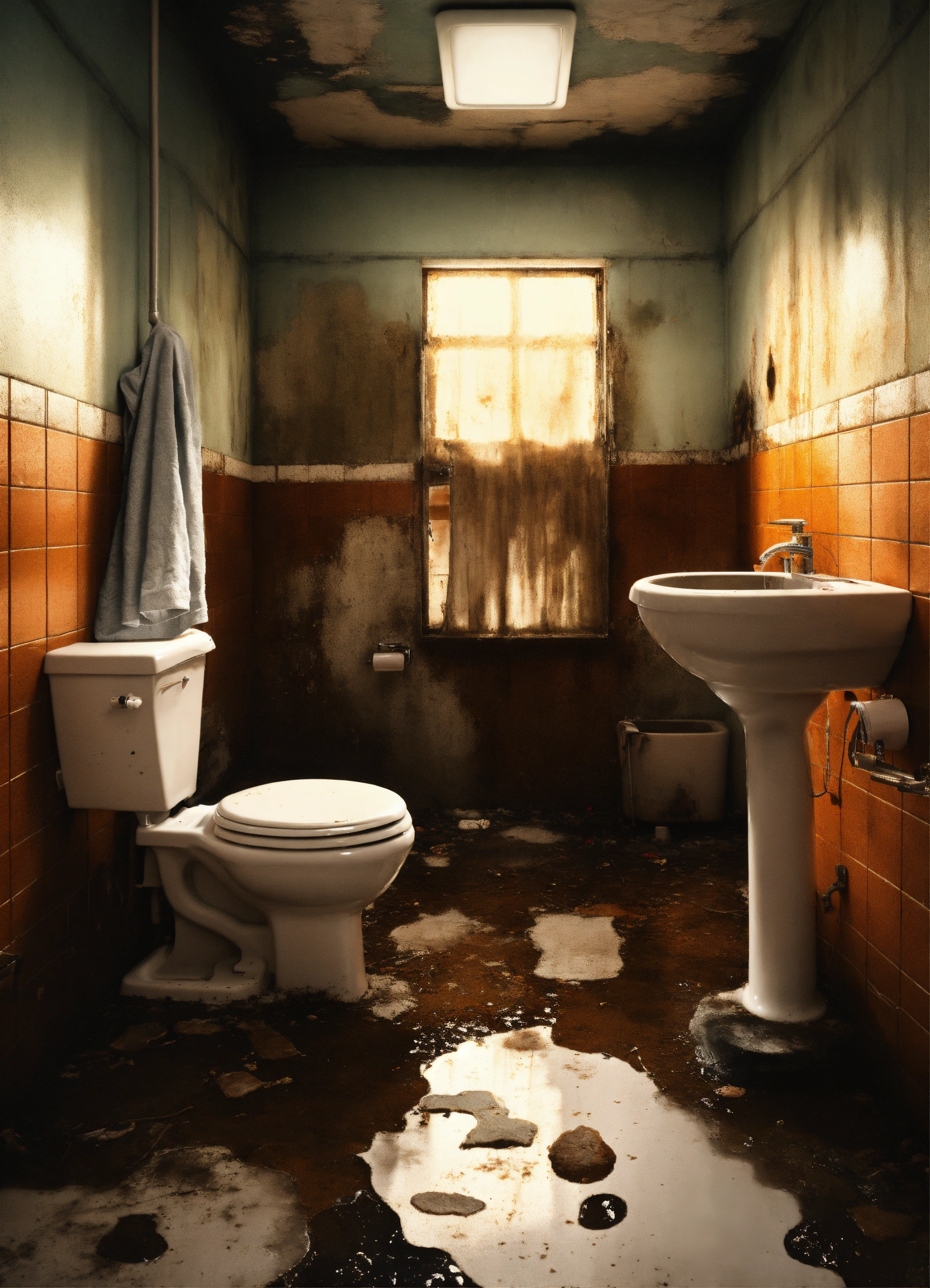 Photo realistic, eery, dark, moldy, criminal nurse ghost, hospital, hair black, modern architecture, swampy, spongy mattress, kuwait hospital, skin disease, fungus, broken tiles shiny, toilet, rust, dust