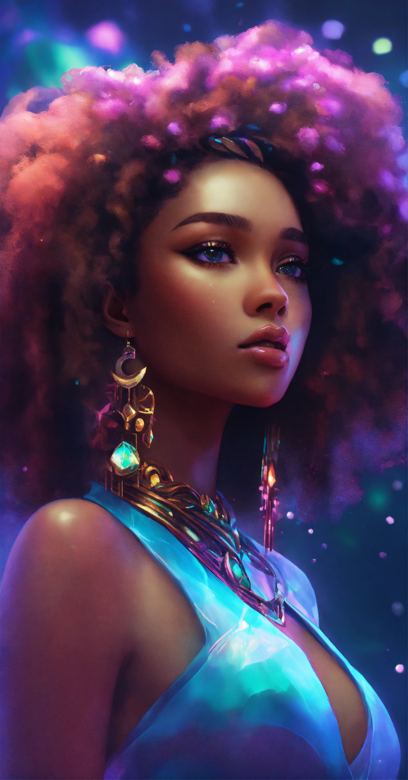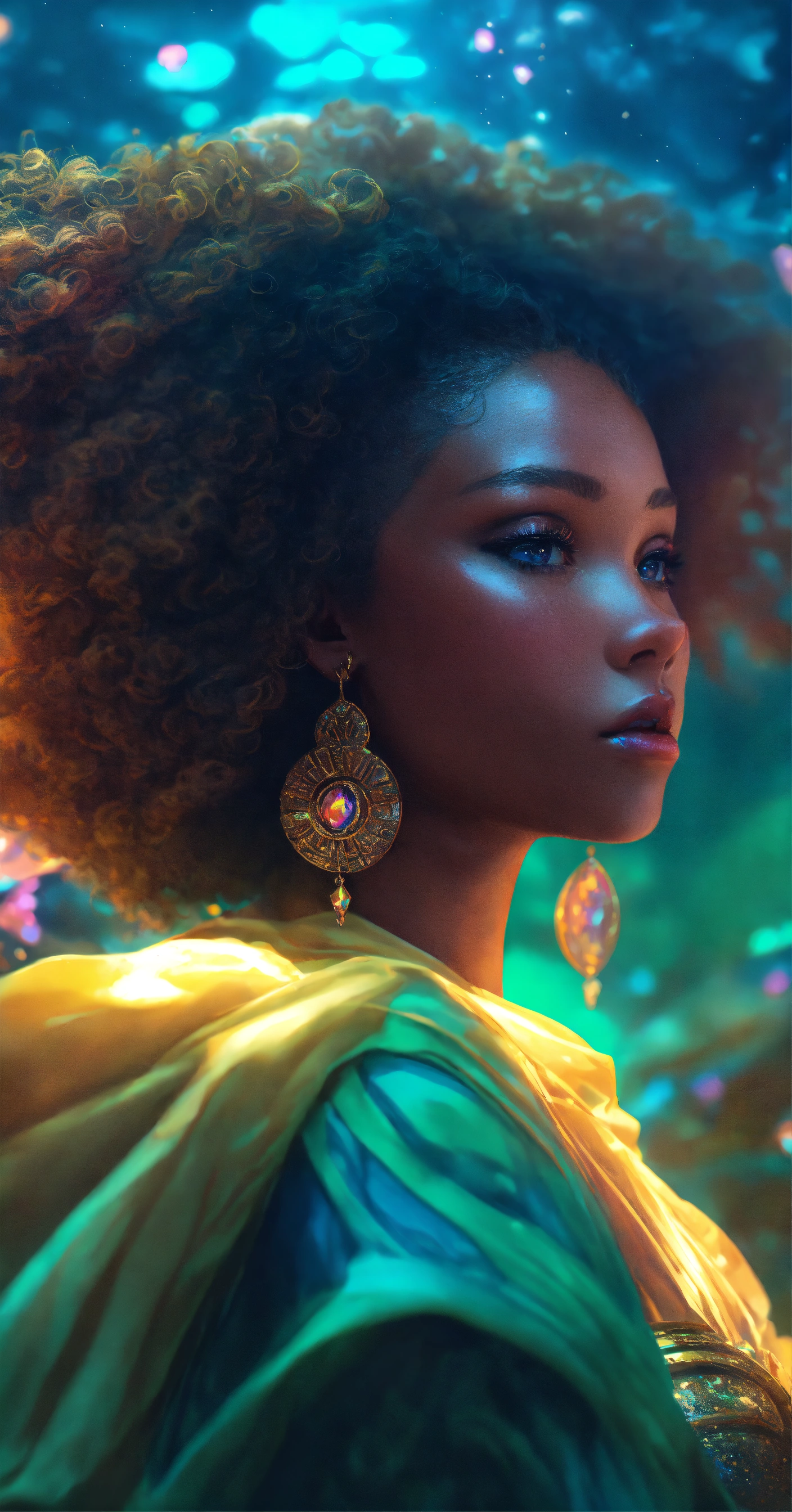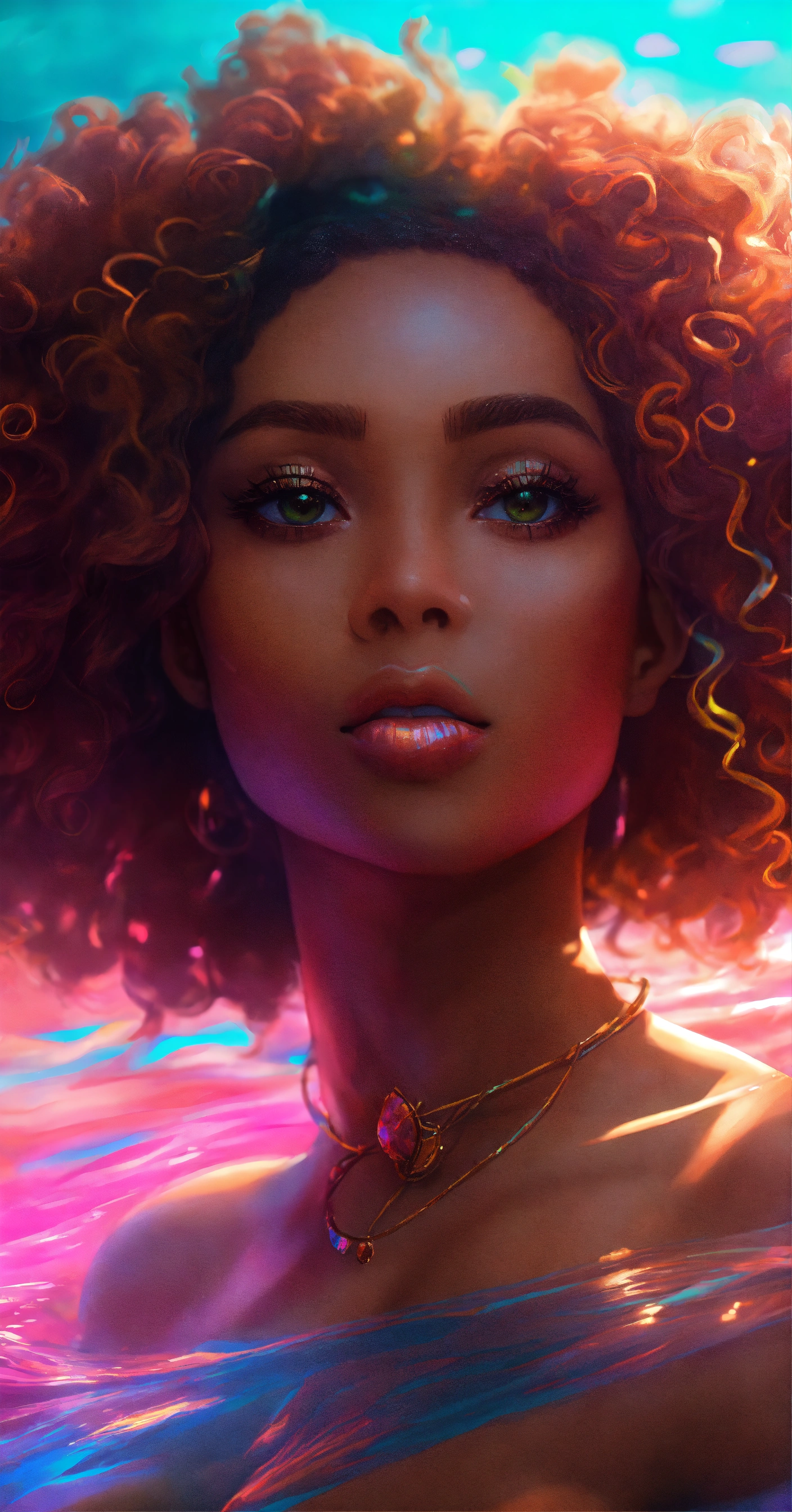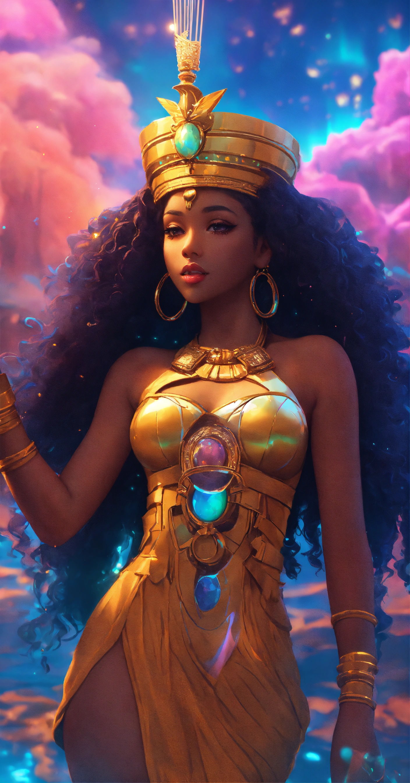 Cute waifu, afrocentric, phantasmal mystical queen, pretty, royalty, cute, pretty, adorable, majestic, beauty, fantasy, pop surrealism, masterpiece, cinematic, aurora borealis, zbrush, inspired by beeple, beauty, opalescent, opal, transcendant. vaporwave aesthetic, smooth, sharp focus, art by artgerm, underwater, sureal beauty, cleopatra, captivating, energy, motion blur, lovely curly hair, warm skin tone, bold, attractive, brown tan glow.