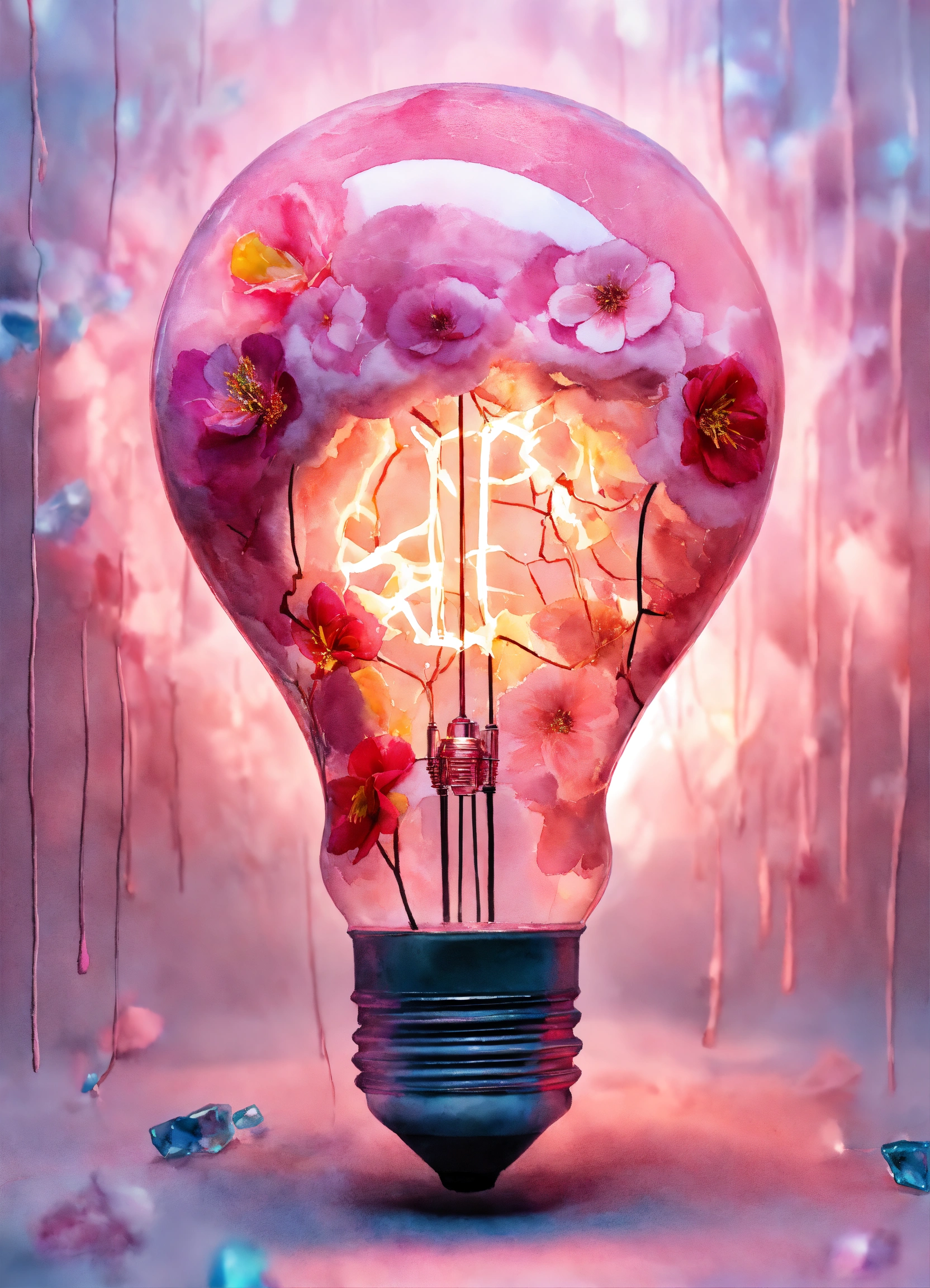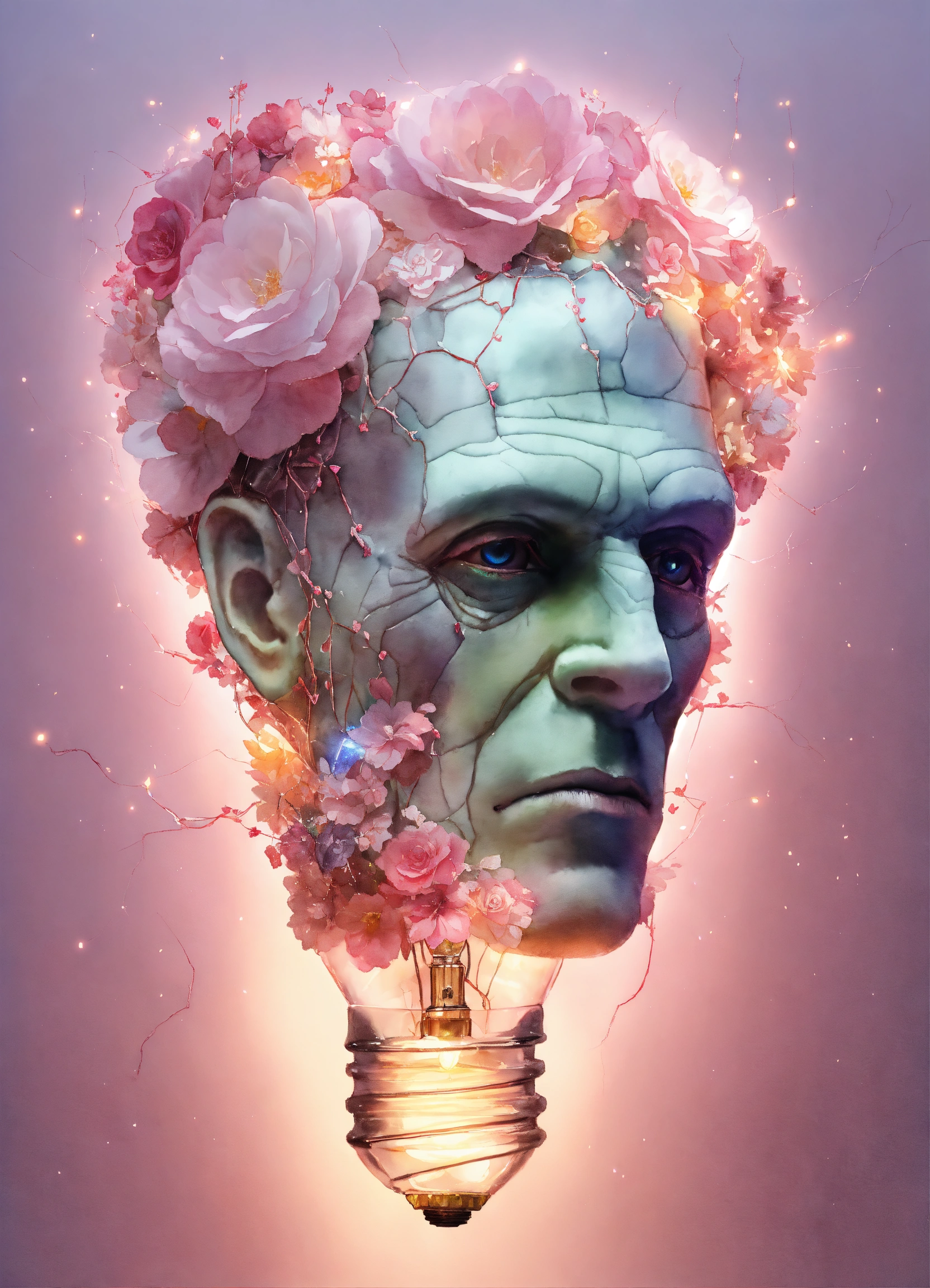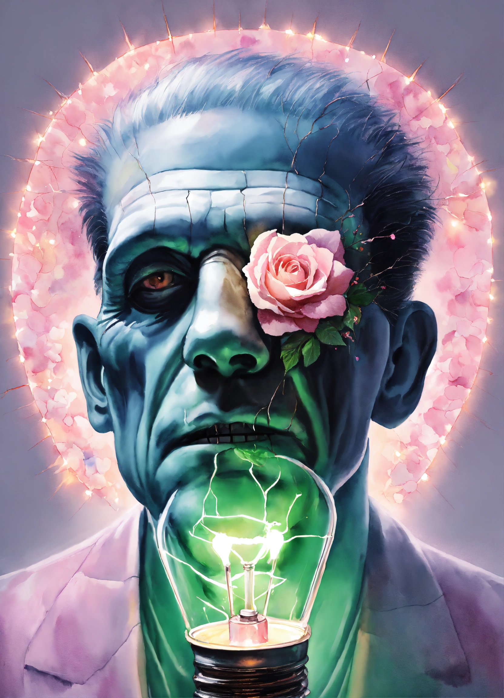 Pastel light pink frankenstein inside, edison lightbulb heart shaped, hyper hyperrealistic hyperulticolored, florals inside, sparks, electricity, sharp image, painting, watercolor, fractal gems, white background
