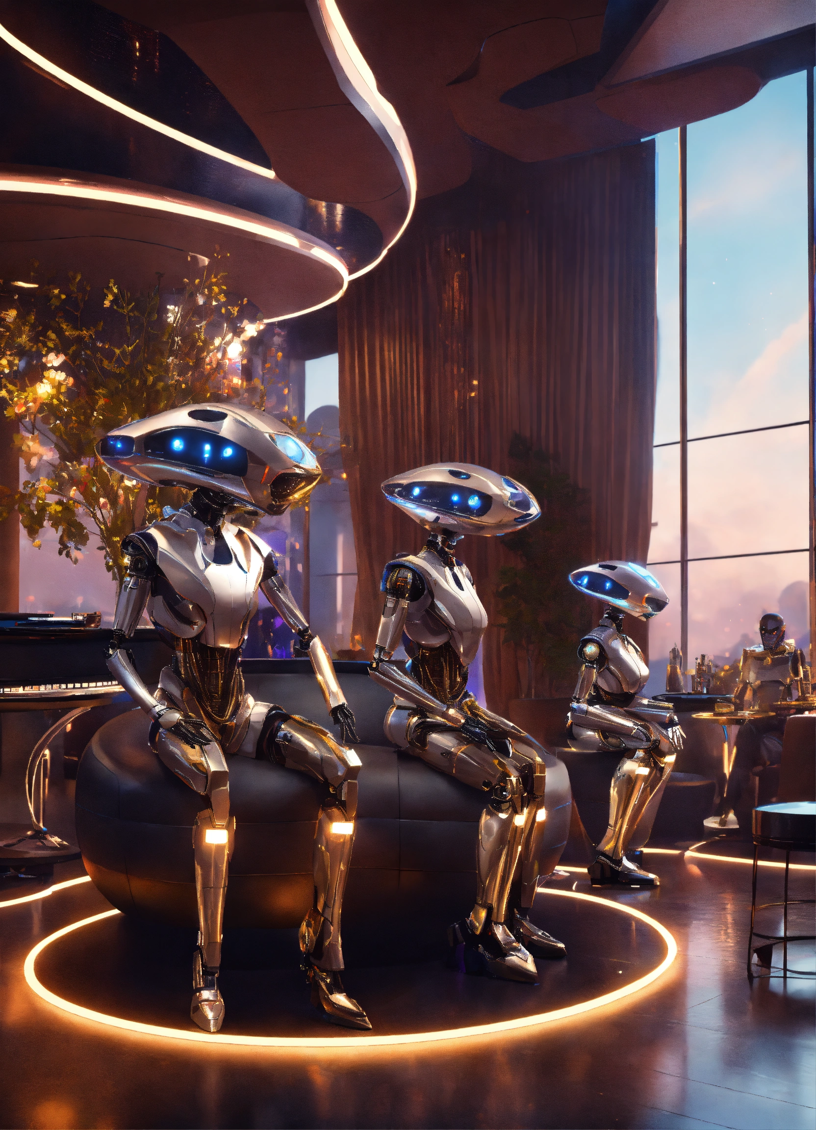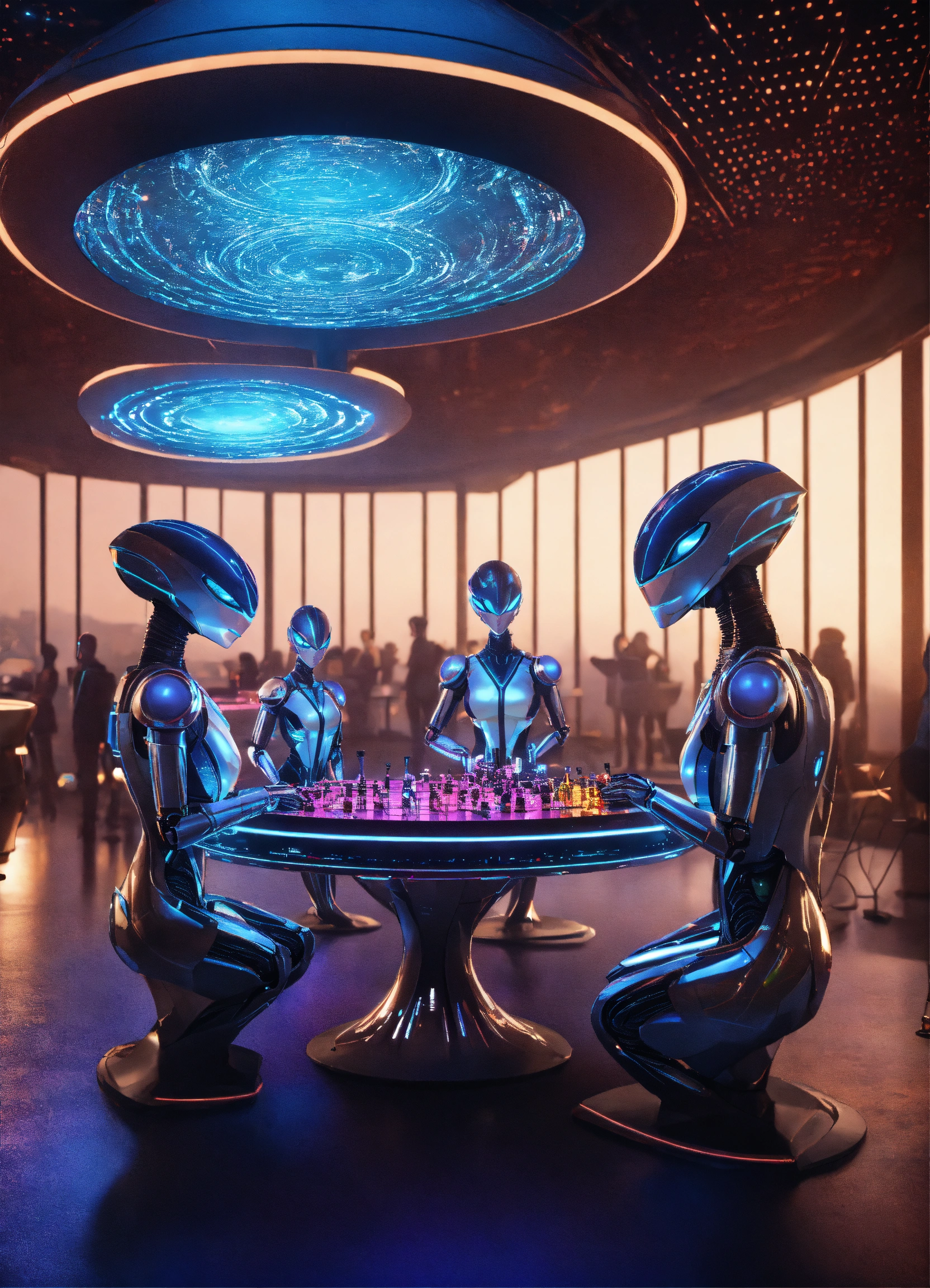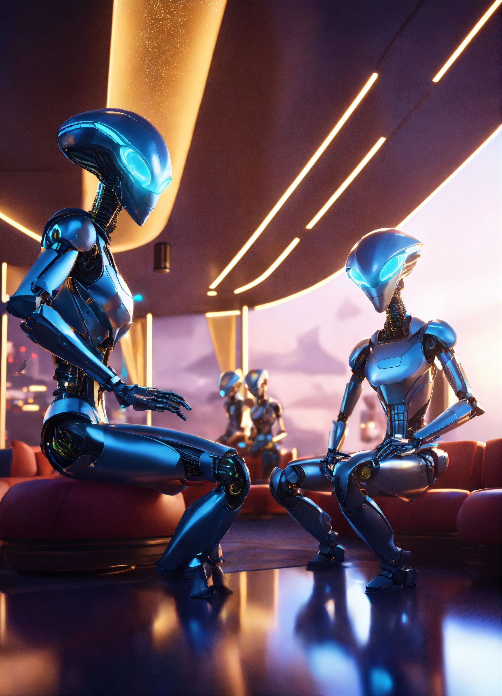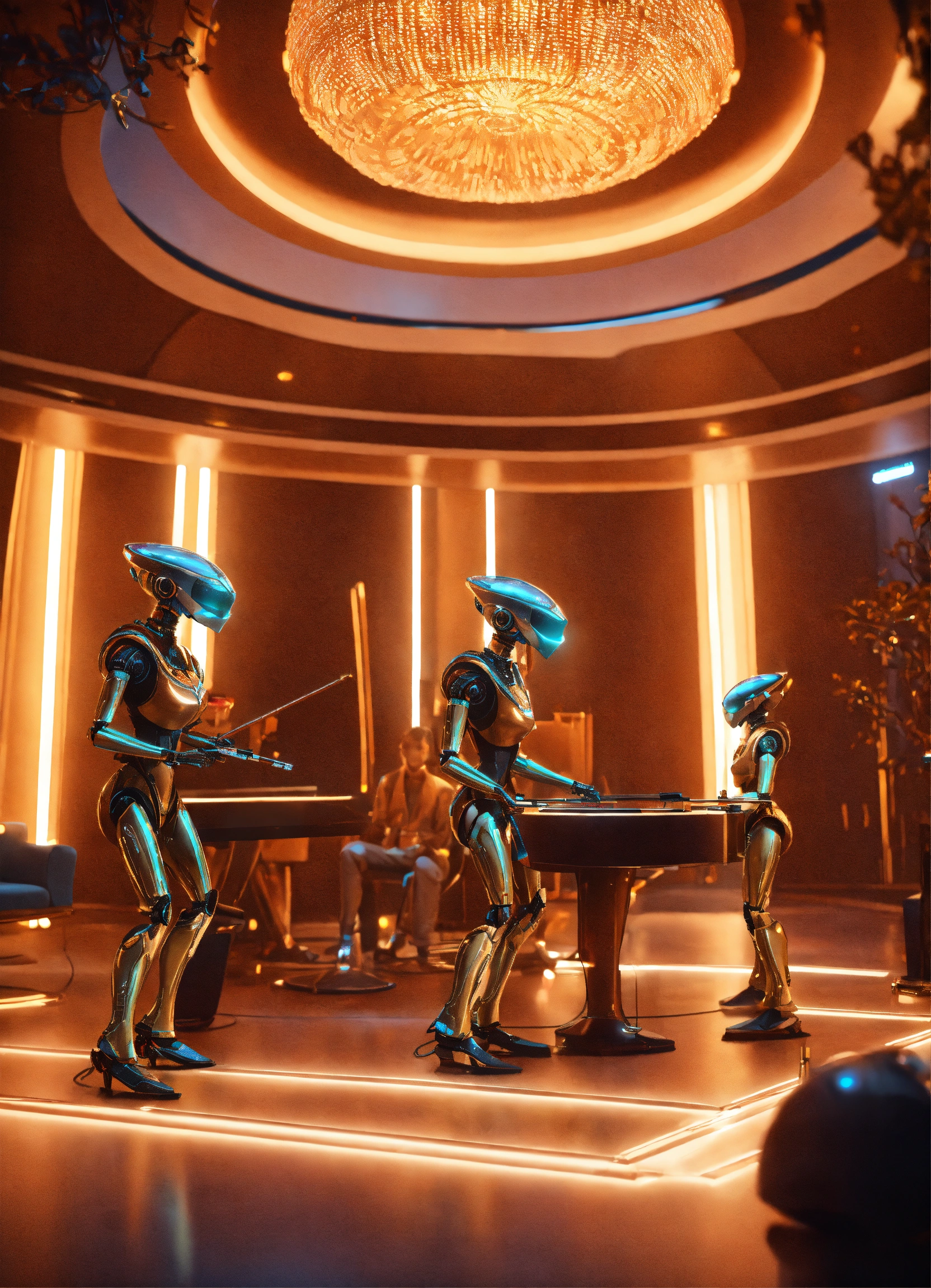 Band of 4 alien robots playing hypnotic music to a crowd of people in a luxury space port lounge reception area, realistic, futuristic, sci-fi, 8k, unreal engine, pixar, disney, zaha hadid