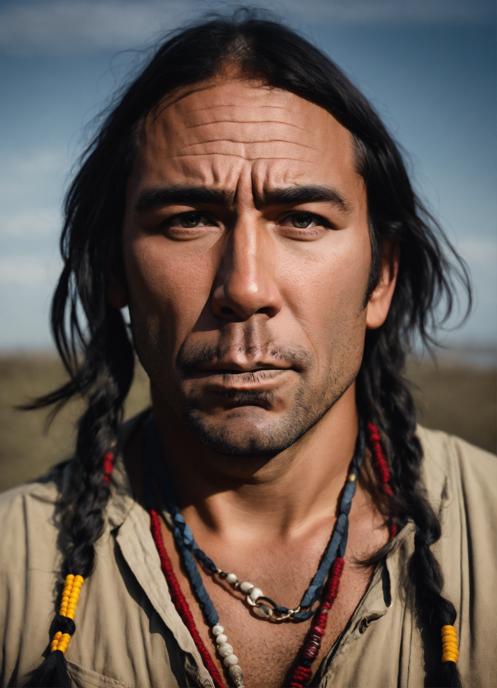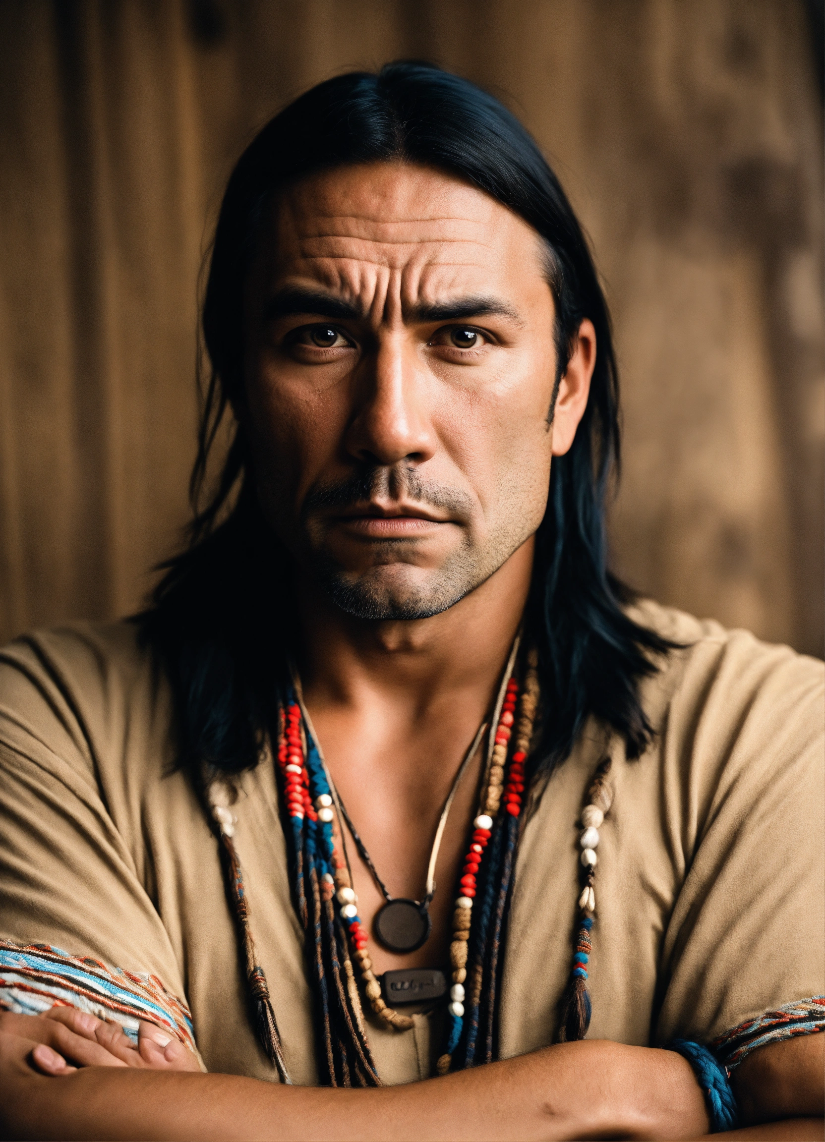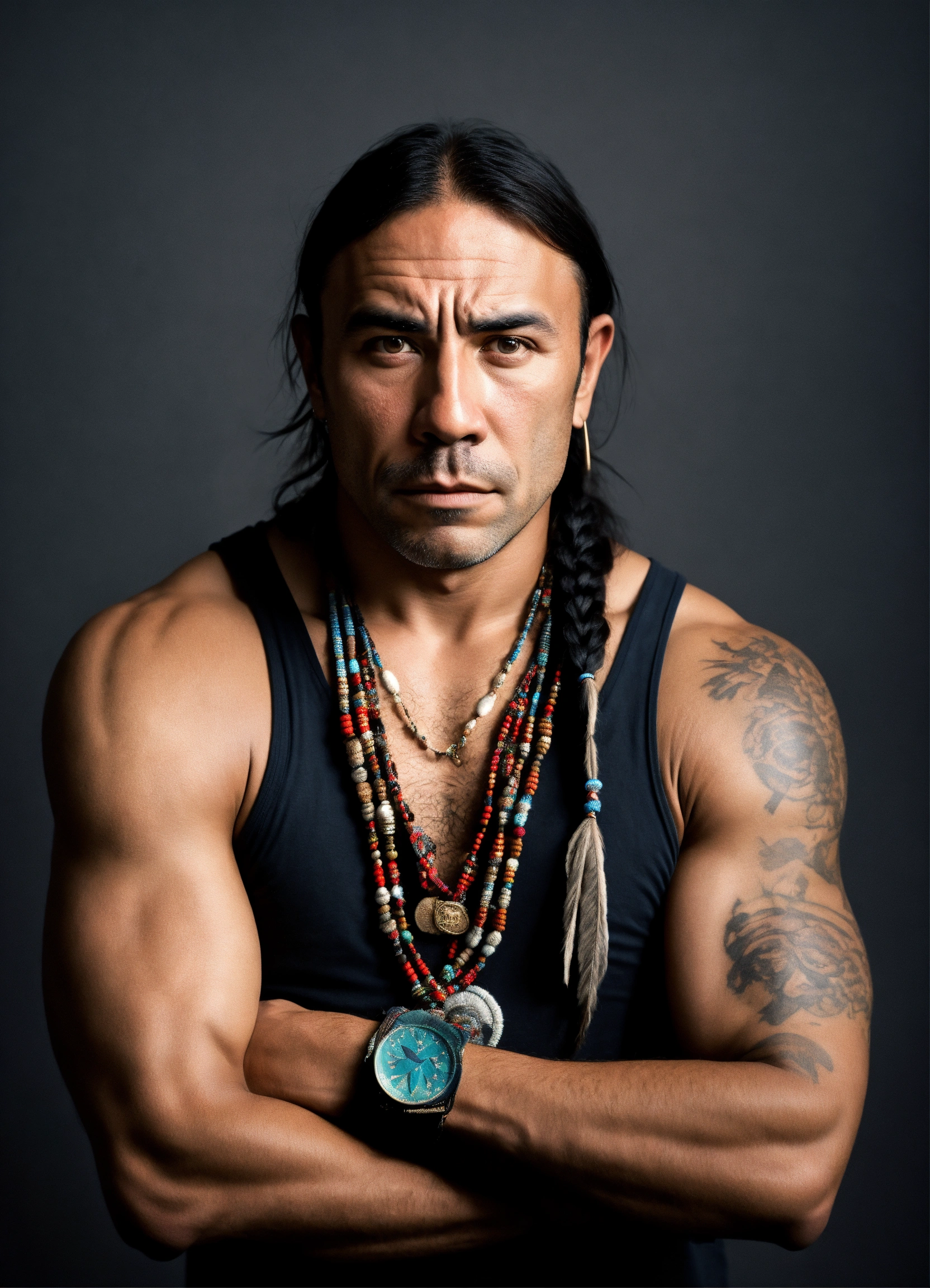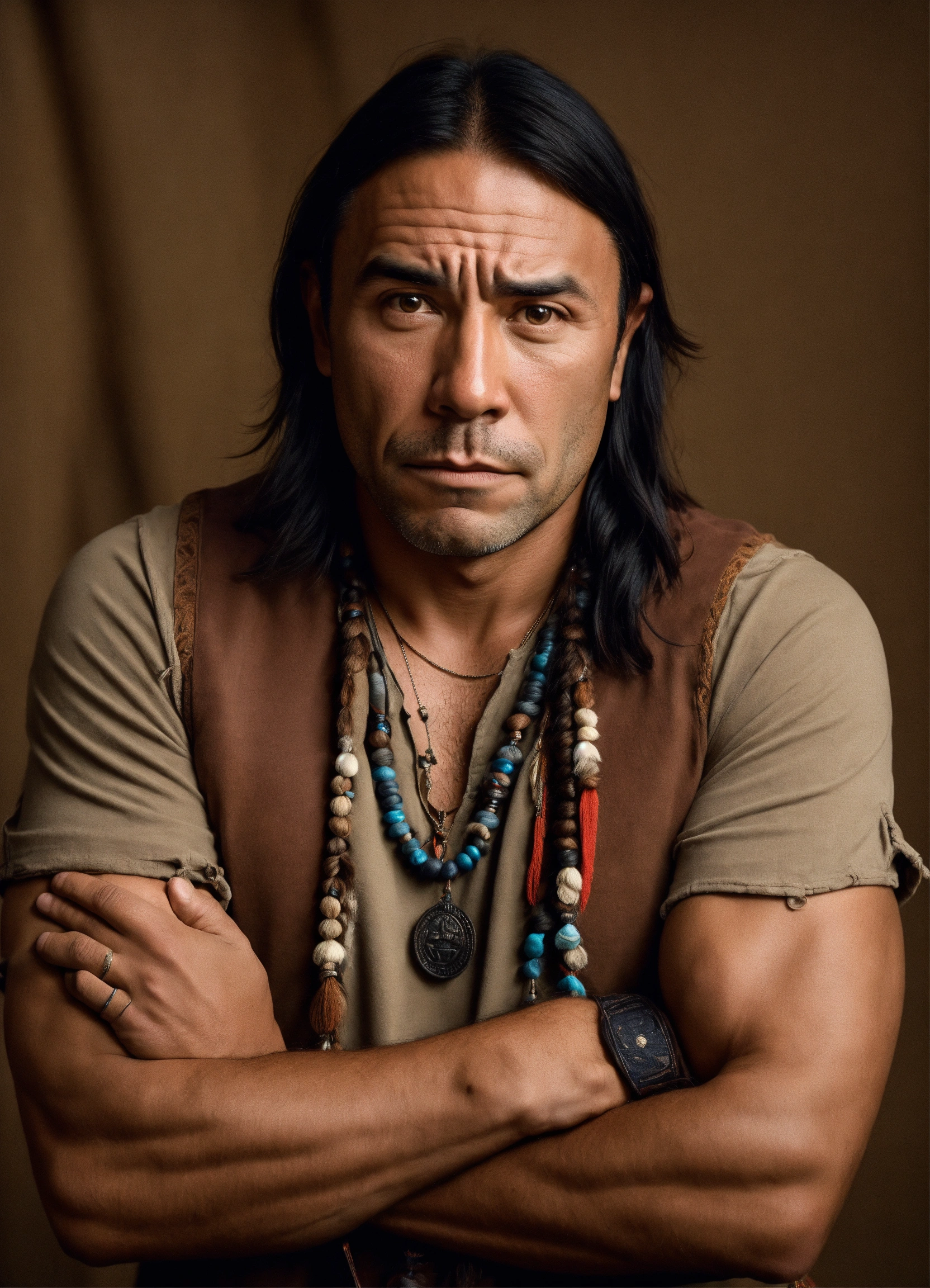 Scared native american man, front view, casual clothes, arms crossed, looking at the camera, unique facial features, unique facial characteristics, joe rogan lookalike