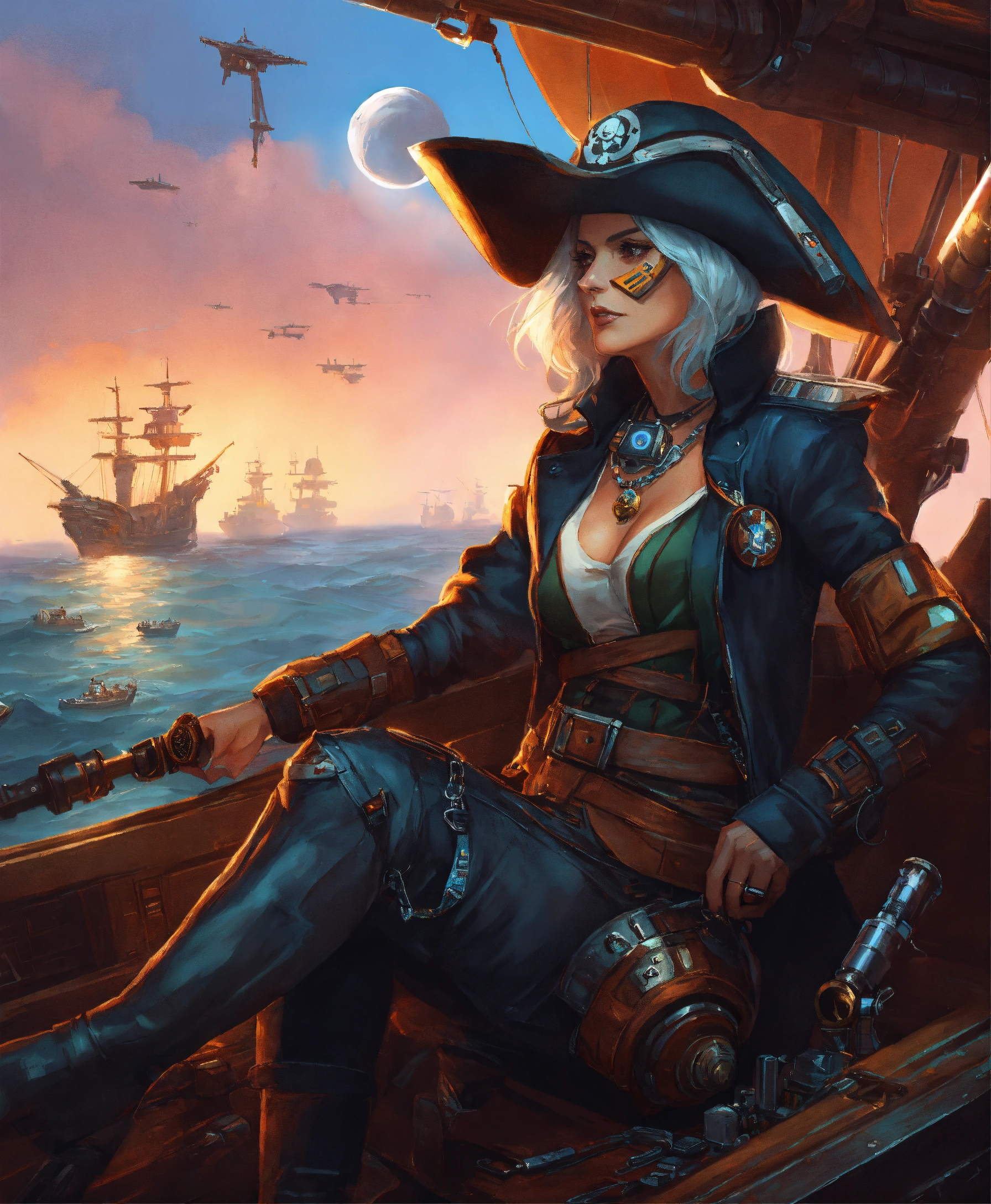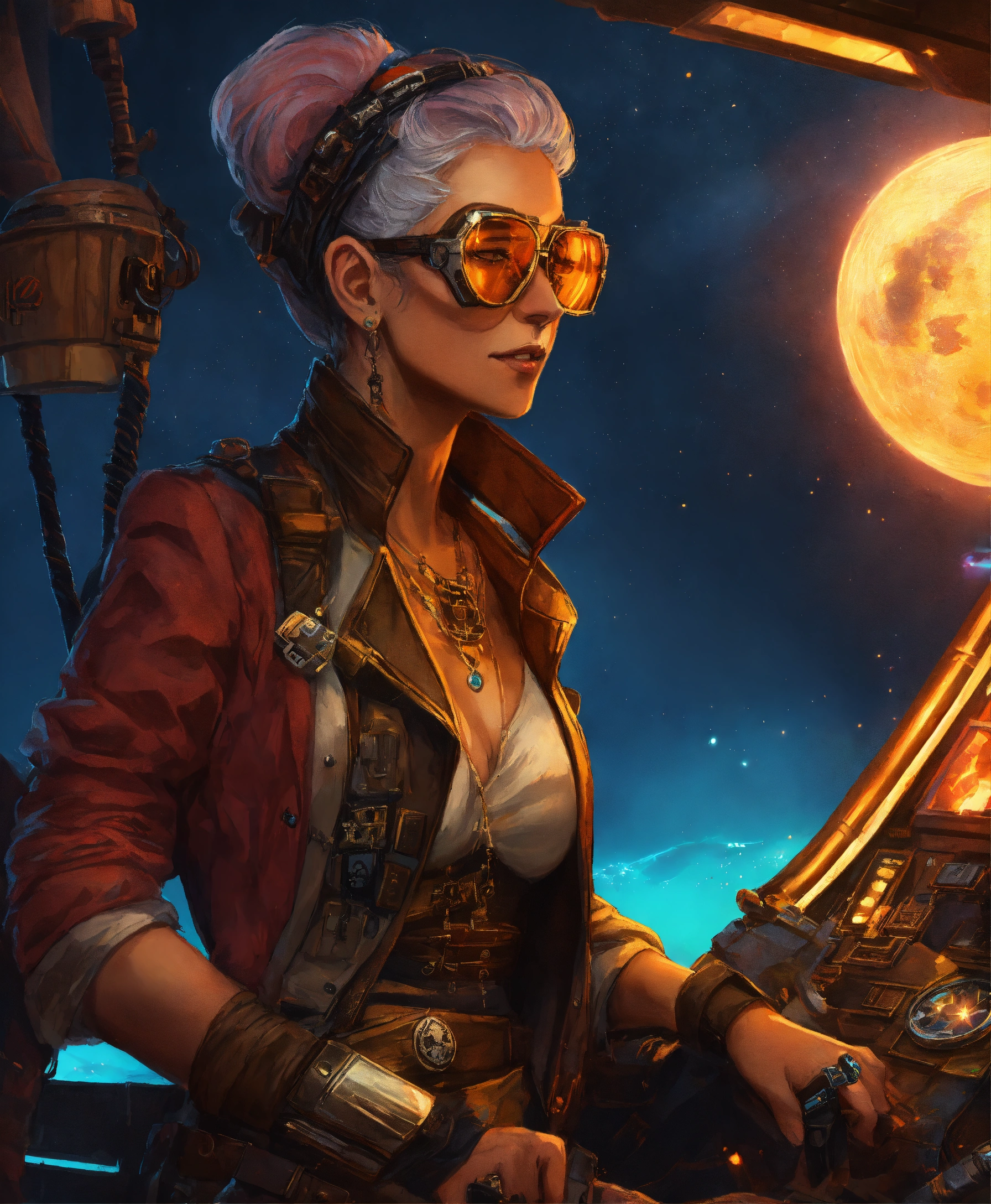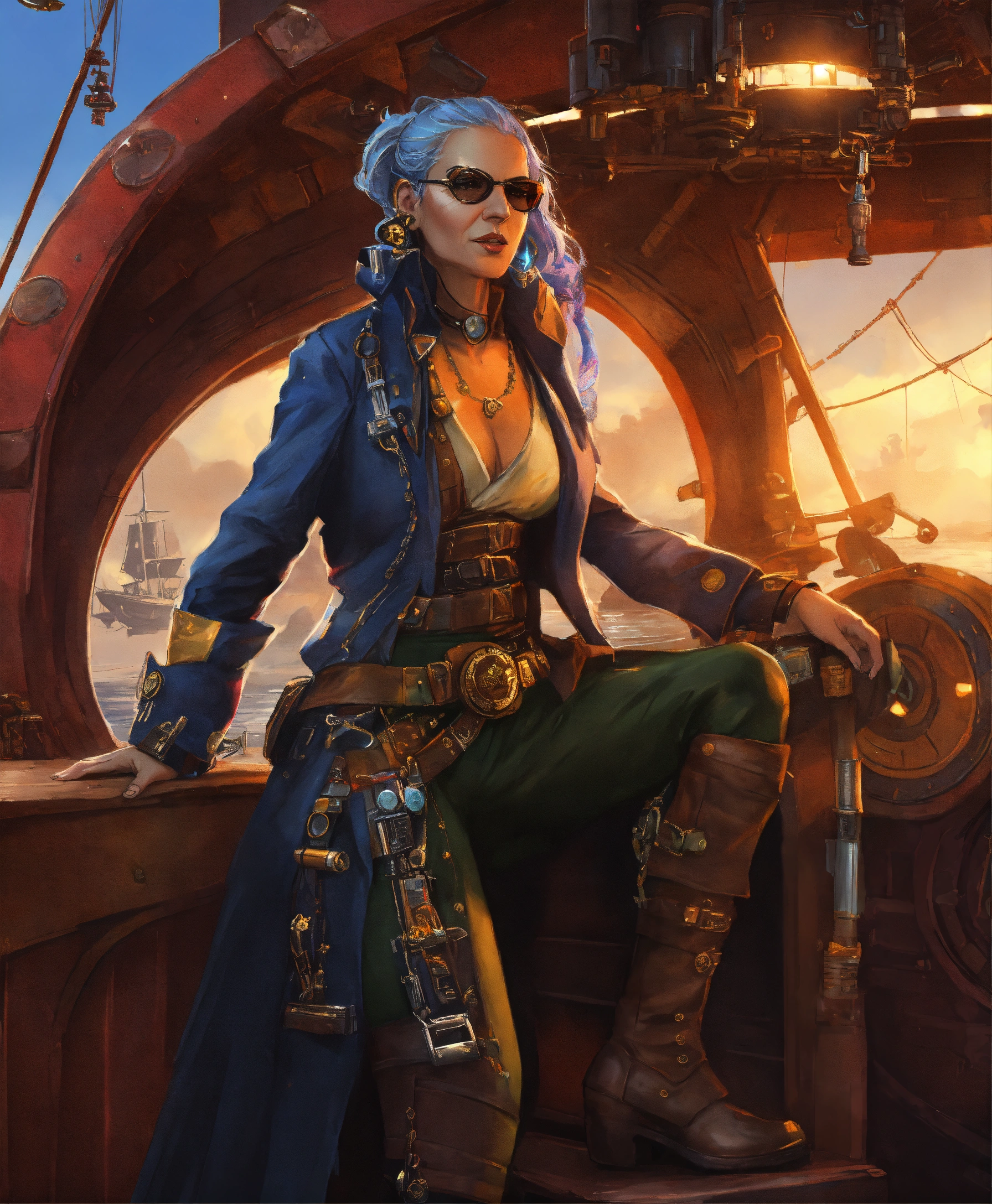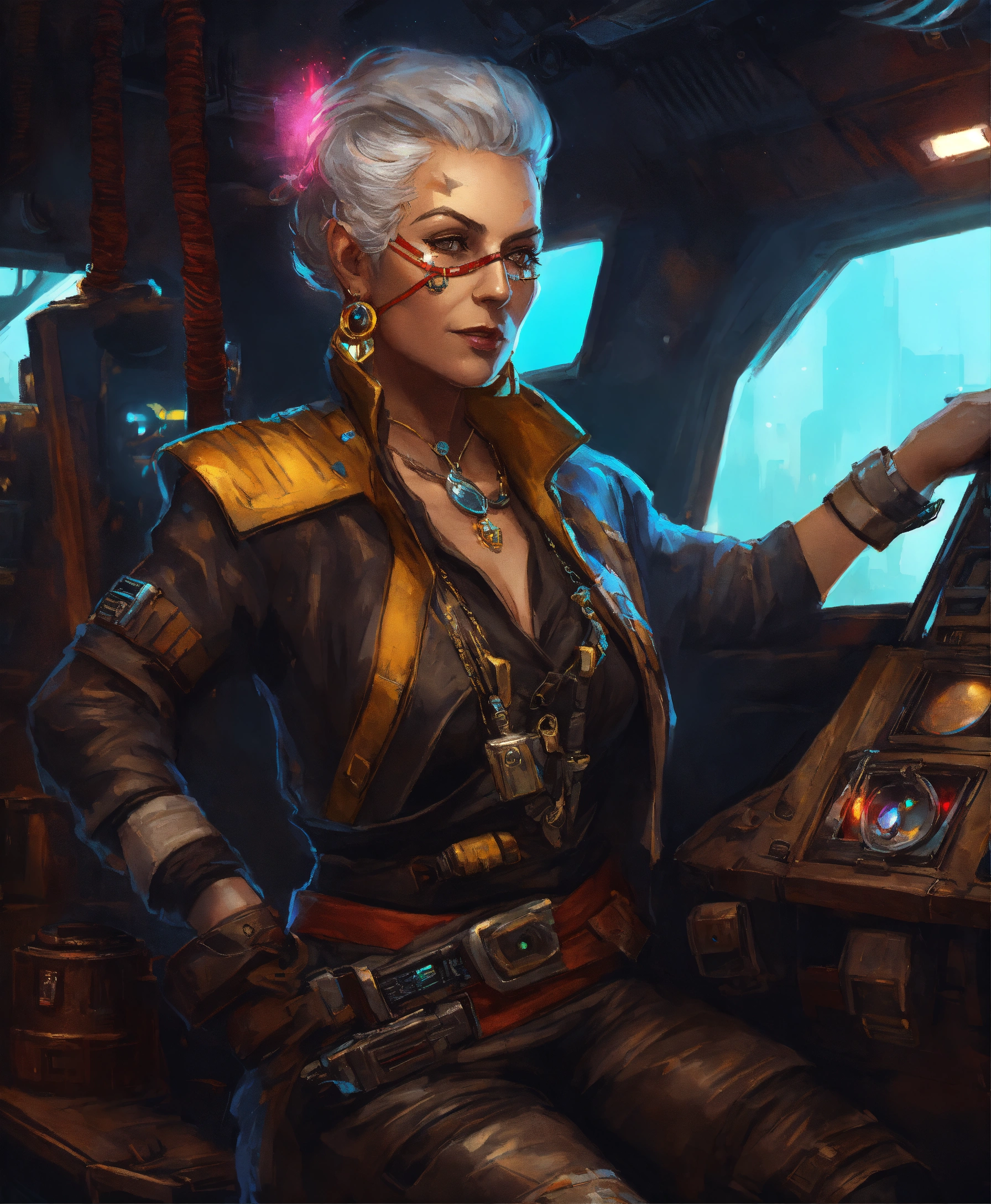 Character art of a fabulous old cyberpunk pirate woman in a star wars pirate ship