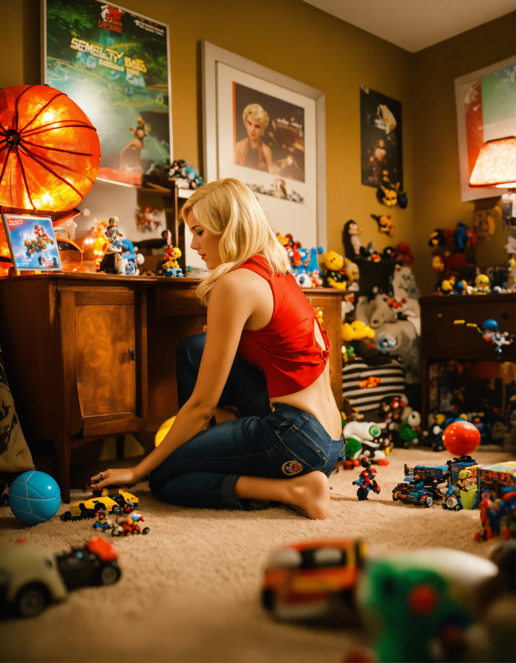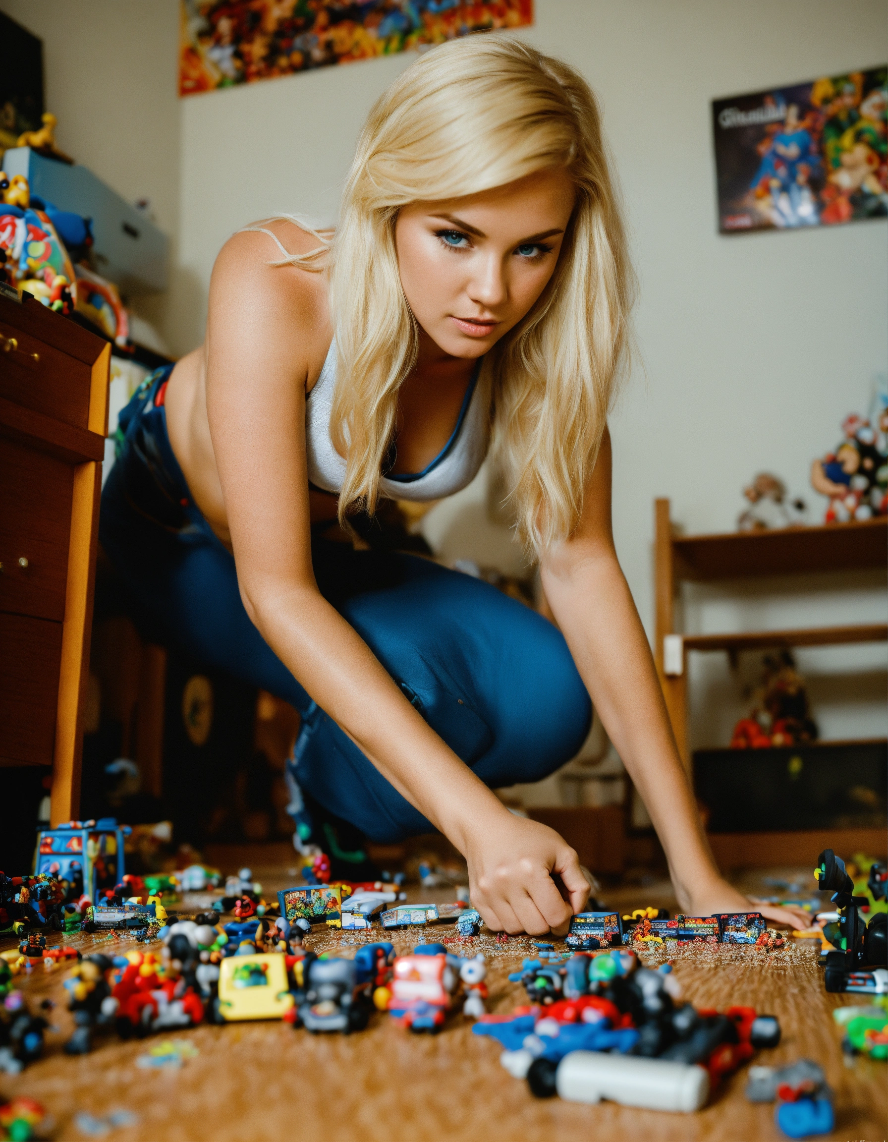 Photo, real, pretty 23-year-old blonde woman, bending over, leaning over, bending down, bent down, young boy's room, video games, nerdy toys, action figures, posters, solo, halter top, bombshell