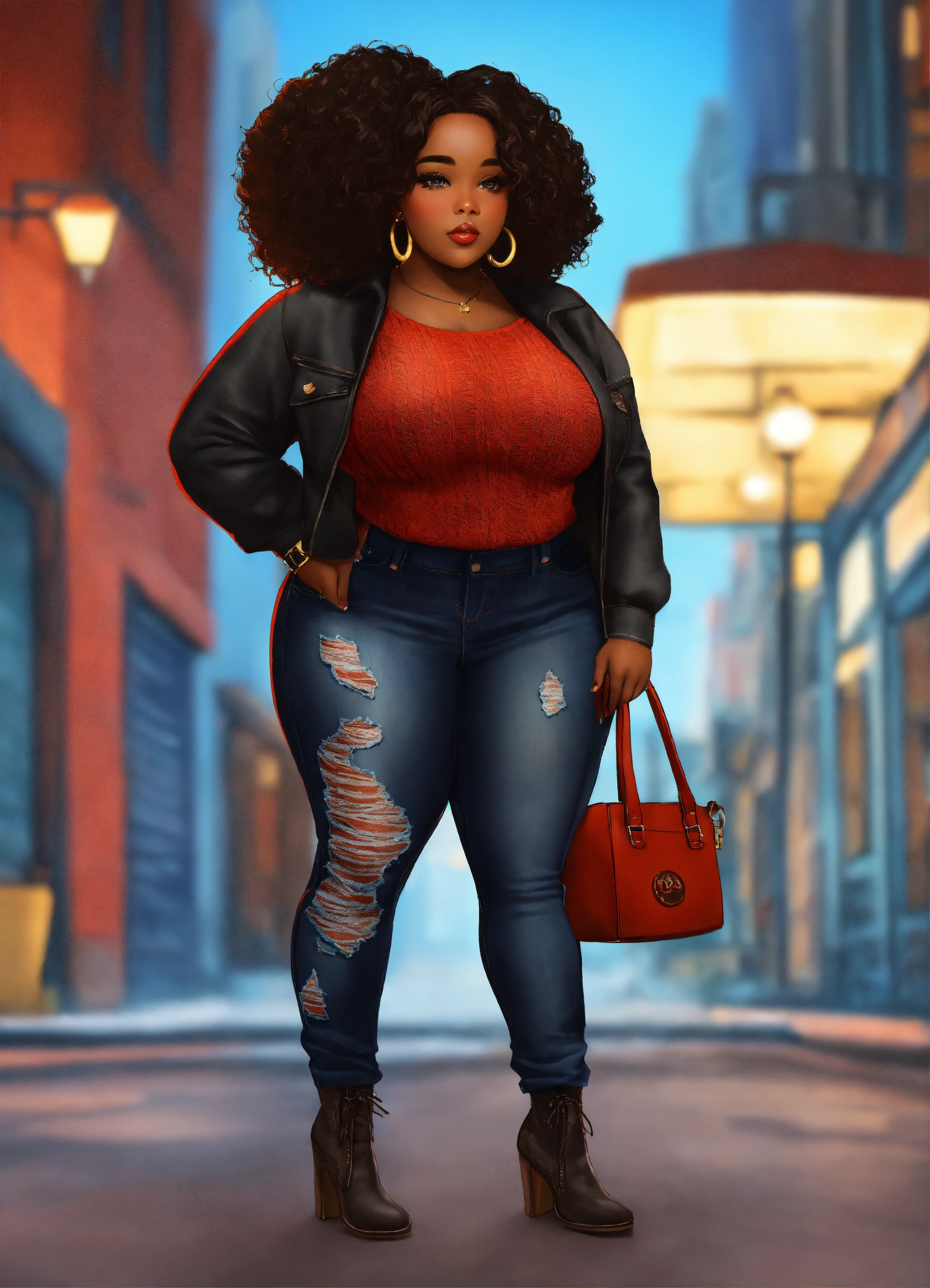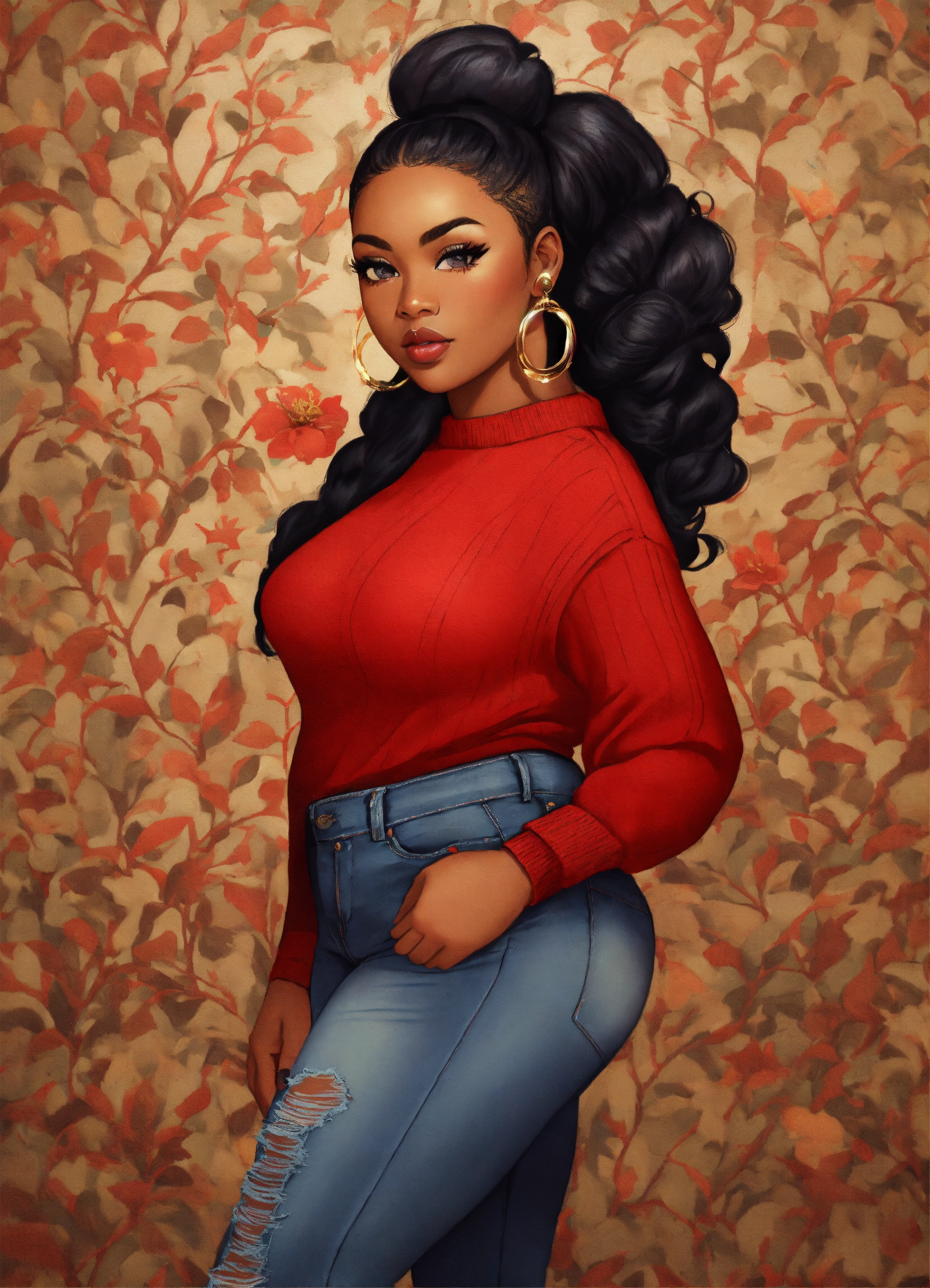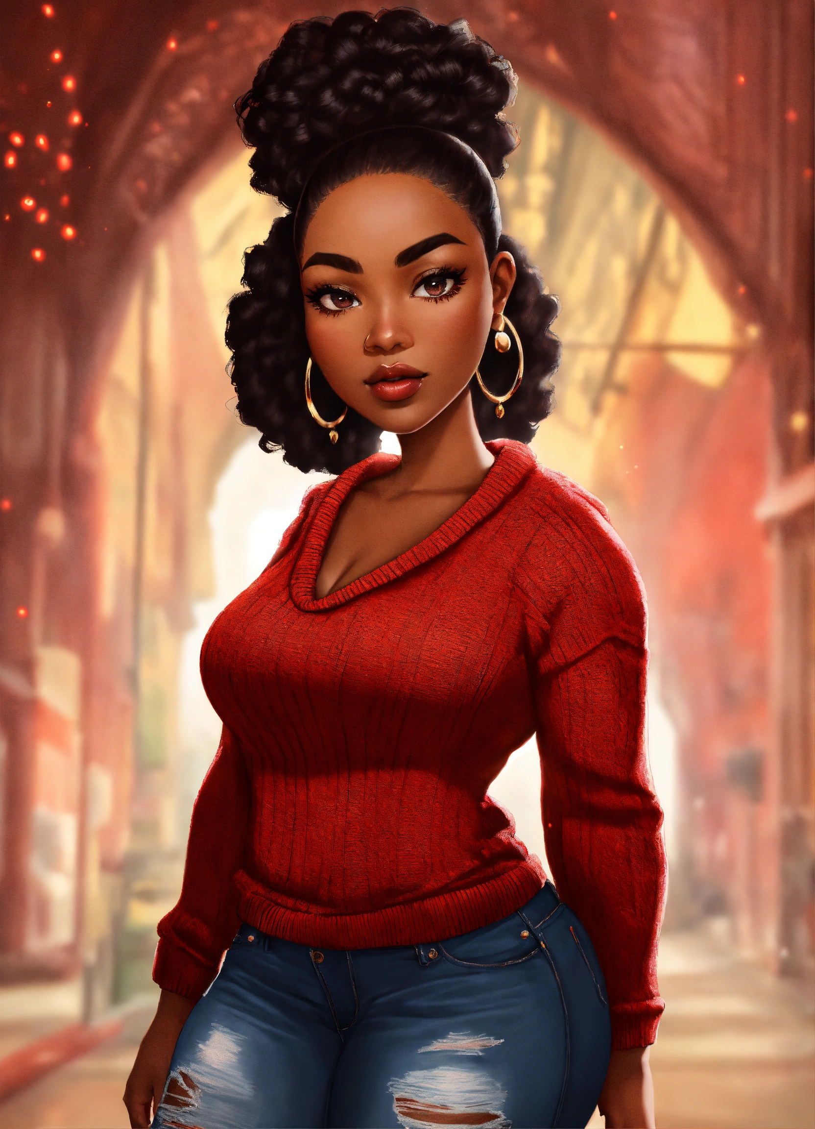 Photorealistic illustration of an exquisite full figured black woman with high cheekbones. in the style of chibi doll. she's attired in a red sweater with bold black patterns, ripped denim jeans, and chic black boots. her luscious dark brown hair is styled in a long wavy ponytail, creating a stunning visual. the full-body image accentuates her poised stance and the harmonious blend of her outfit's colors.