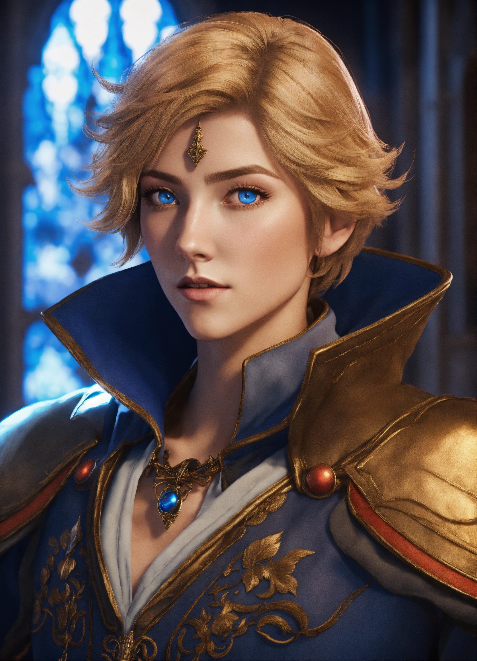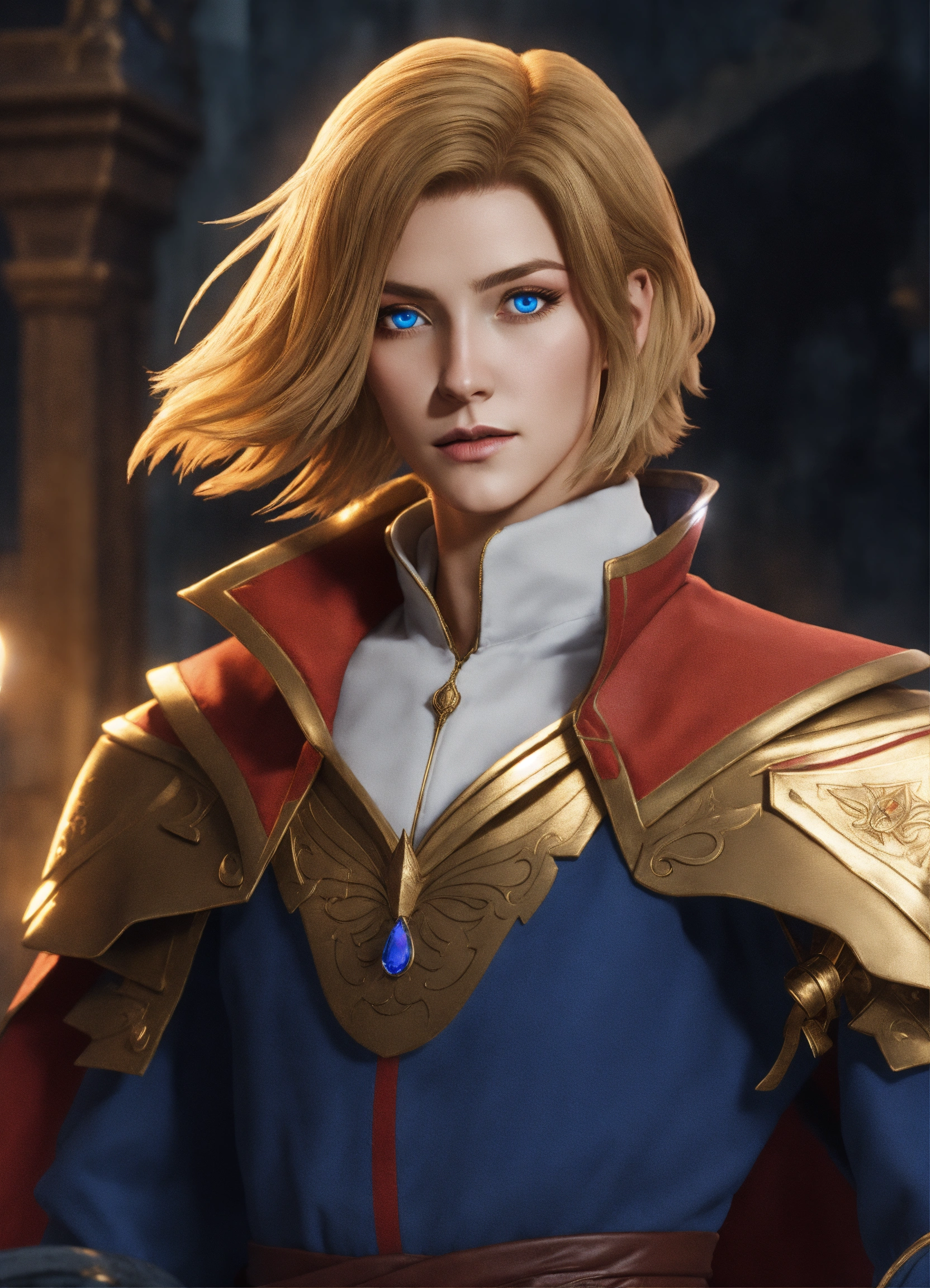 Sypha belnades castlevania, blonde hair with pixie cut from iberian region, blue round eyes, 5 volumetric lighting, 8k resolution