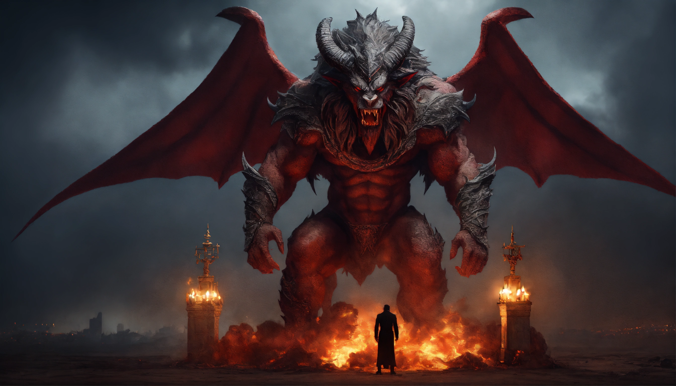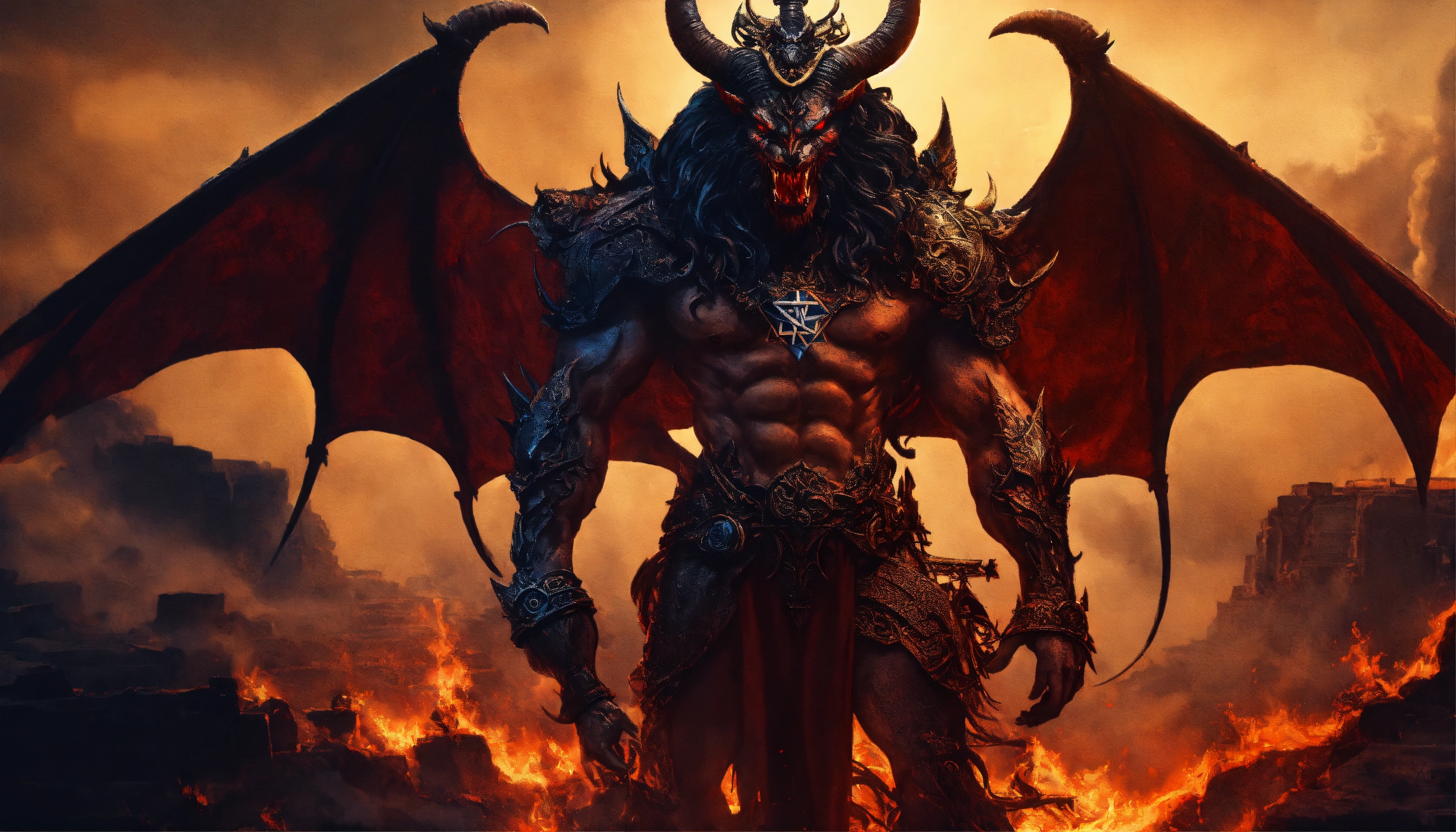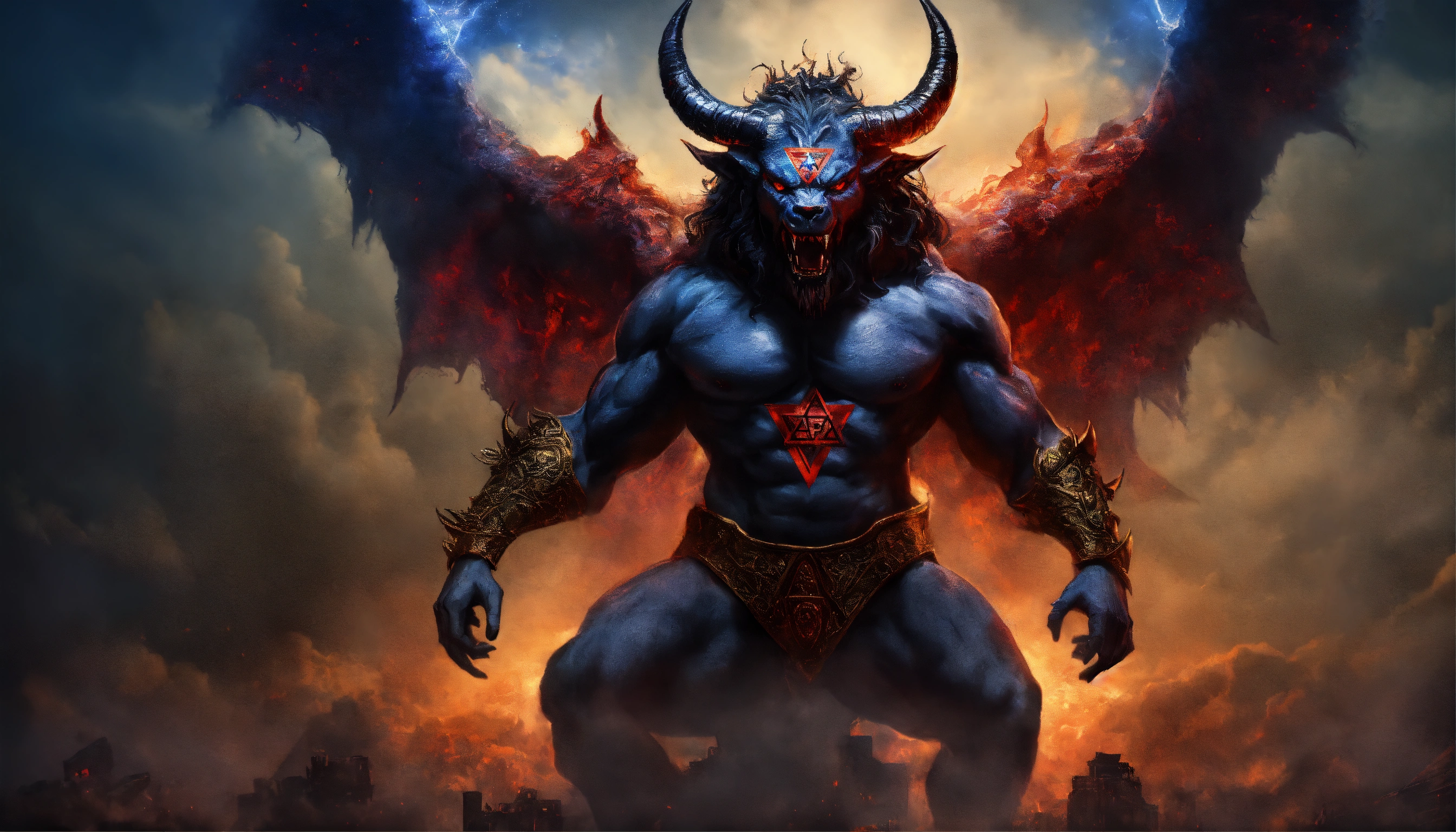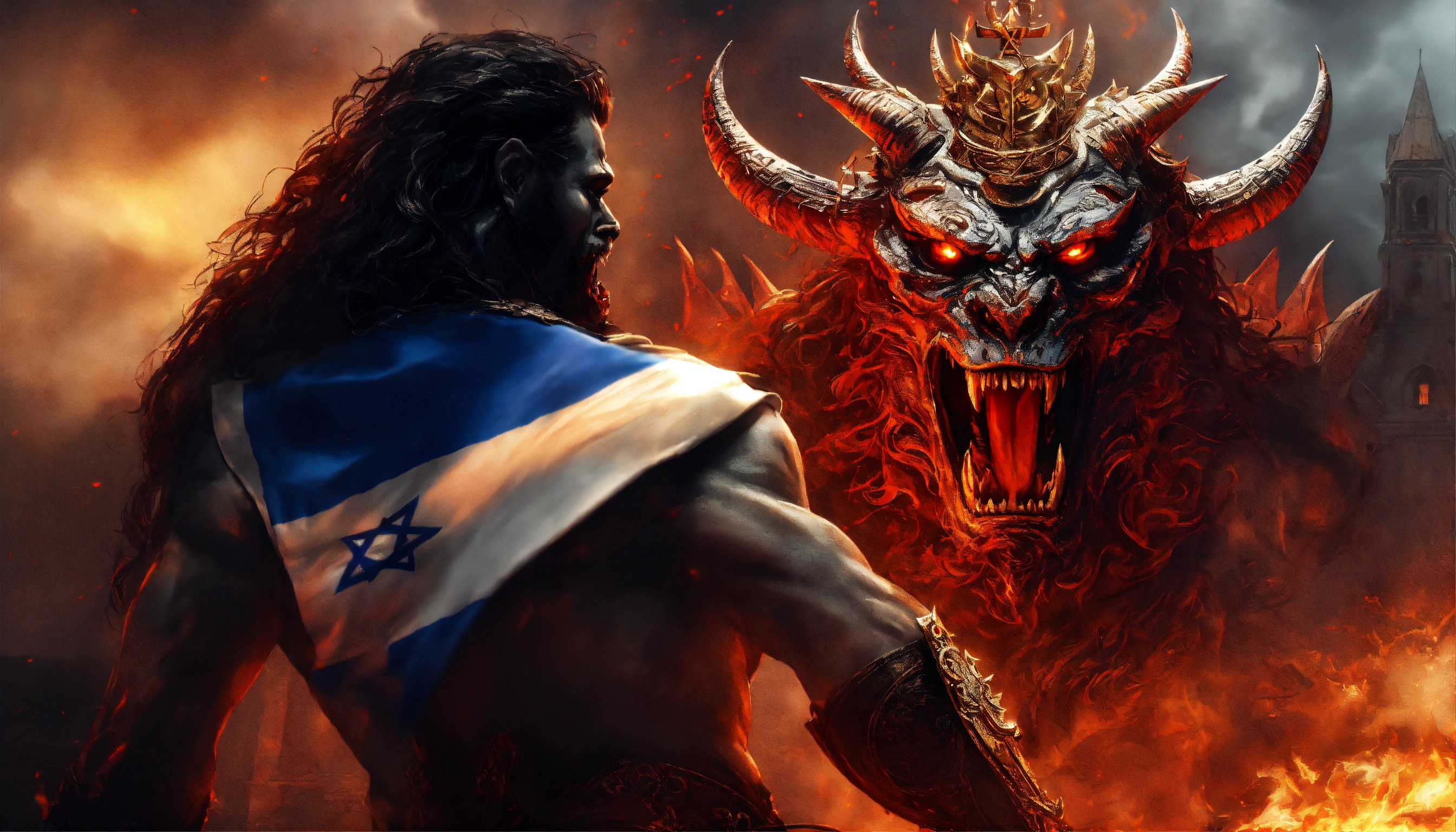 Evil demonic israel demon with an israeli flag beast with an armageddon demon, ominous, inspired by apollyon, highly detailed and realistic, extremely creative and unique, israel flag, star of david, divine inspiration, synagogue of satan