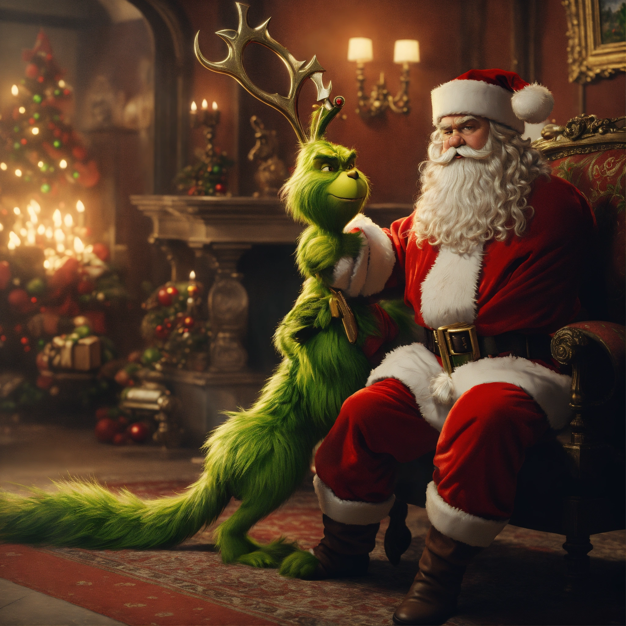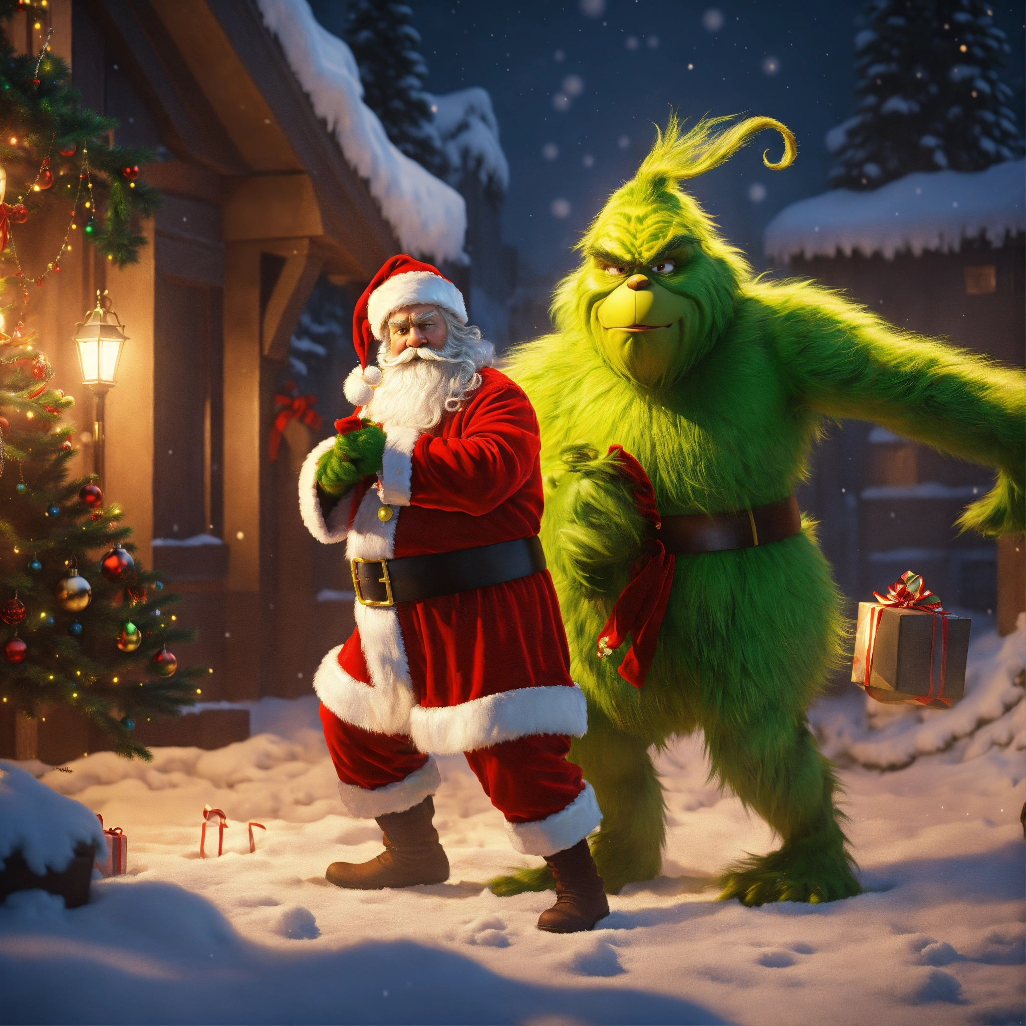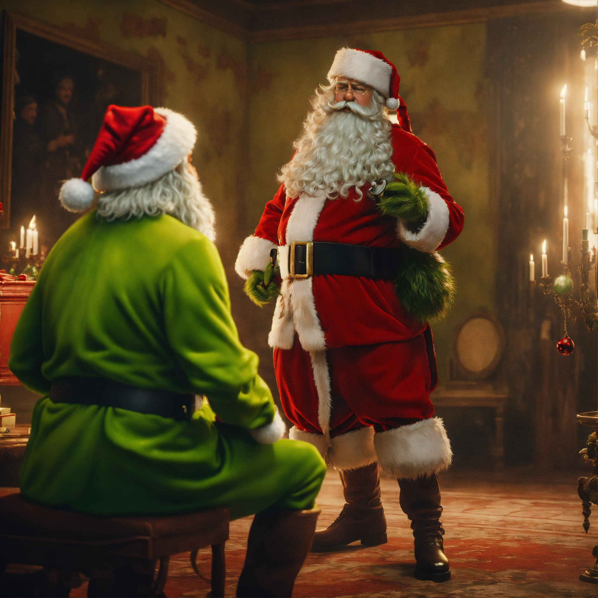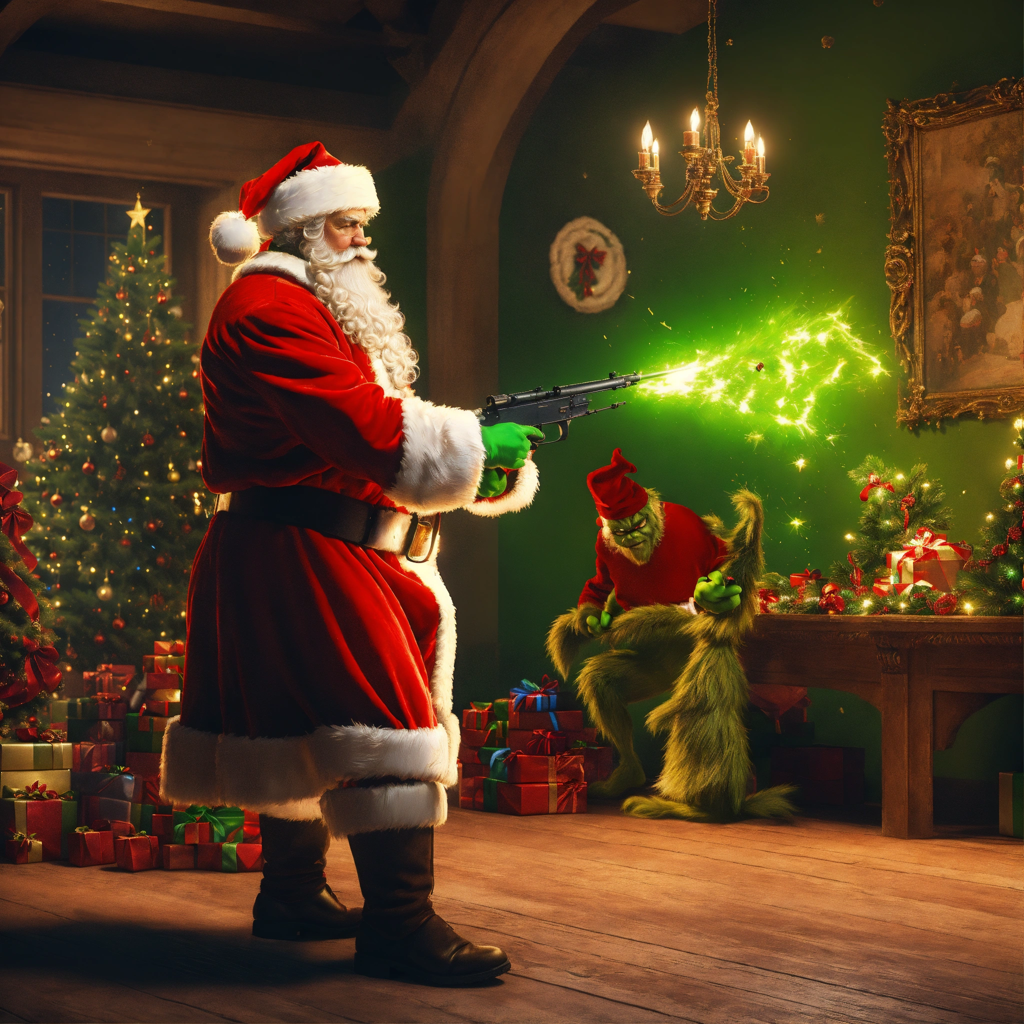 A classical painting of santa claus vs. the grinch in a shootout, rifles, classical painting style, christmas color scheme aesthetic, center shot, 8k cinematic, unreal engine render, ultra realistic, cinematic noise