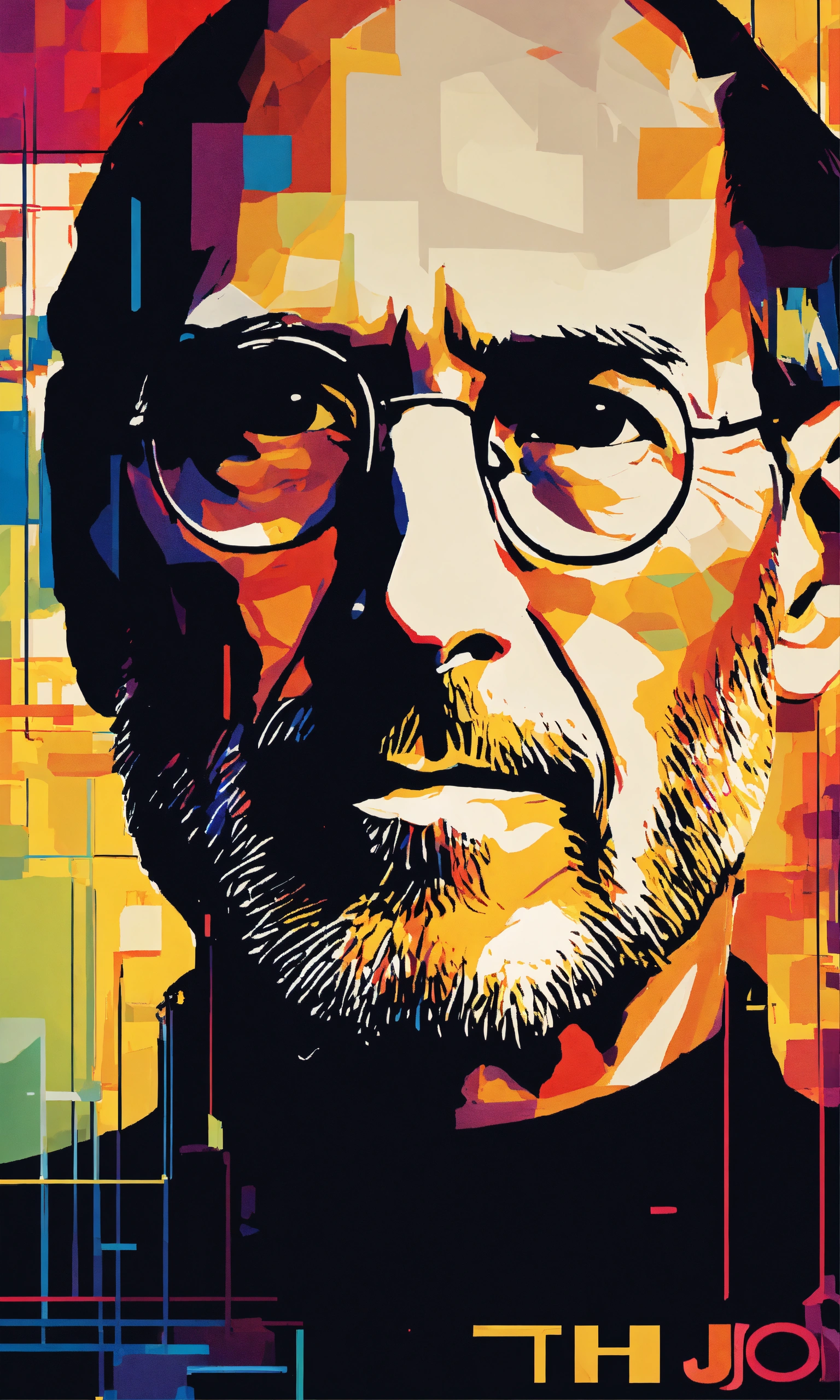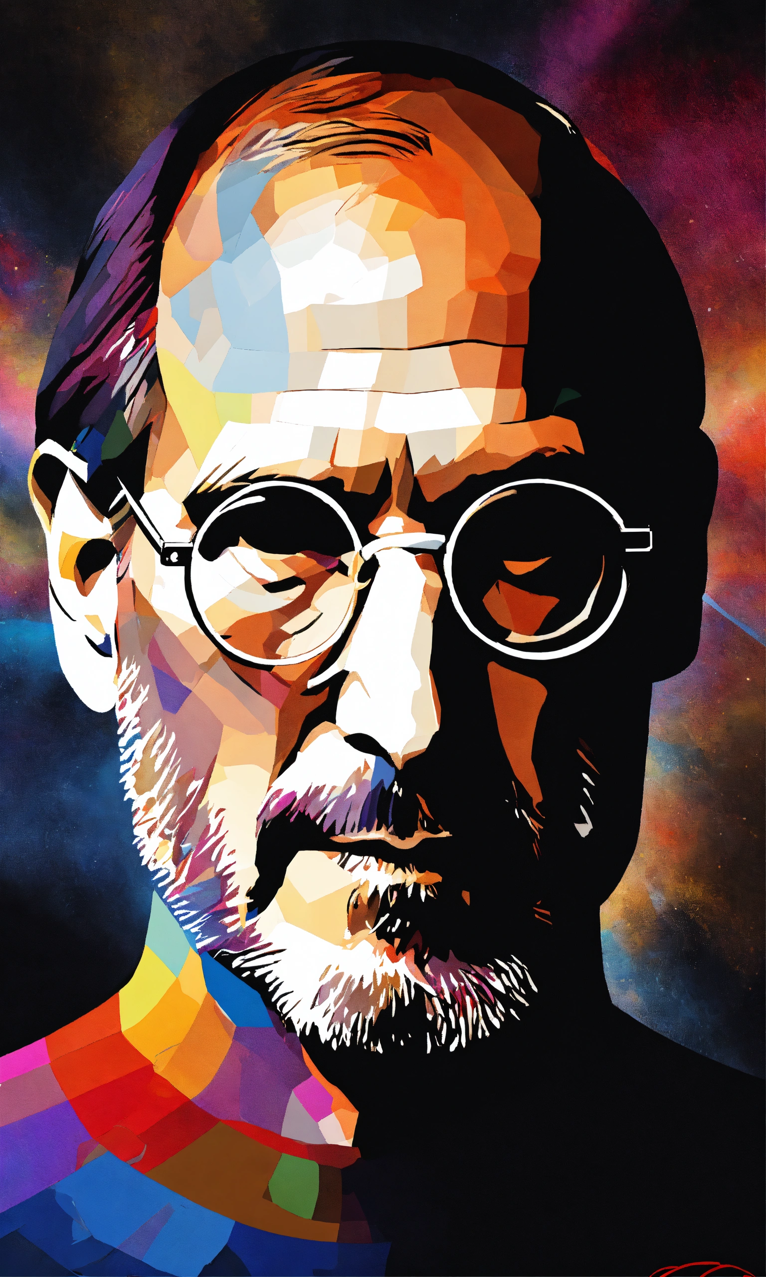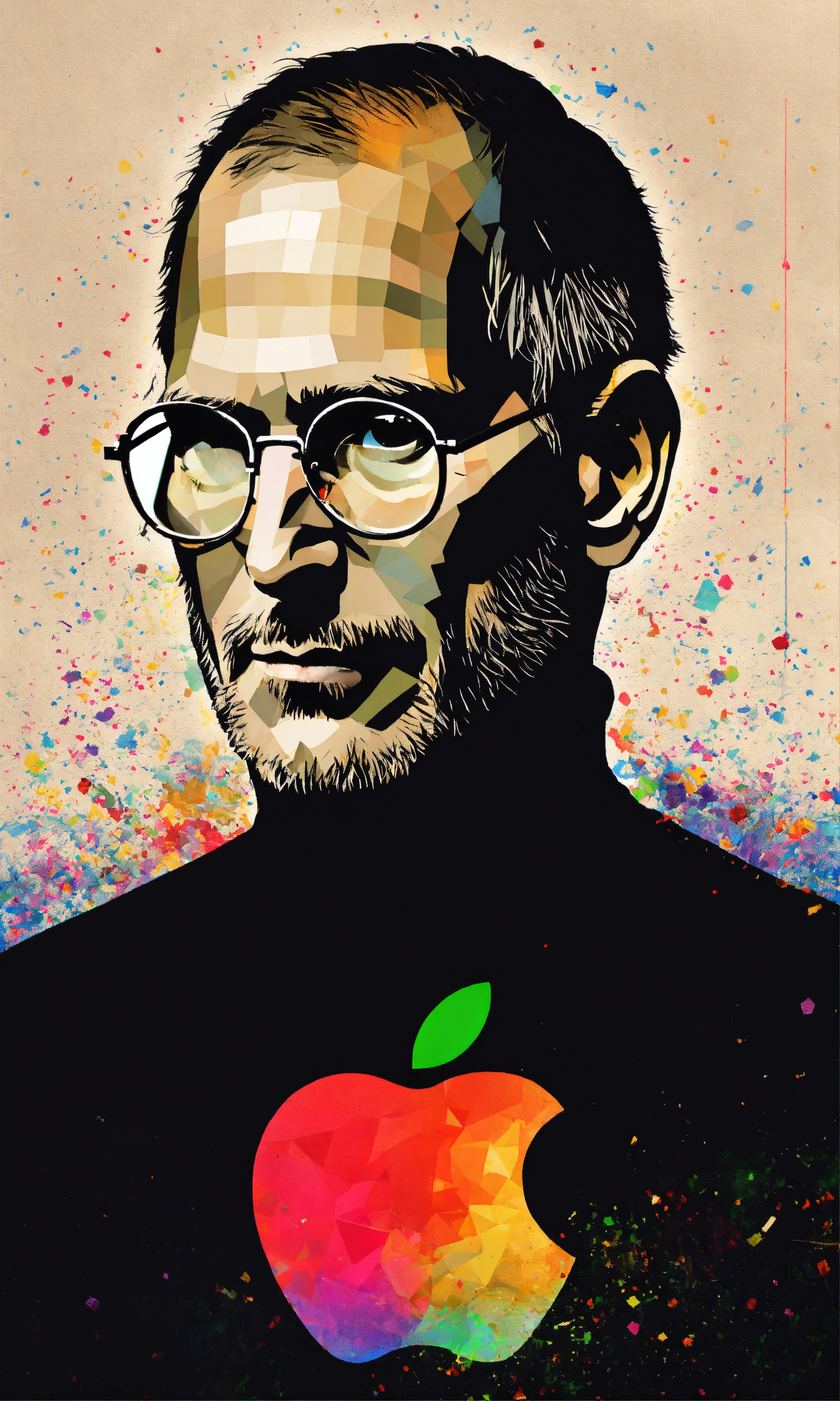 The image encapsulates the iconic essence of steve jobs, the visionary co-founder of apple inc. steve is portrayed in a color, emphasizing the timeless impact of his contributions. he stands with his trademark black turtleneck and round glasses, an embodiment of simplicity and innovation. his piercing gaze is a testament to his unwavering commitment to pushing the boundaries of technology.