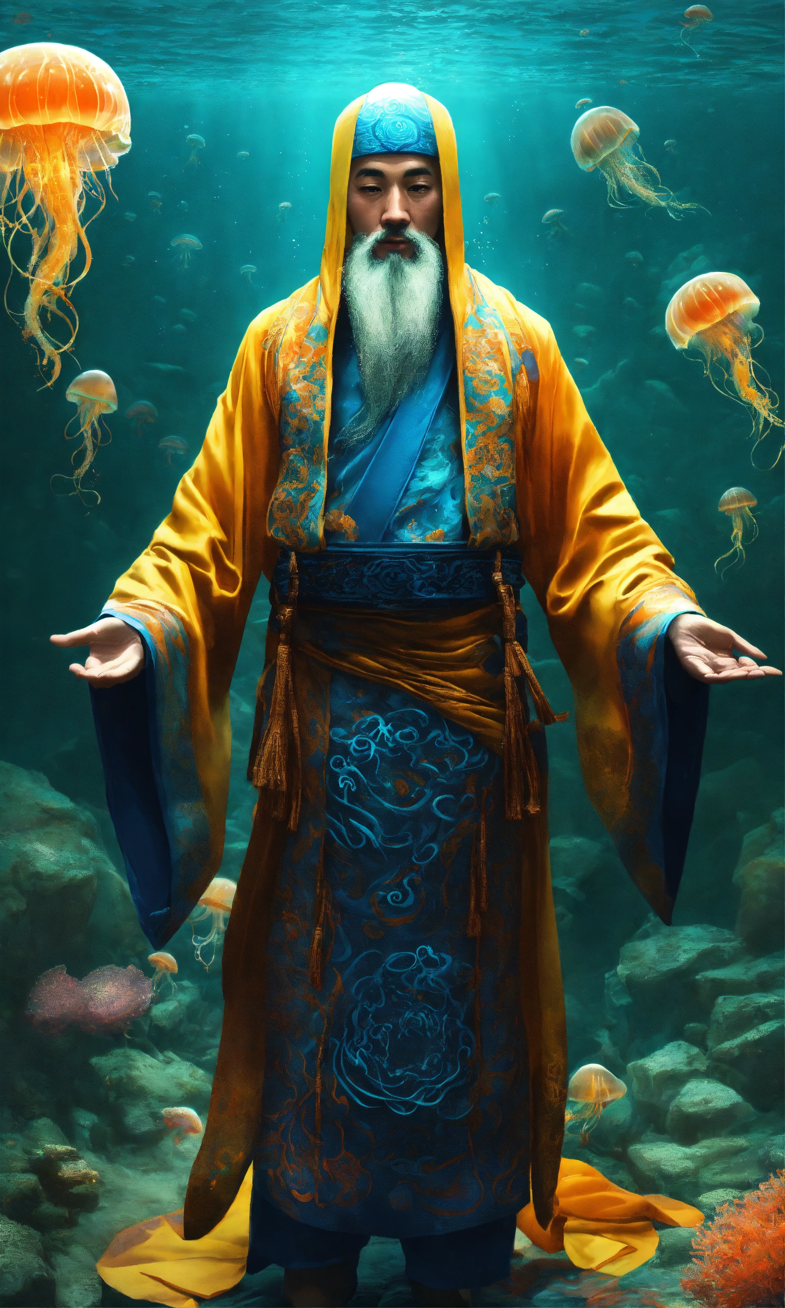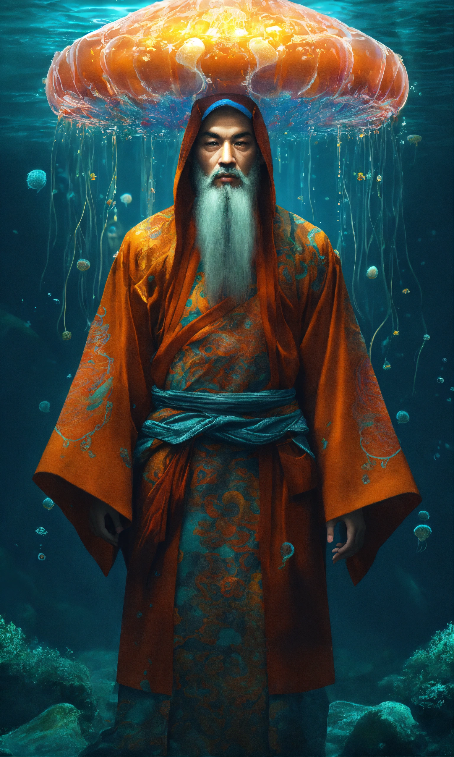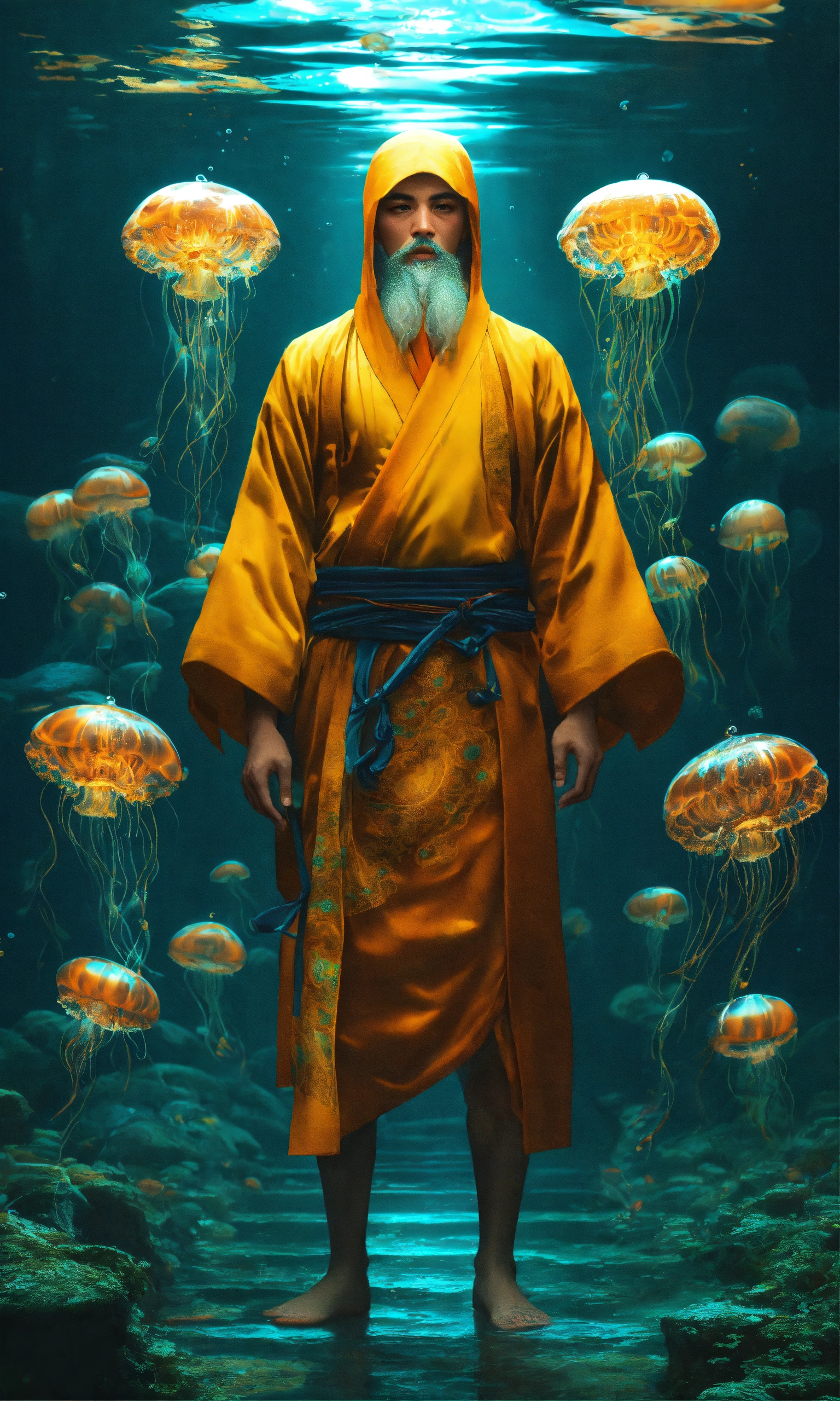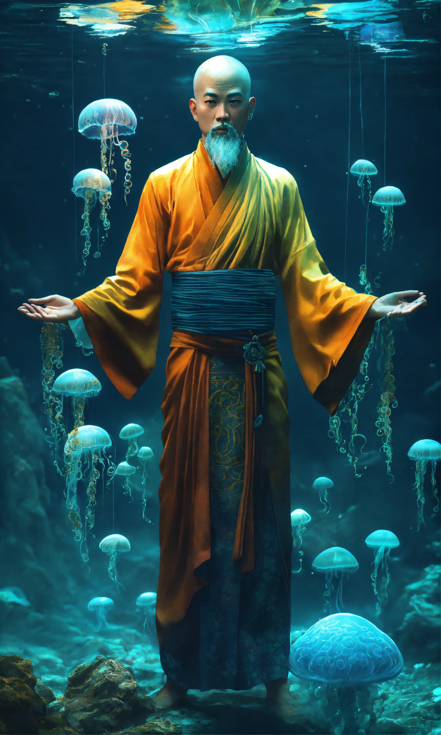 Taoist monk shaolin tesseract fractal underwater realiistic faces jellyfish wizard turkish cyborg lines, full body