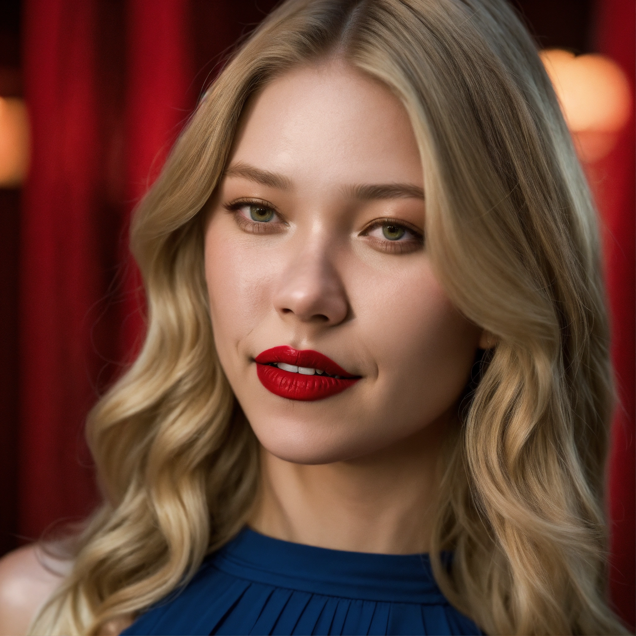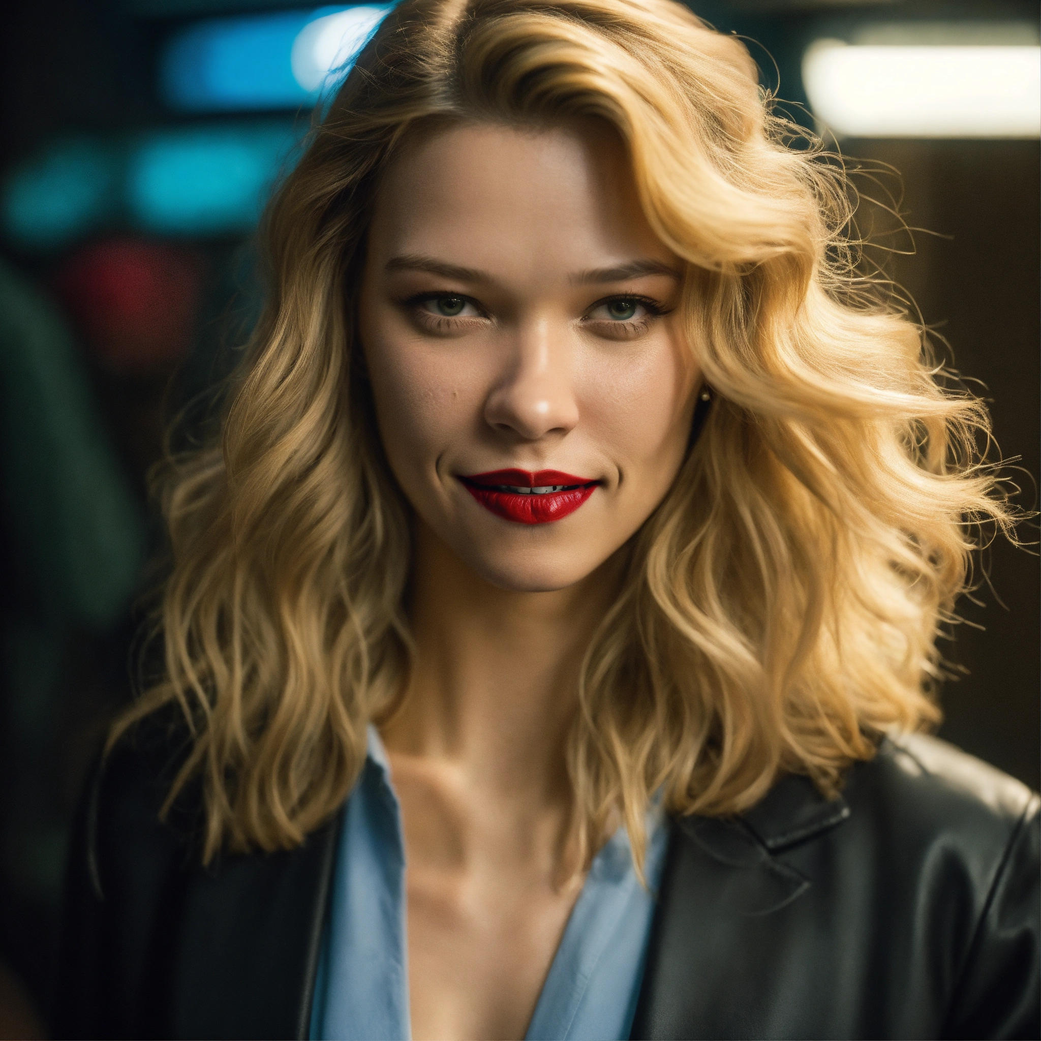Beautiful blonde girl, lea seydoux long hair, altered carbon style, very realistic, 27 years old, serial killer hunt, tall bitch, grin, red lipstick