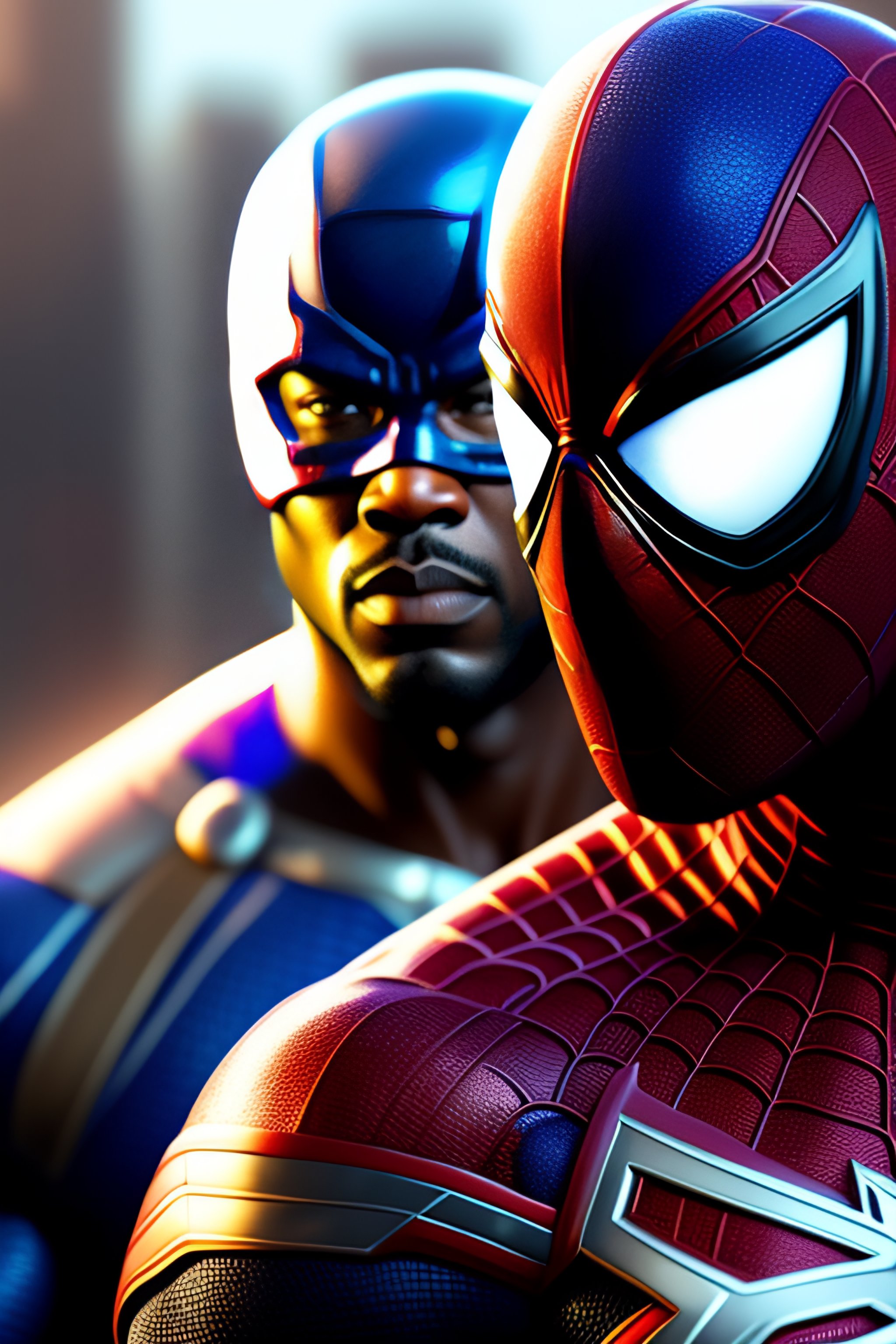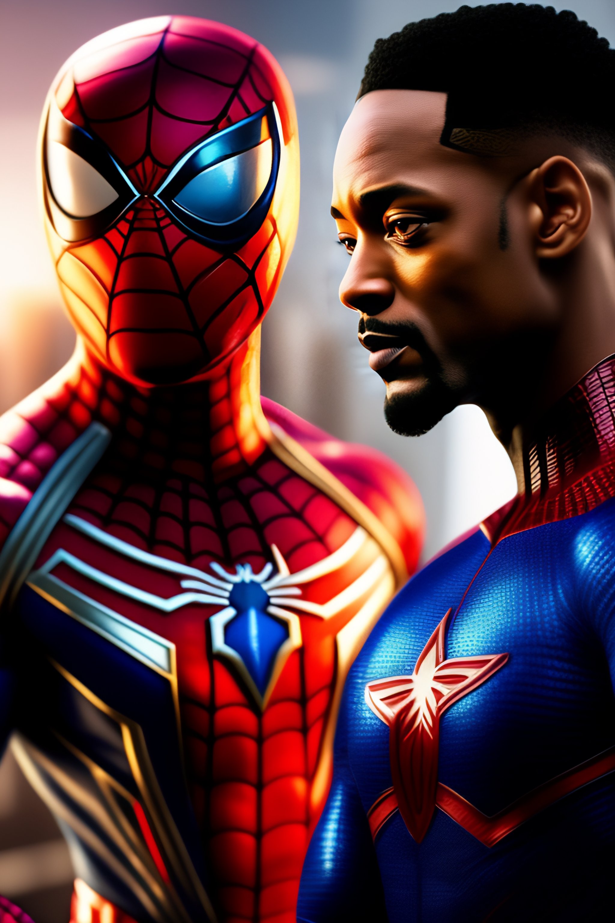 Joe bidan as spiderman and will smith as captain america blender 4k nikon 35mm hyper realistic cell shaded volumetric lighting, line art