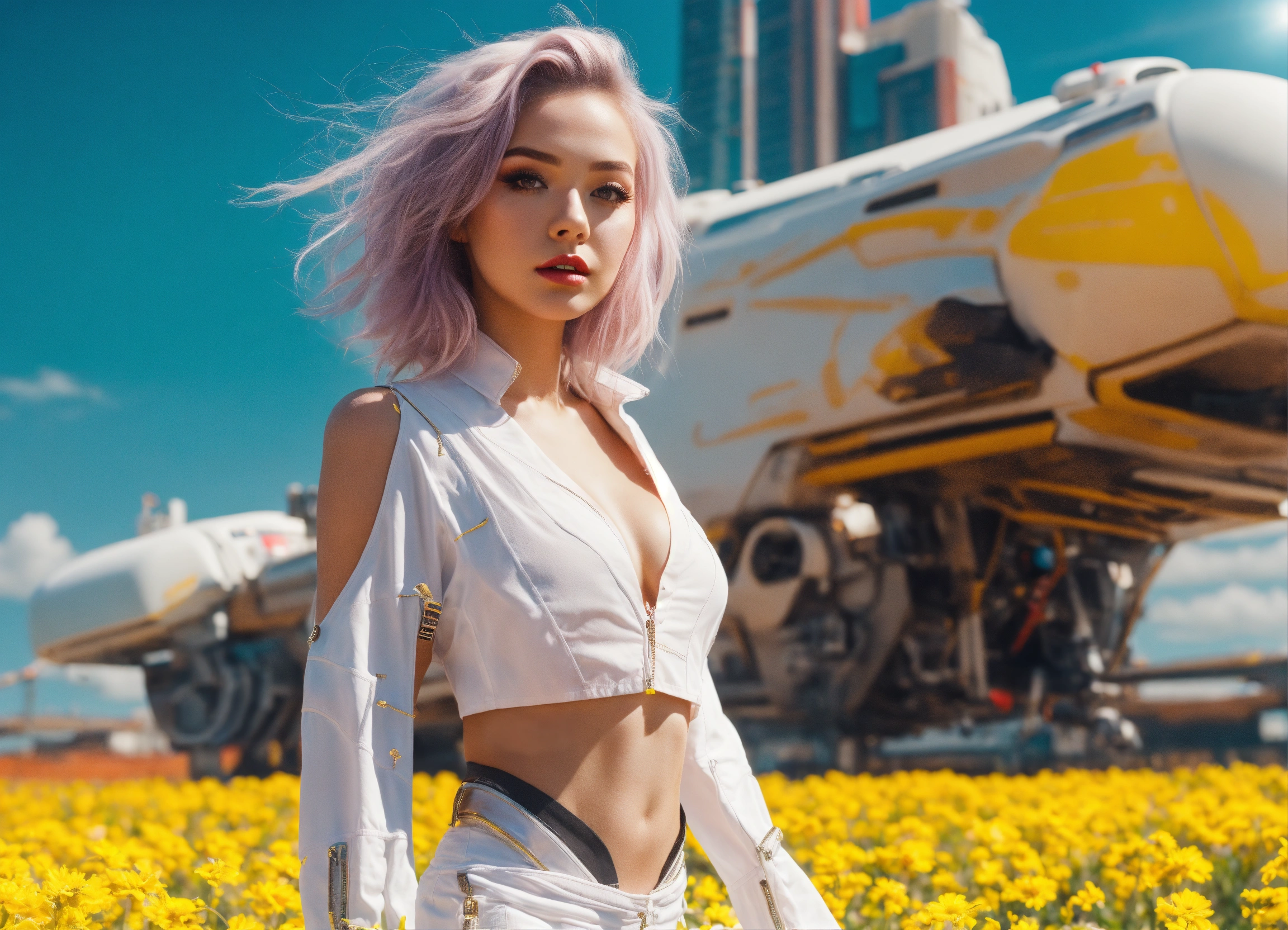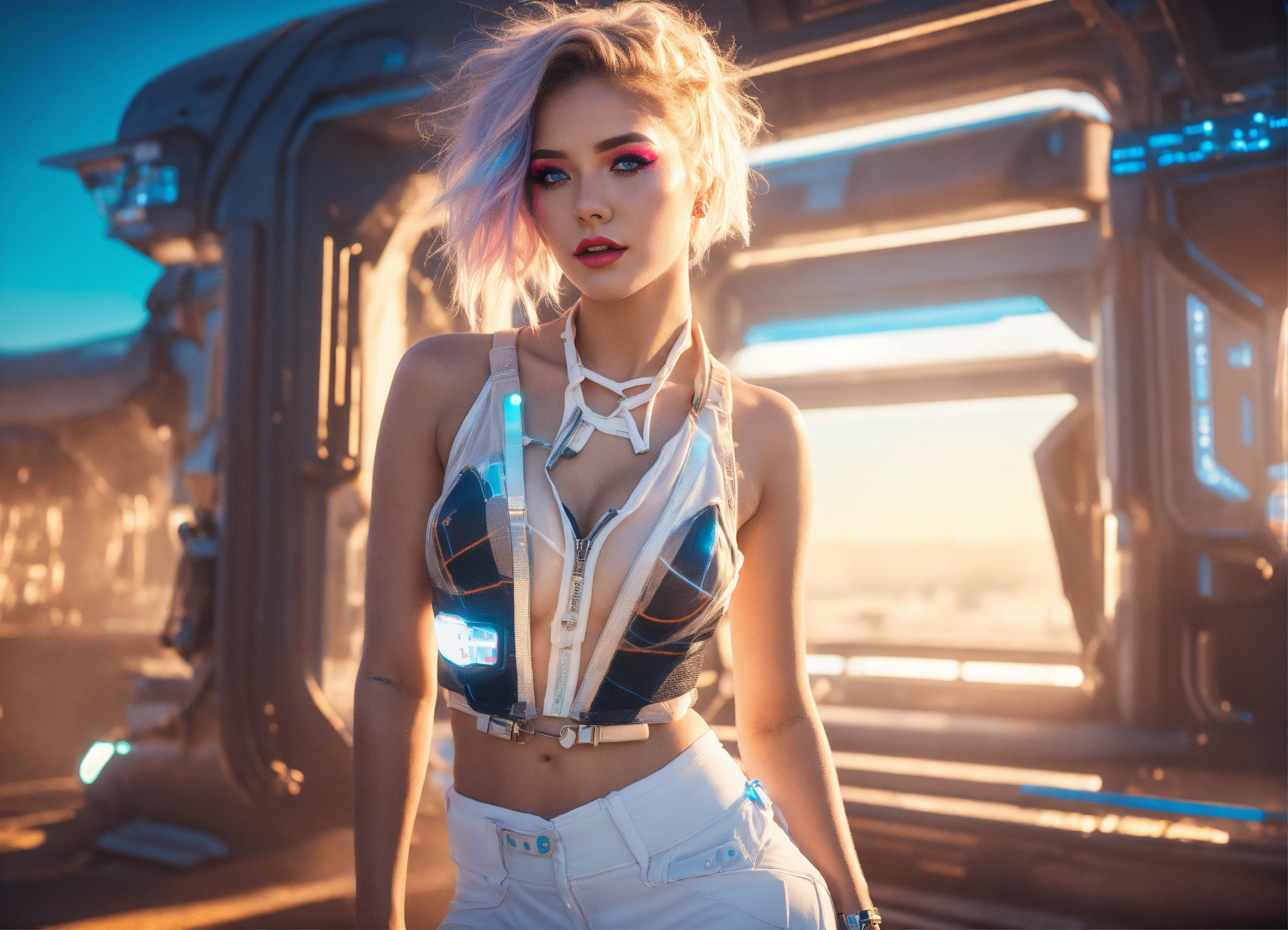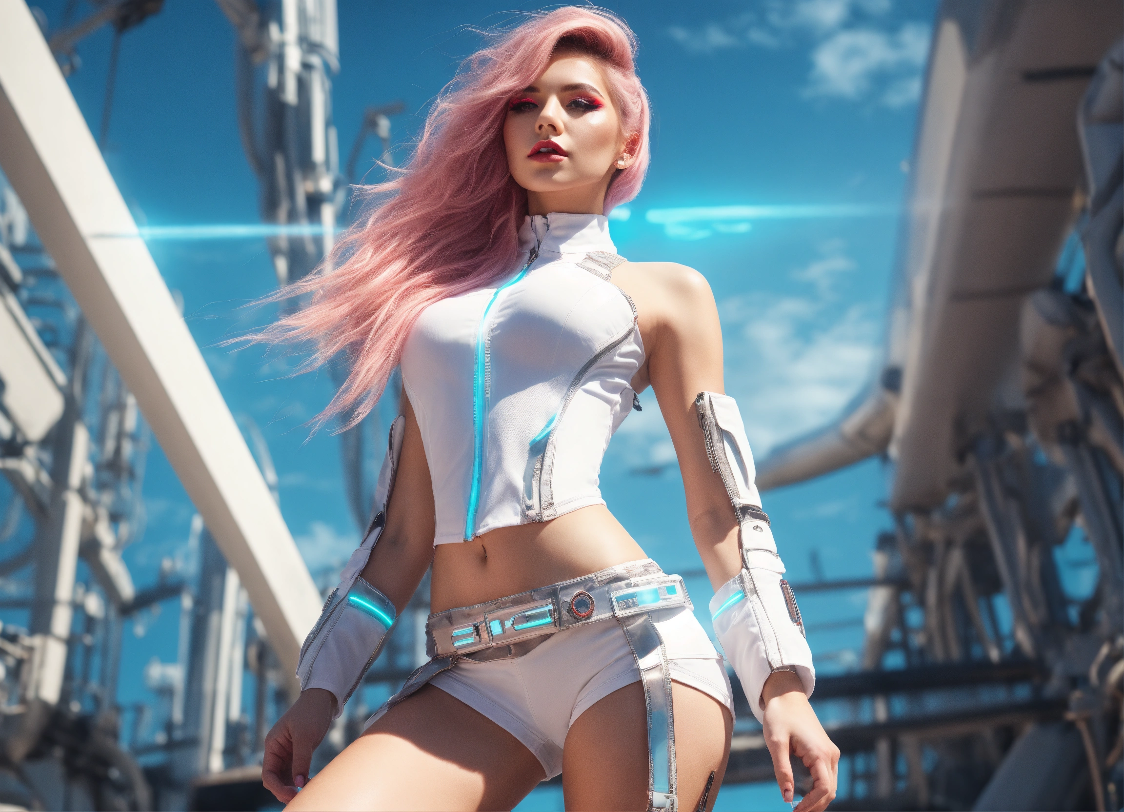 Full body, photo, sci-fi dream girl, futuristic, sunny weather, open shirt, wearing underwaee, 8k, extreme make-up, hair, white, neon