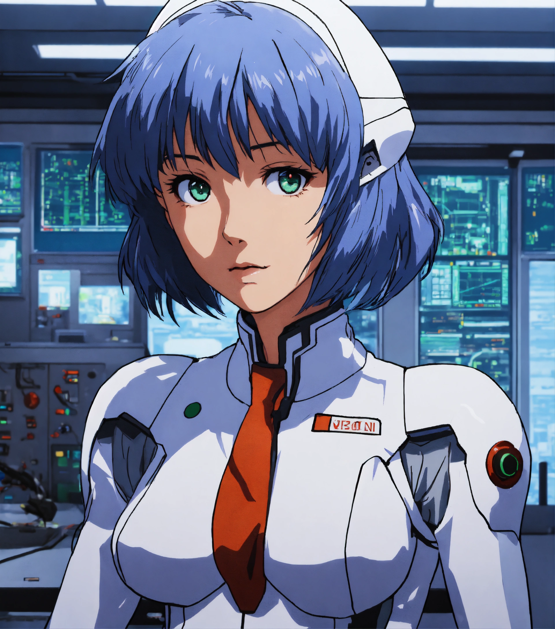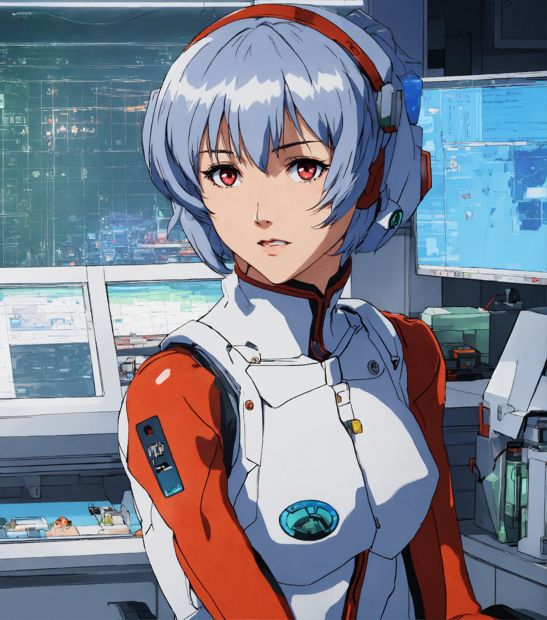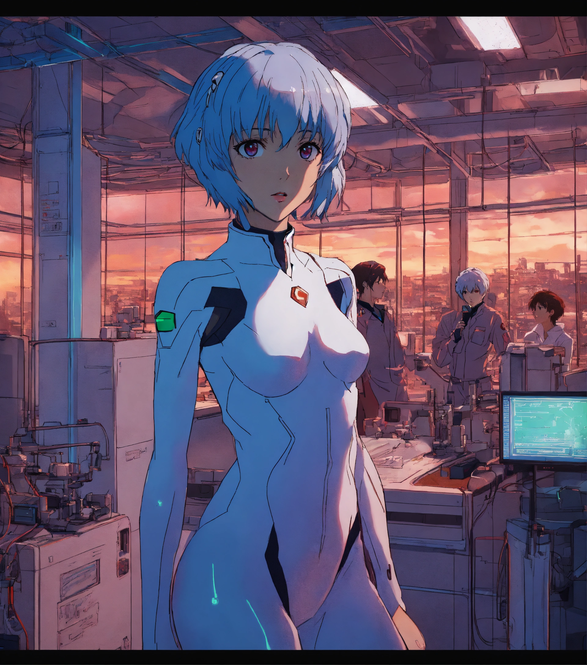 Portrait of rei ayanami from neon genesis evangelion, inside the nerv lab with lots of scientists, detailed scene, stunning details, anime, detailed environment, ray tracing, 8k black woman