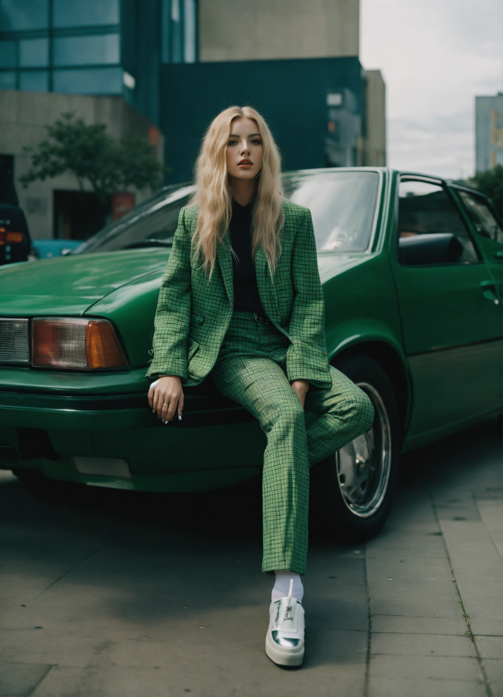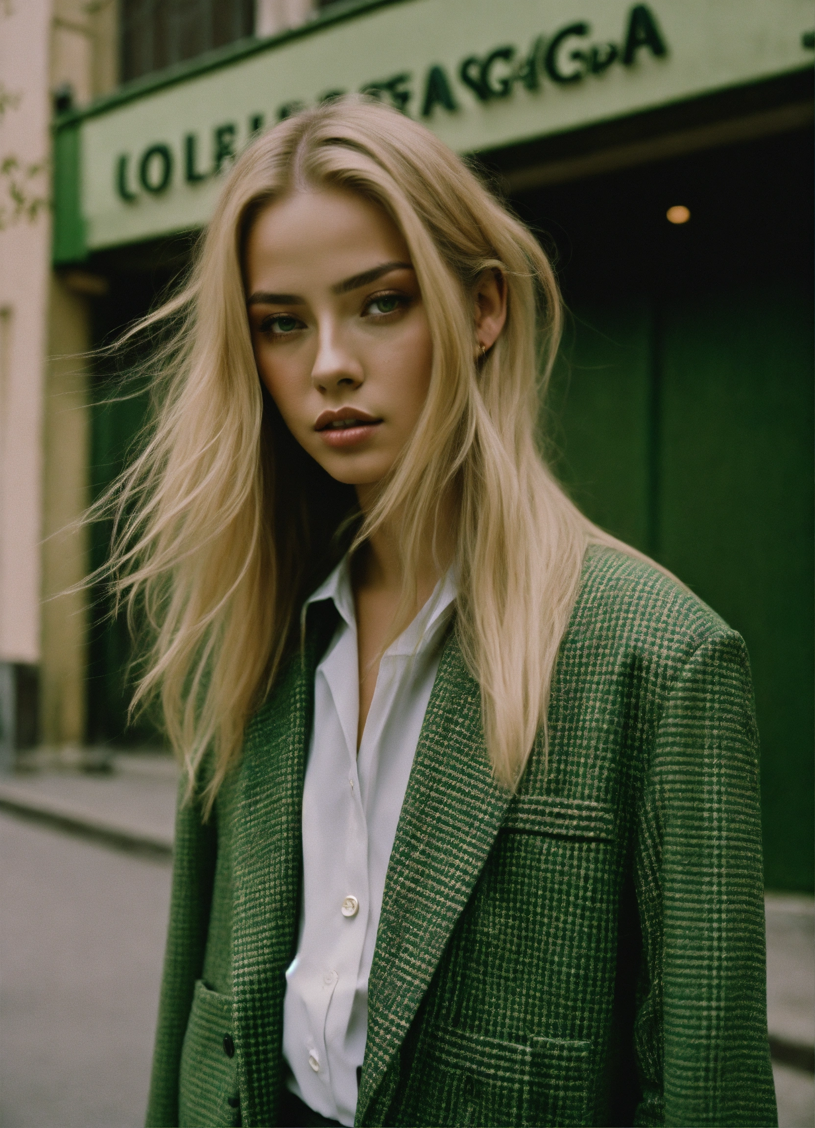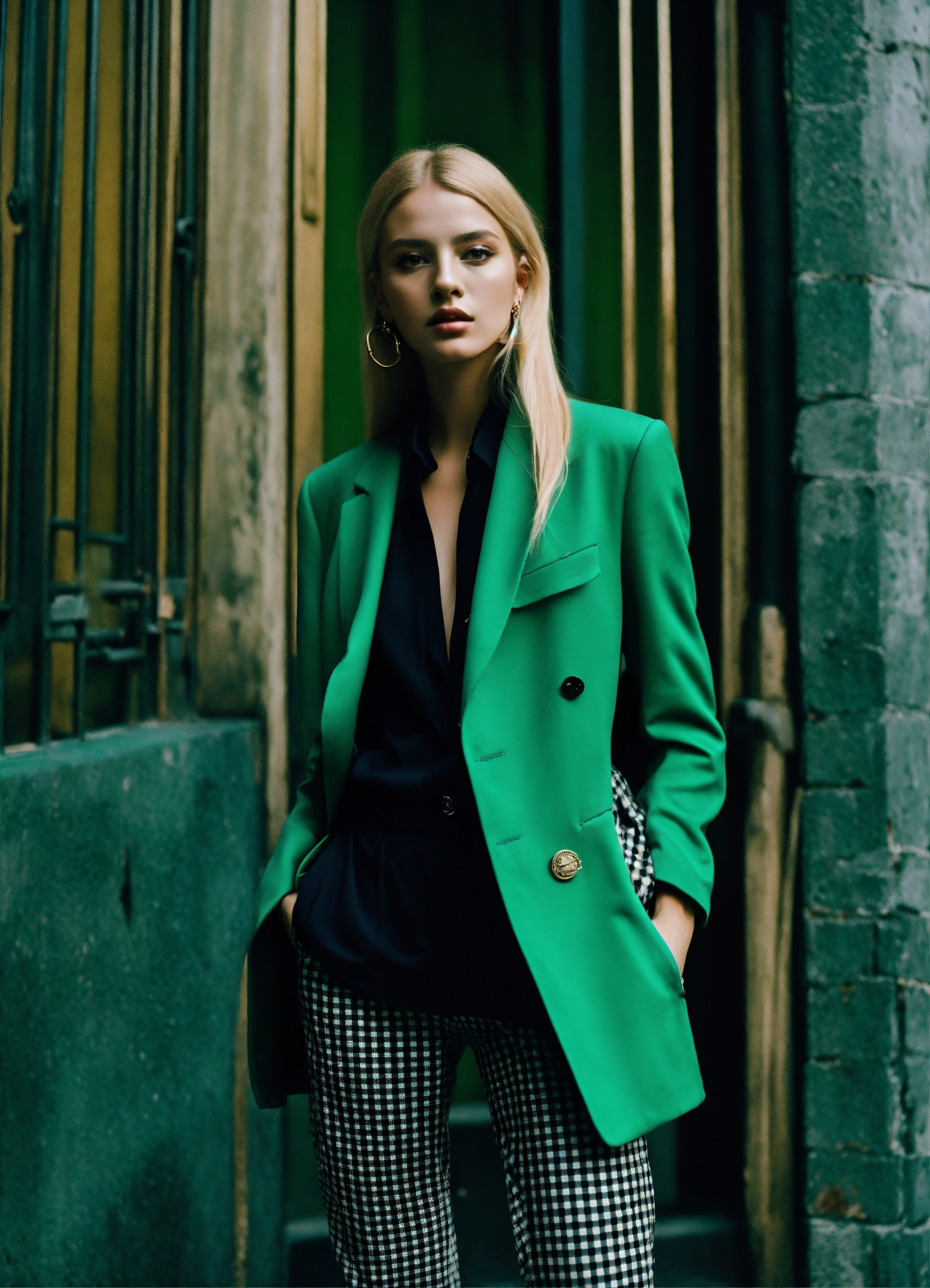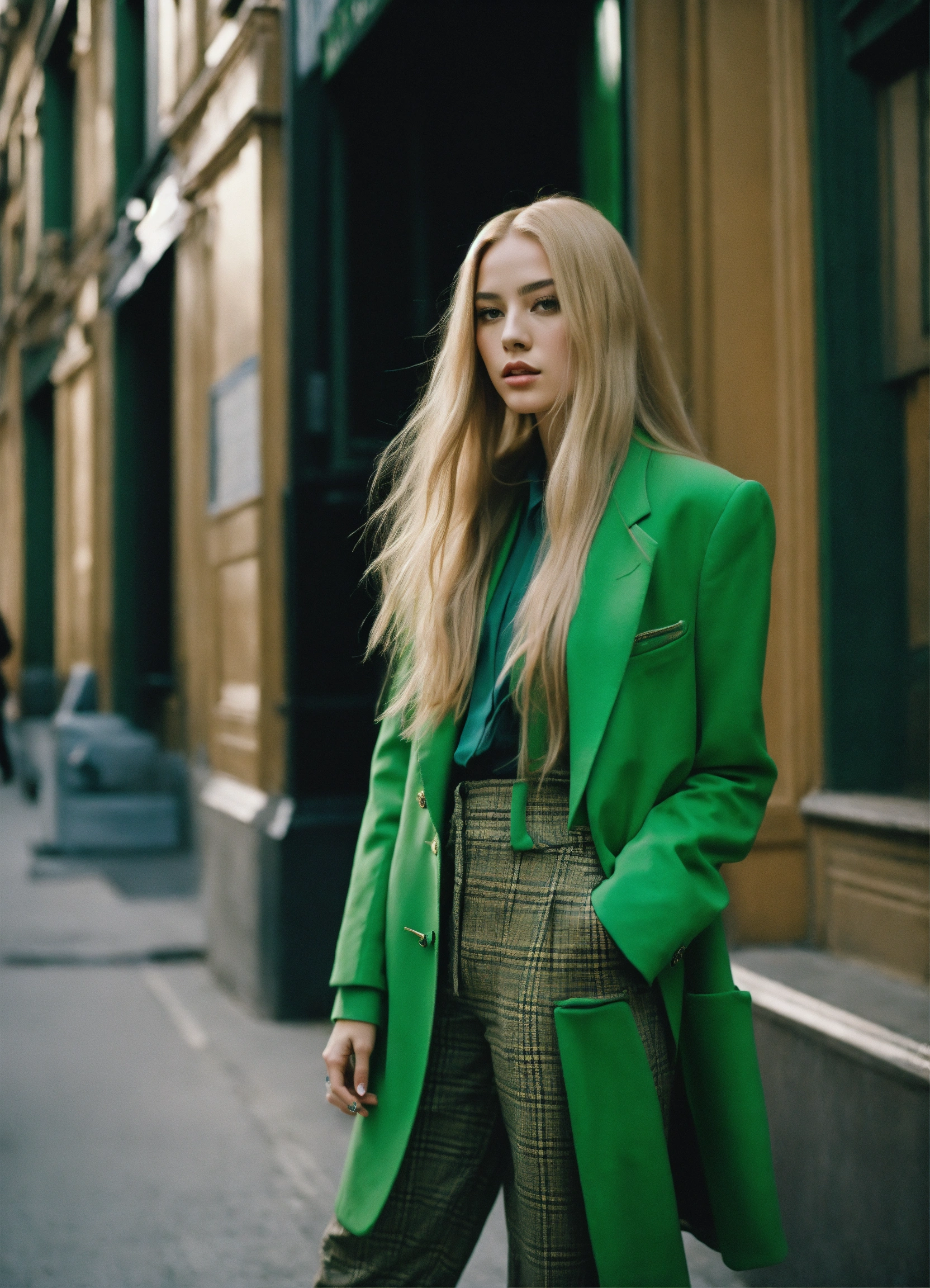 Meaningful surreal tumblr amateur balenciaga's street fashion photoshoot of a beautiful dark fantasy blonde girl gangster with long hair, wearing a green long blazer, checkered pants, loubouton, photo shoot, cinematic still shot, magazine photography, 35mm, film look