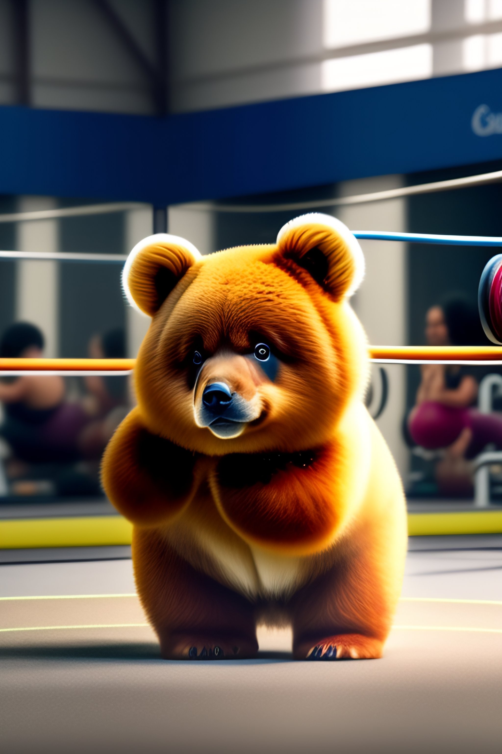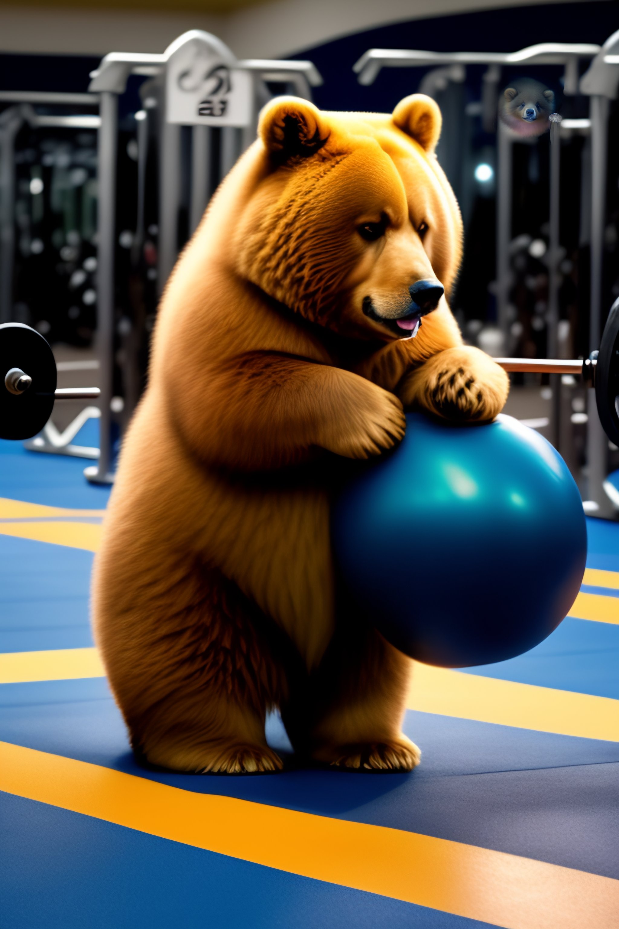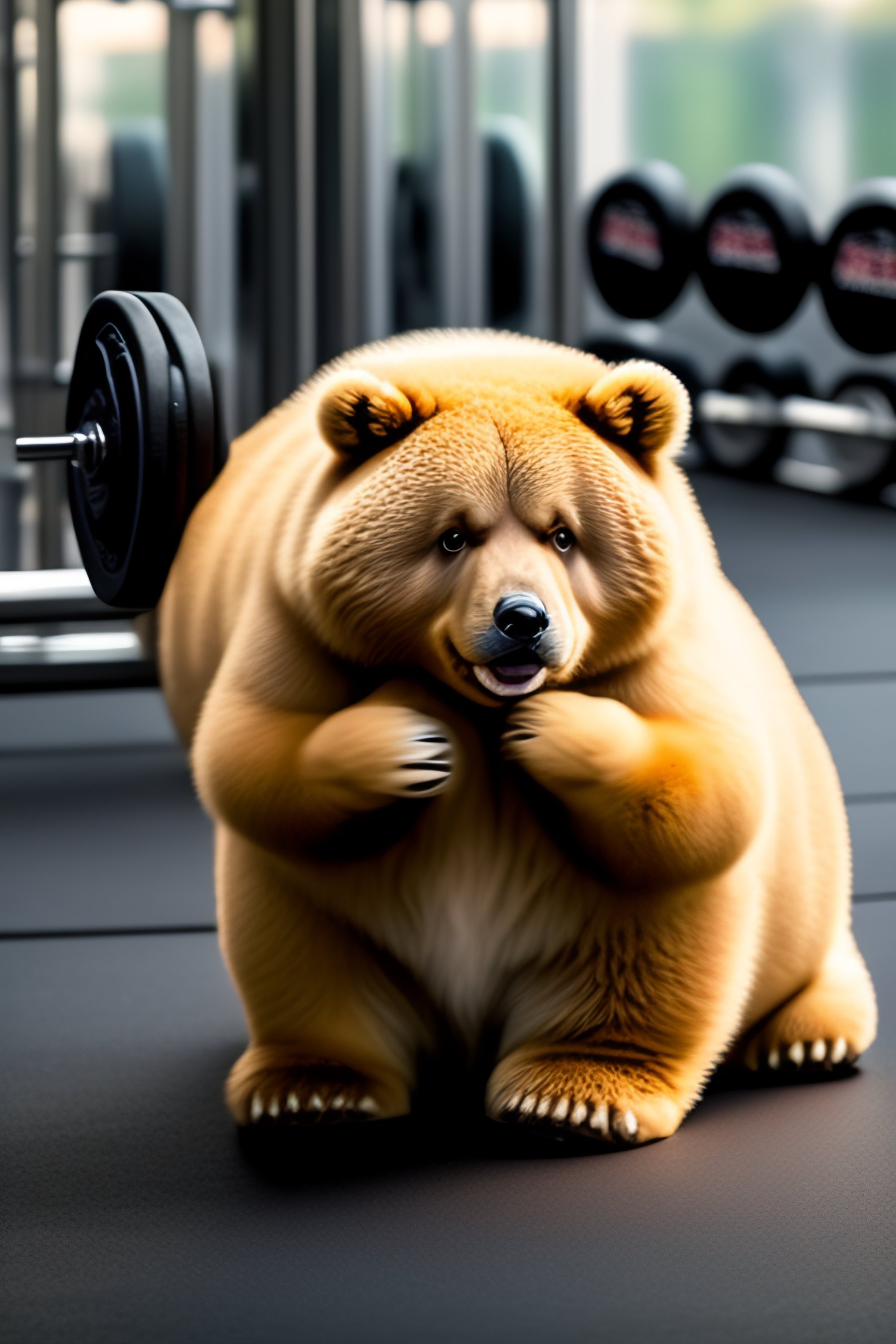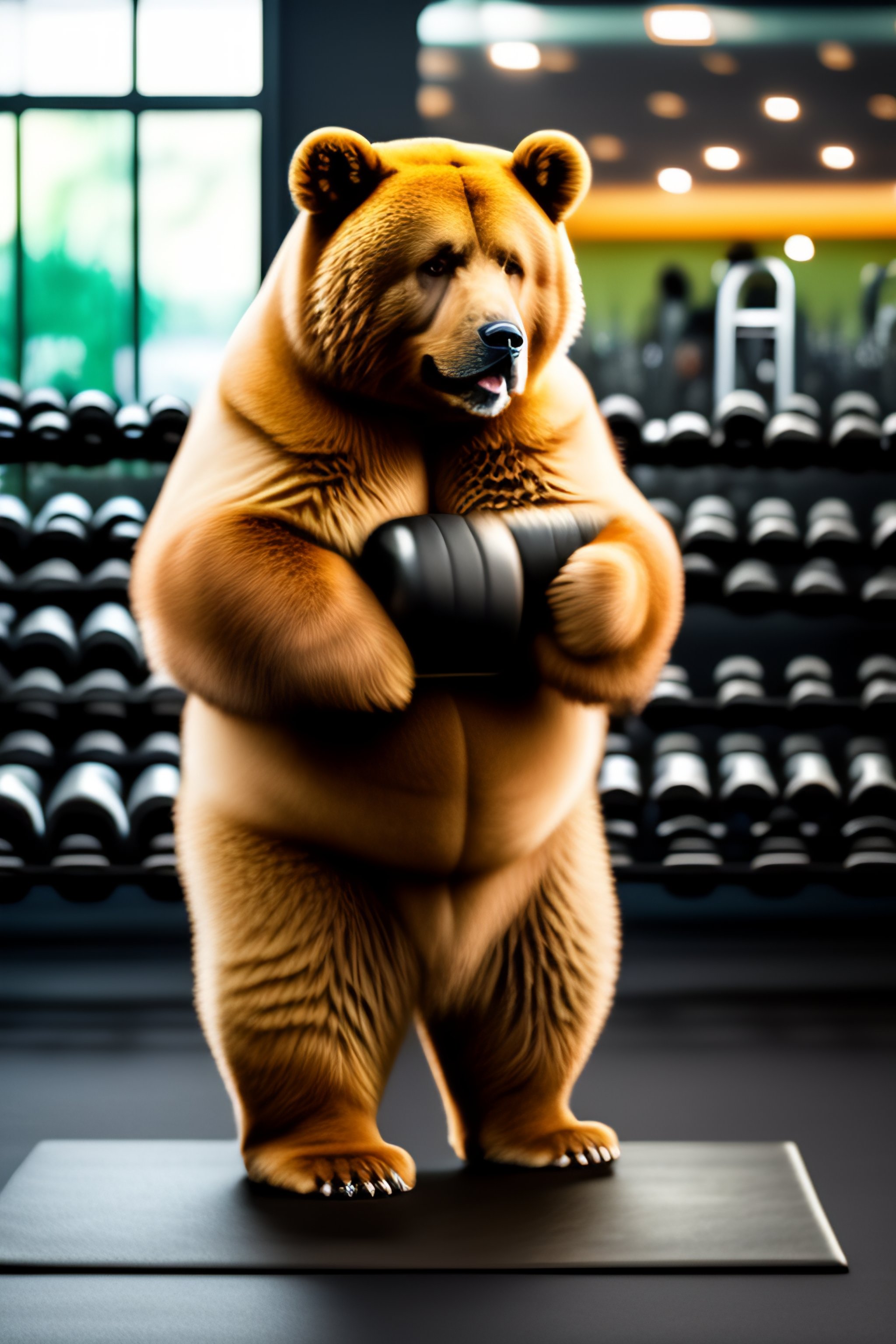 Fotografía publicitaria de un oso rugiendo levantando pesas en un gym