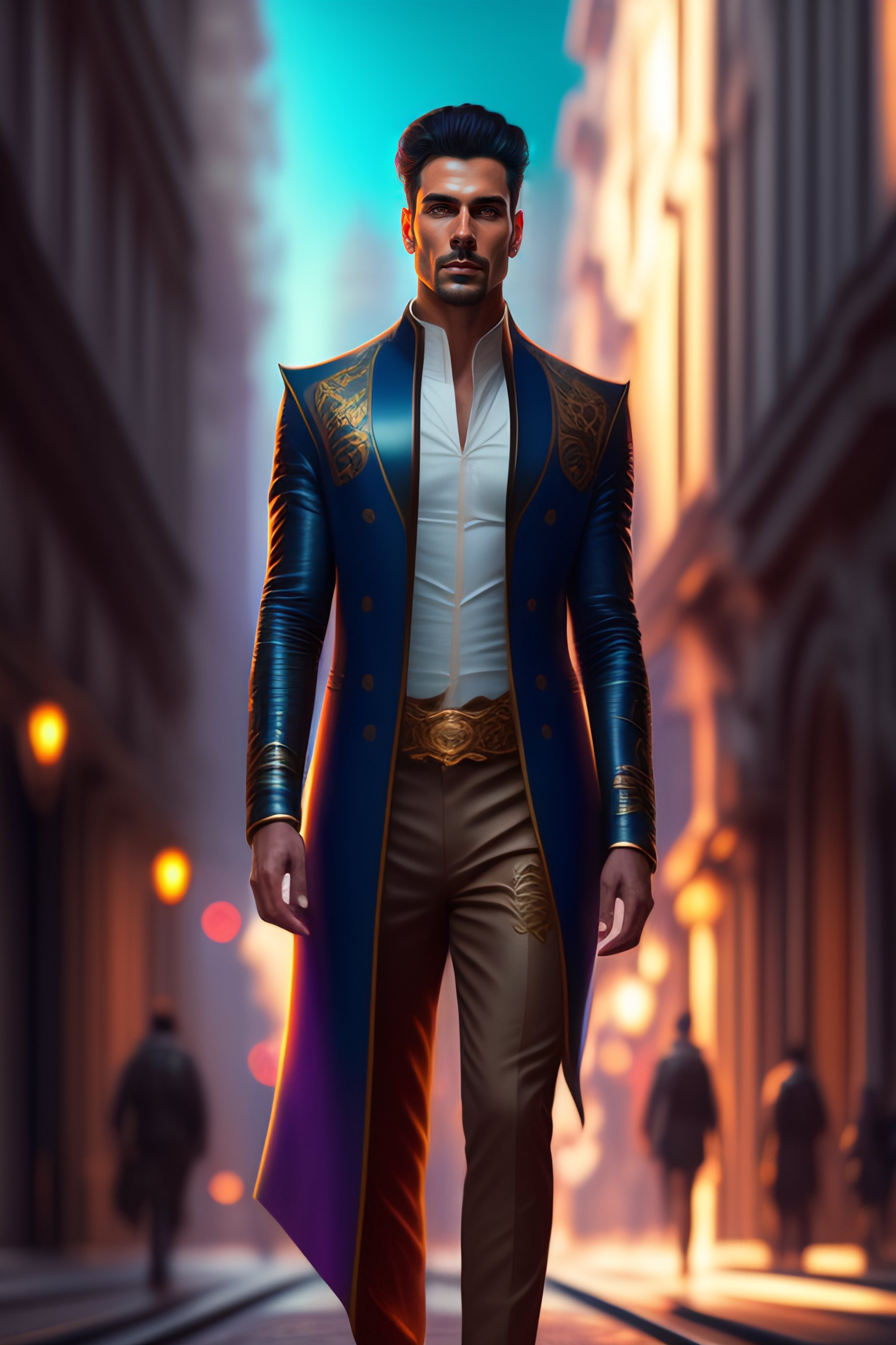 Full length shot of handsome dark haired male standing in alien colorful city, highly detailed, digital painting, deviantart, artstation, concept art, matte, sharp focus, photo realistic, detailed face, realistic pale skin, greg rutkowski and alphonse mucha