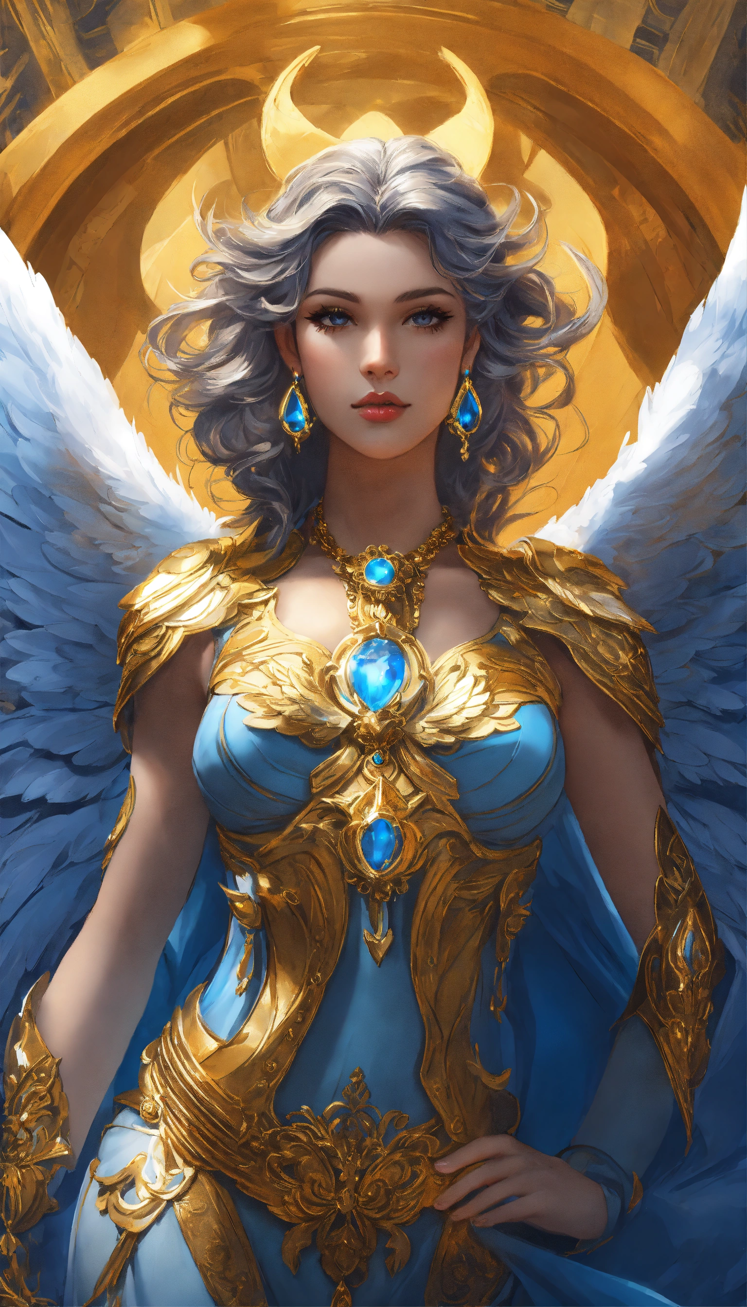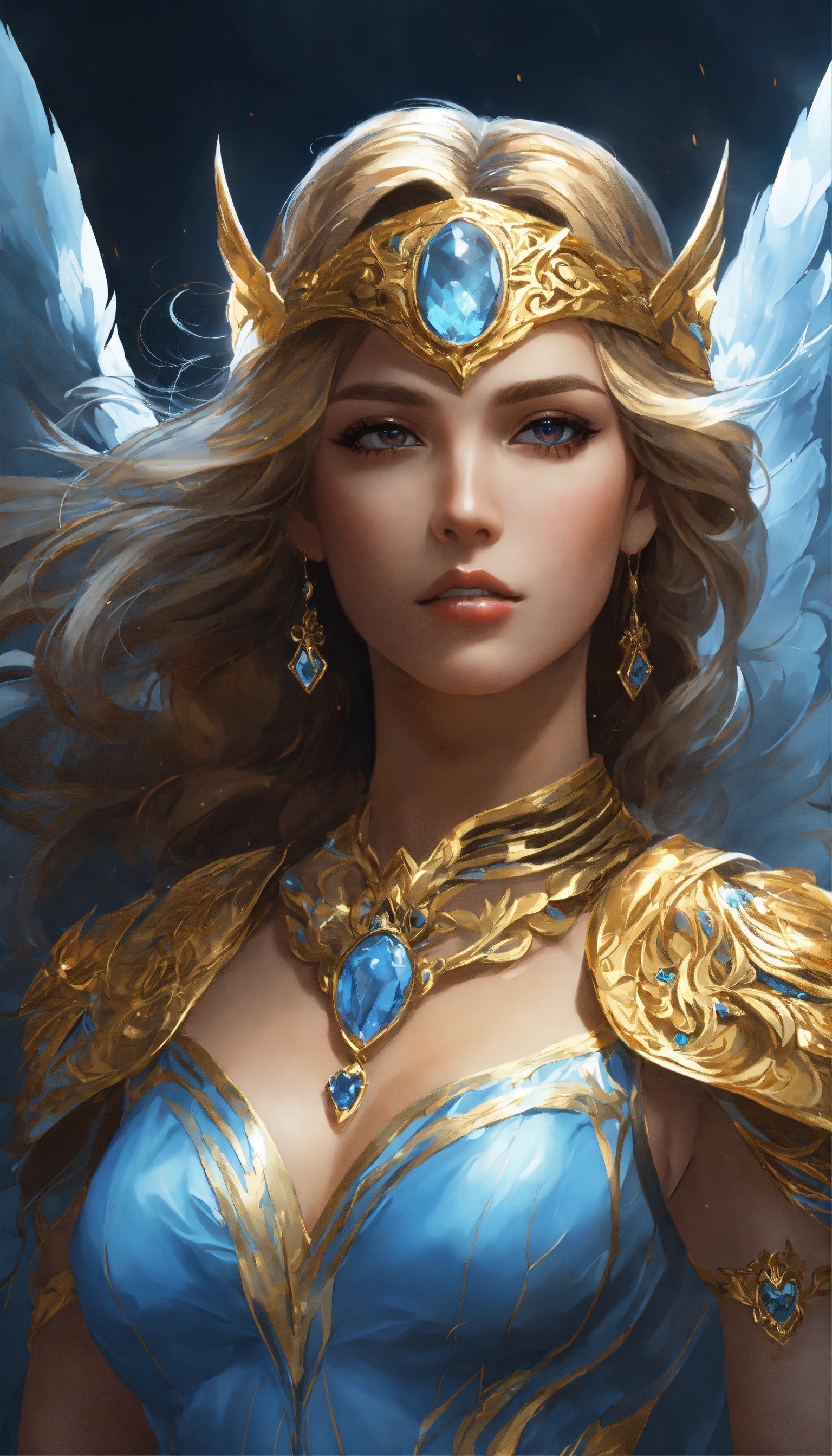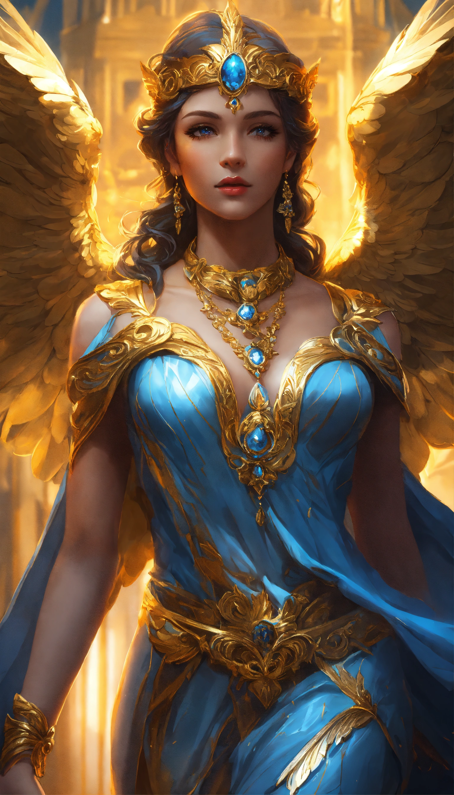 8k wallpaper of a beautiful archangel wearing gold jewelry in a cloudy blue sly, by artgerm, intricate detail, trending on artstation, 8k, fluid motion, stunning shading