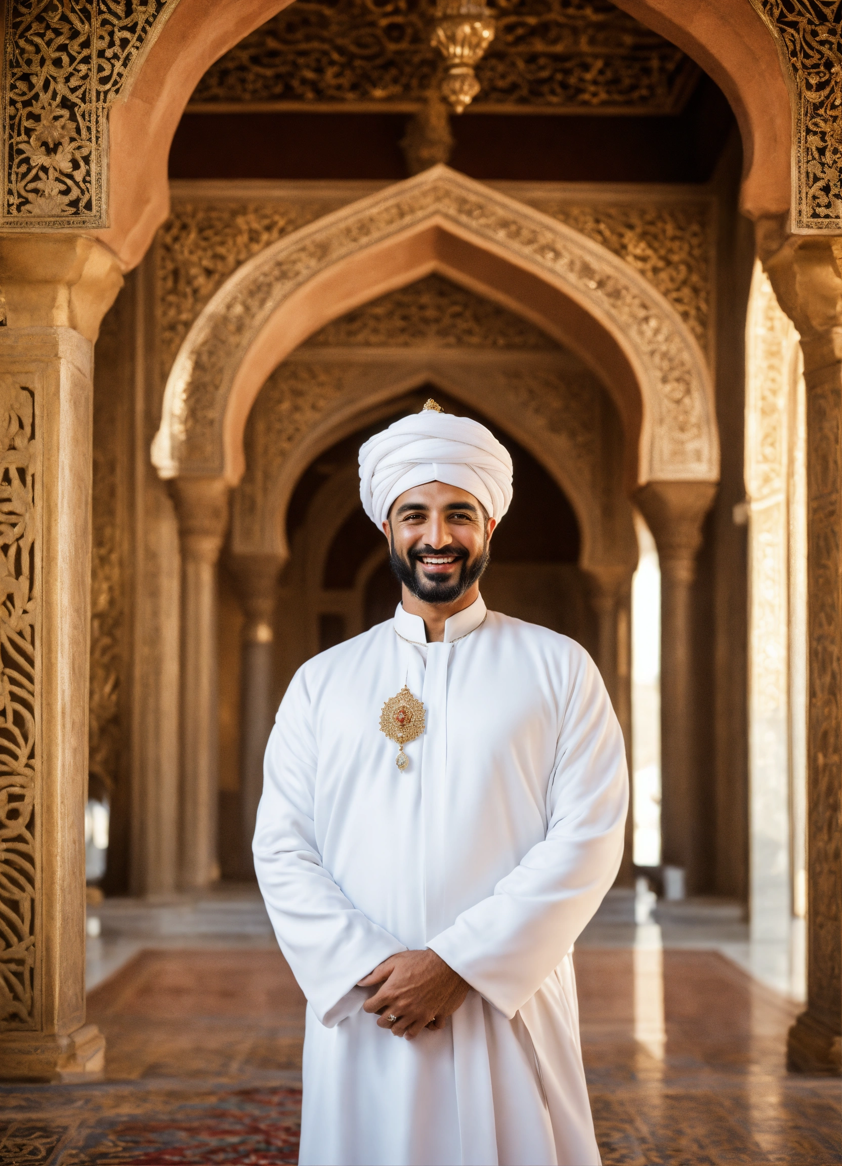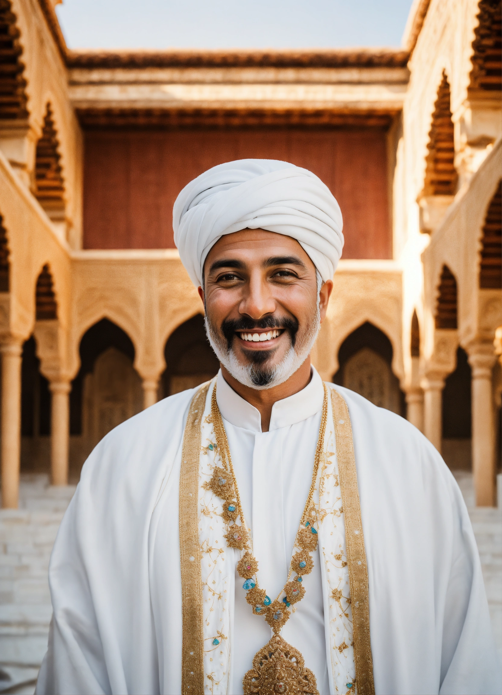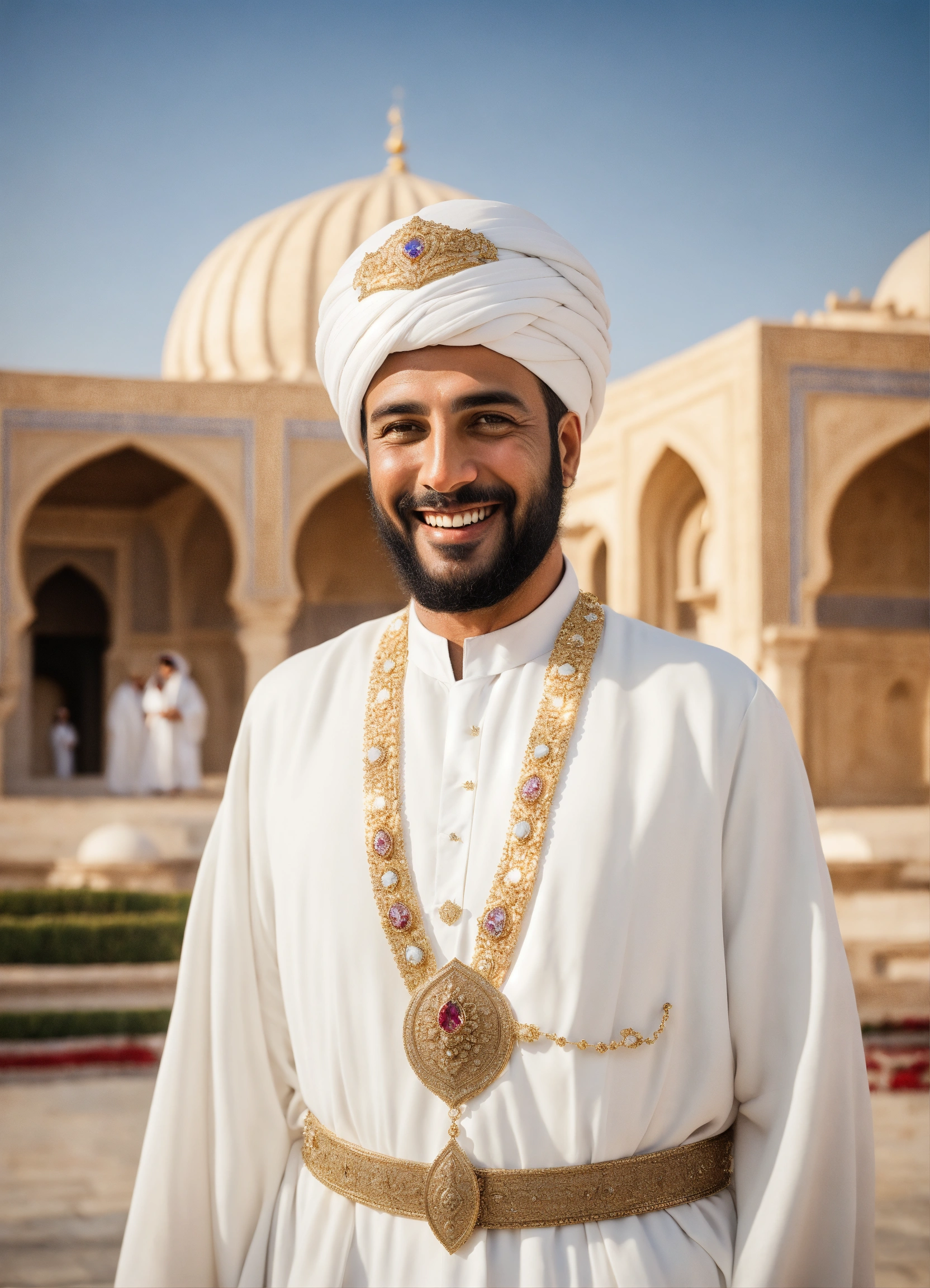 55 year old happy handsome arabian king, smiling, wearing clean white robes and jeweled turban, looking directly into camera, background is persian architecture, photoshoot by albi