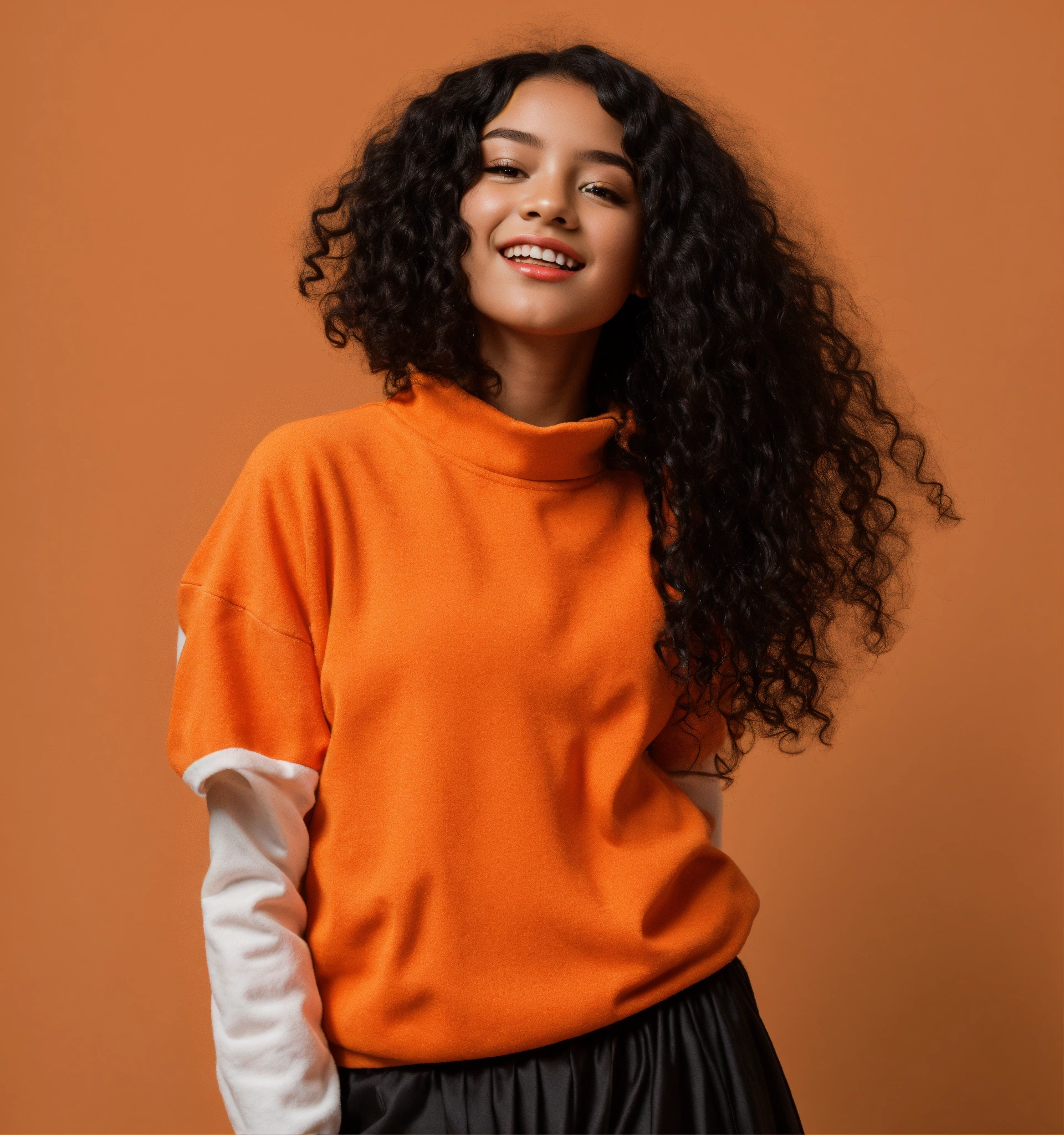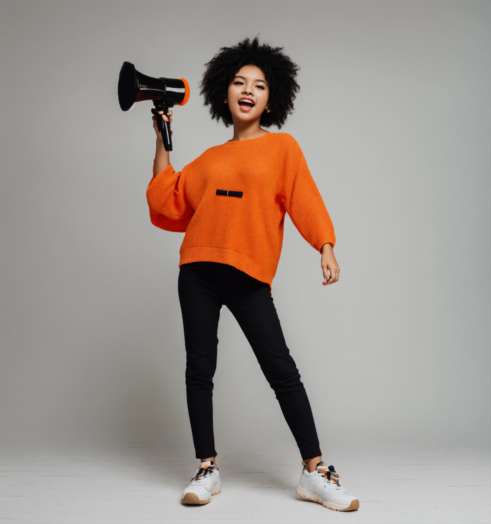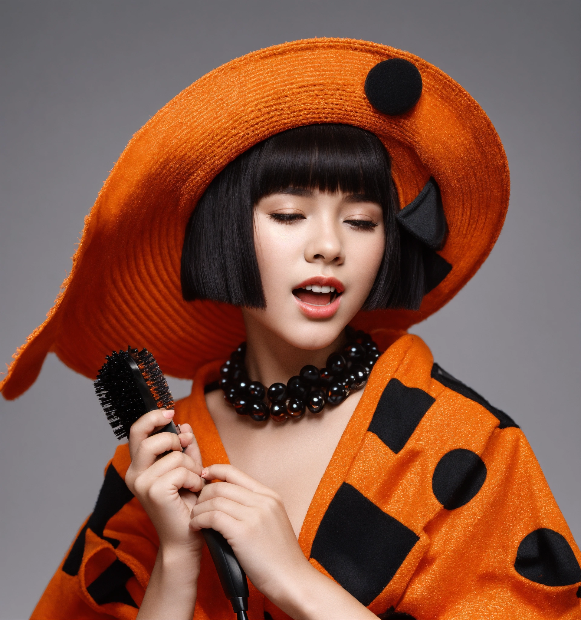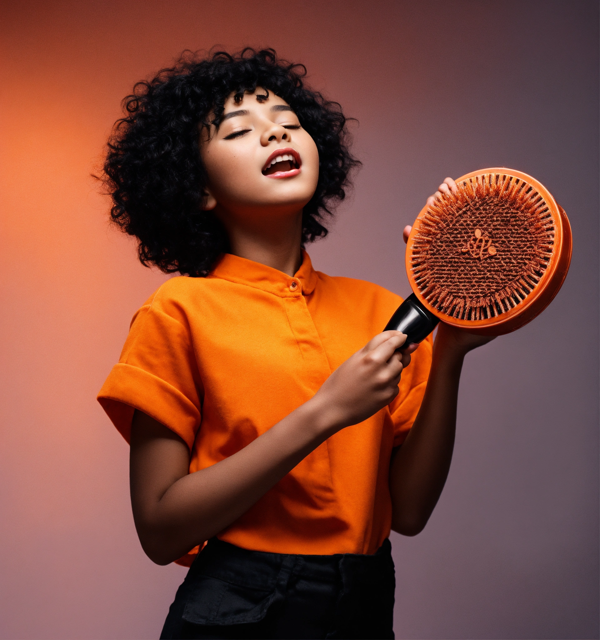 A young girl singing in a black hairbrush standing in orange and black clothes on a white background